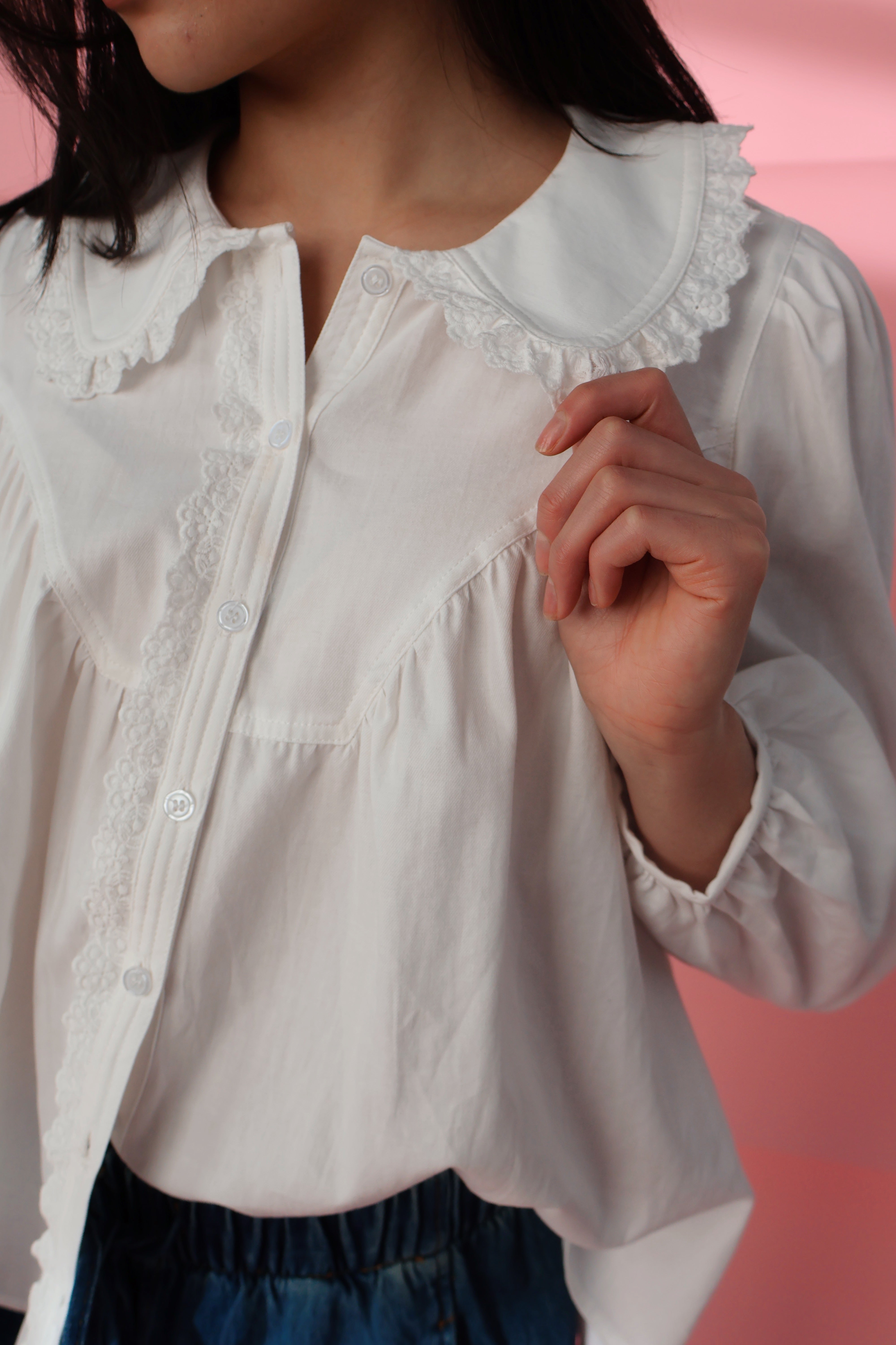 Main details: Lace trim white button down blouse. Nursing friendly