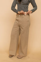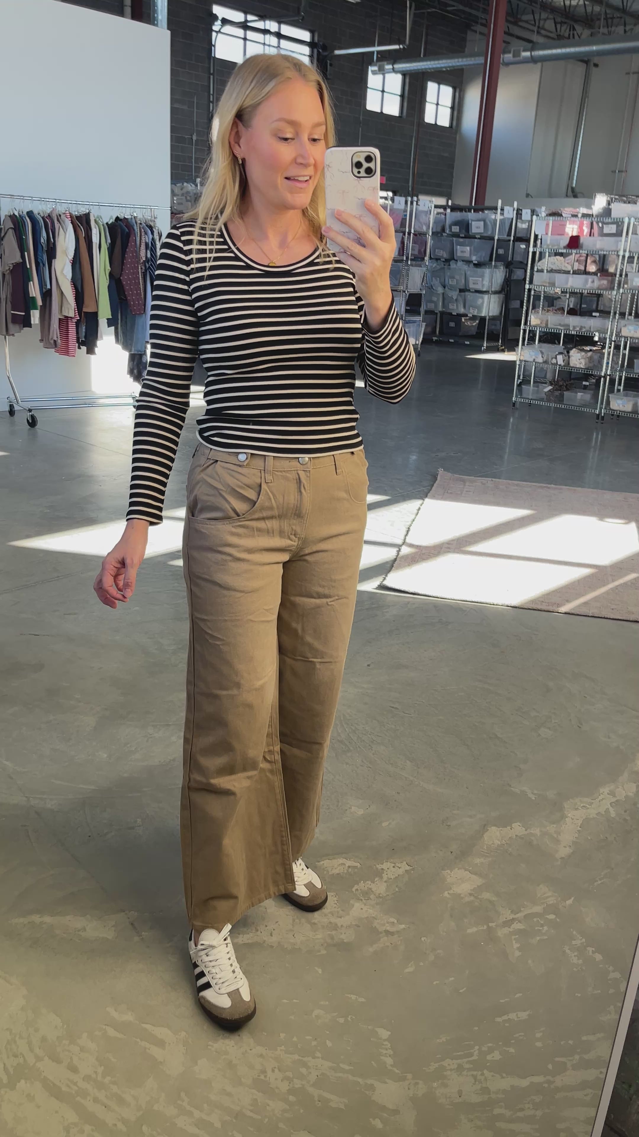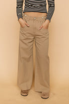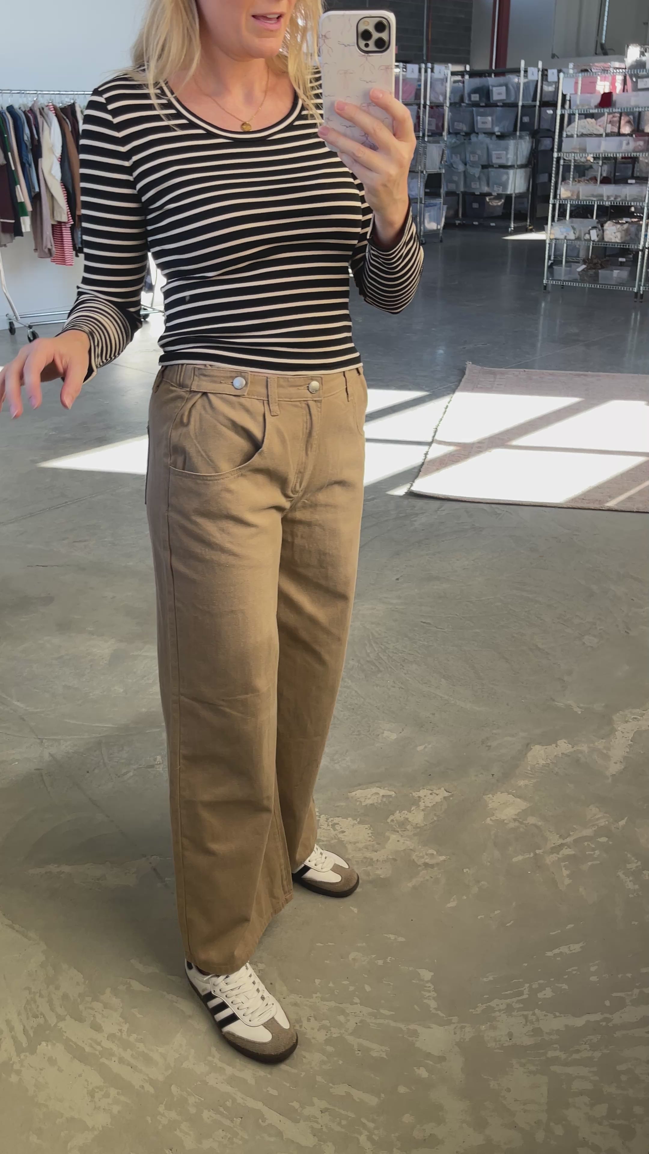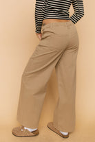 Details: Soft khaki wide leg pants with adjustable waistband. Elastic across back. Zipper fly front. Functional pockets