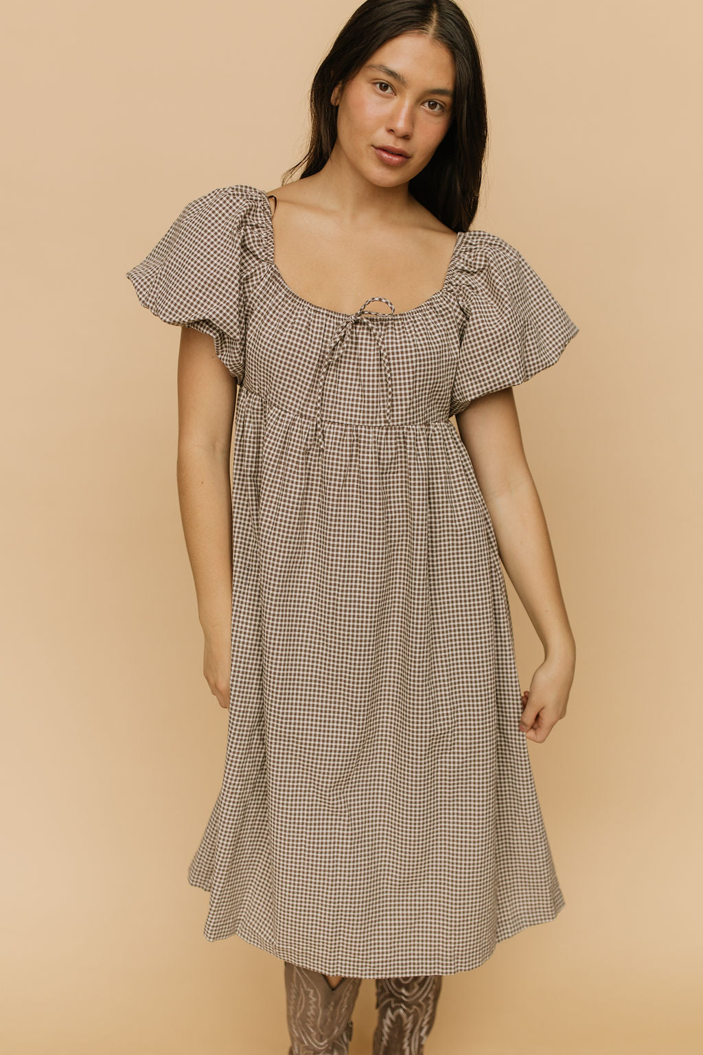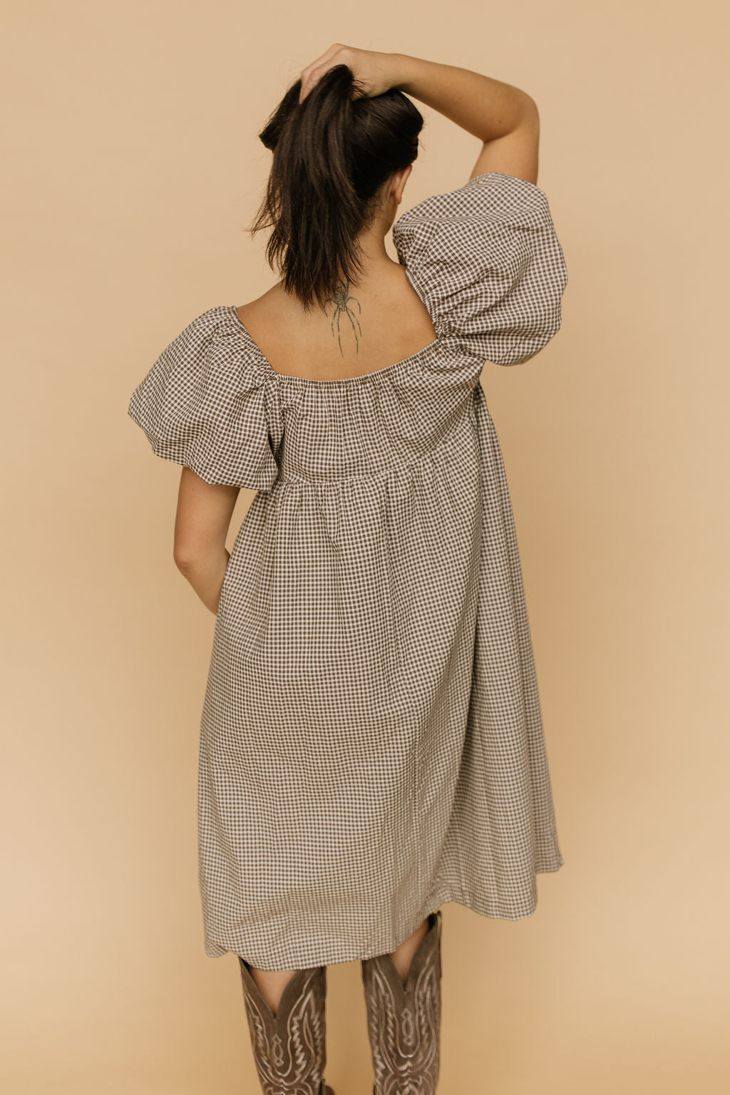 Details: Brown & cream gingham dress. Elastic neckline with tie, nursing friendly. Lined. Puff soft elastic sleeve. Bump friendly
