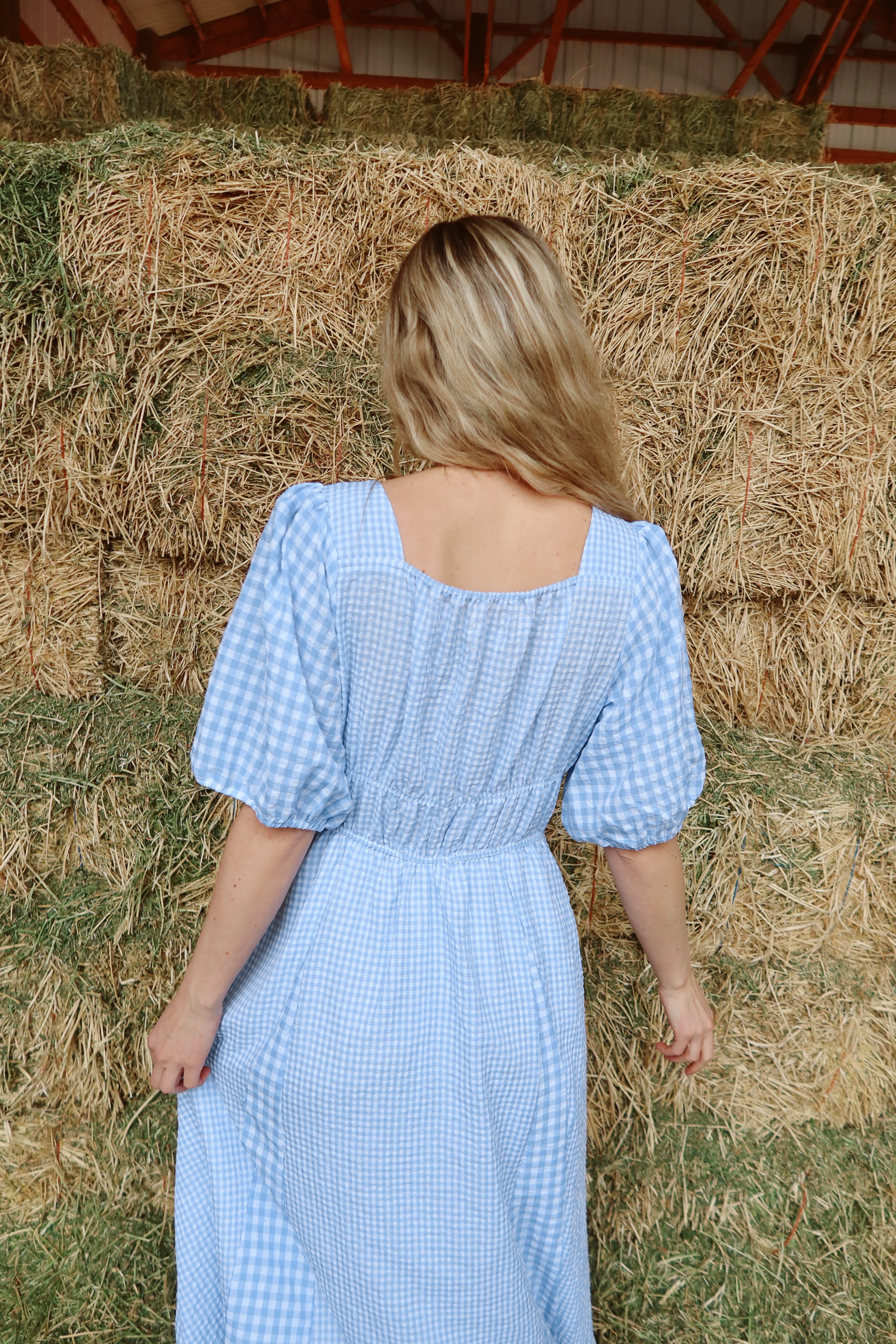 Main details: Blue gingham maxi dress with elastic sleeves and elastic across back for a little wiggle room. No stretch in front. Perfect for church or brunch!
