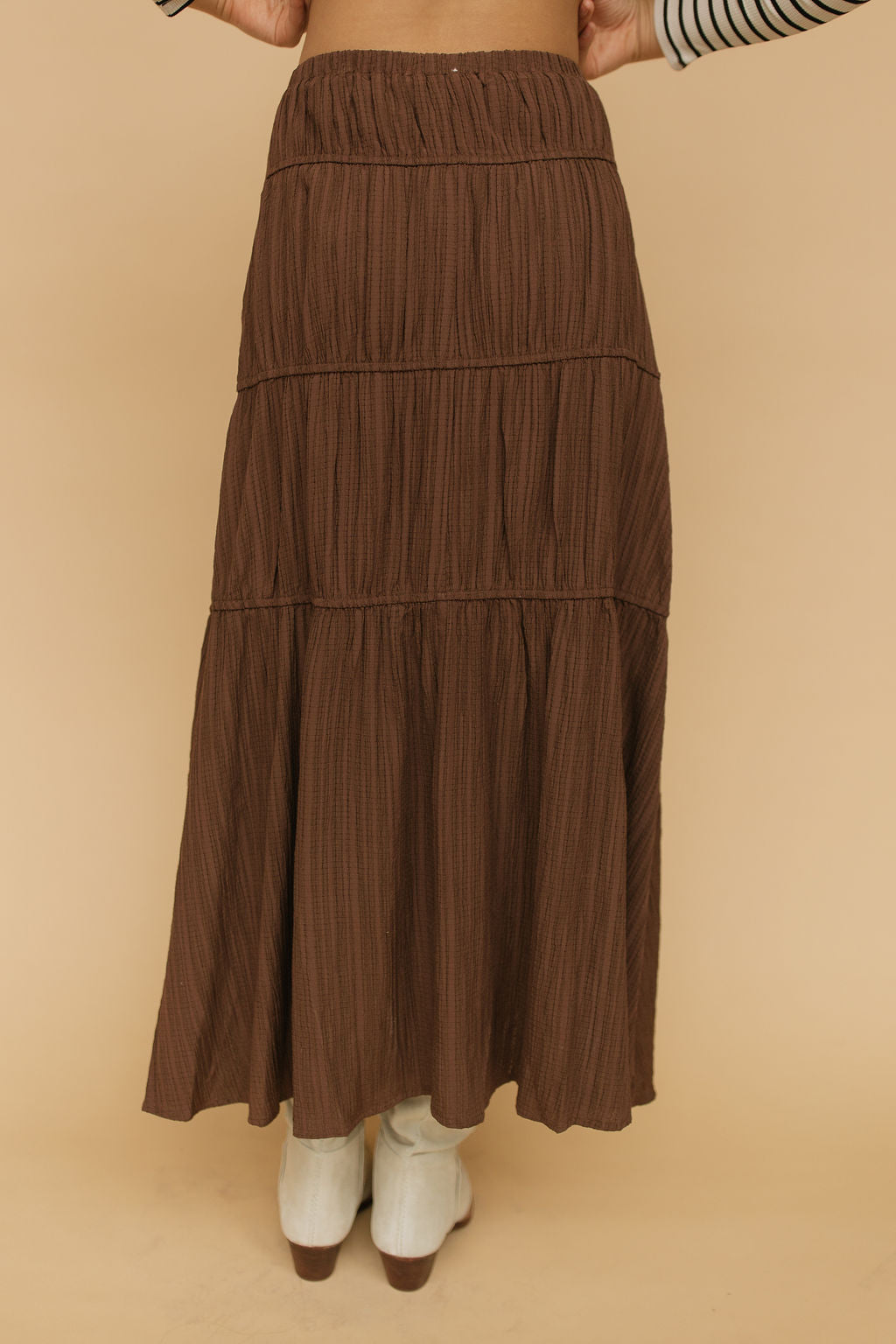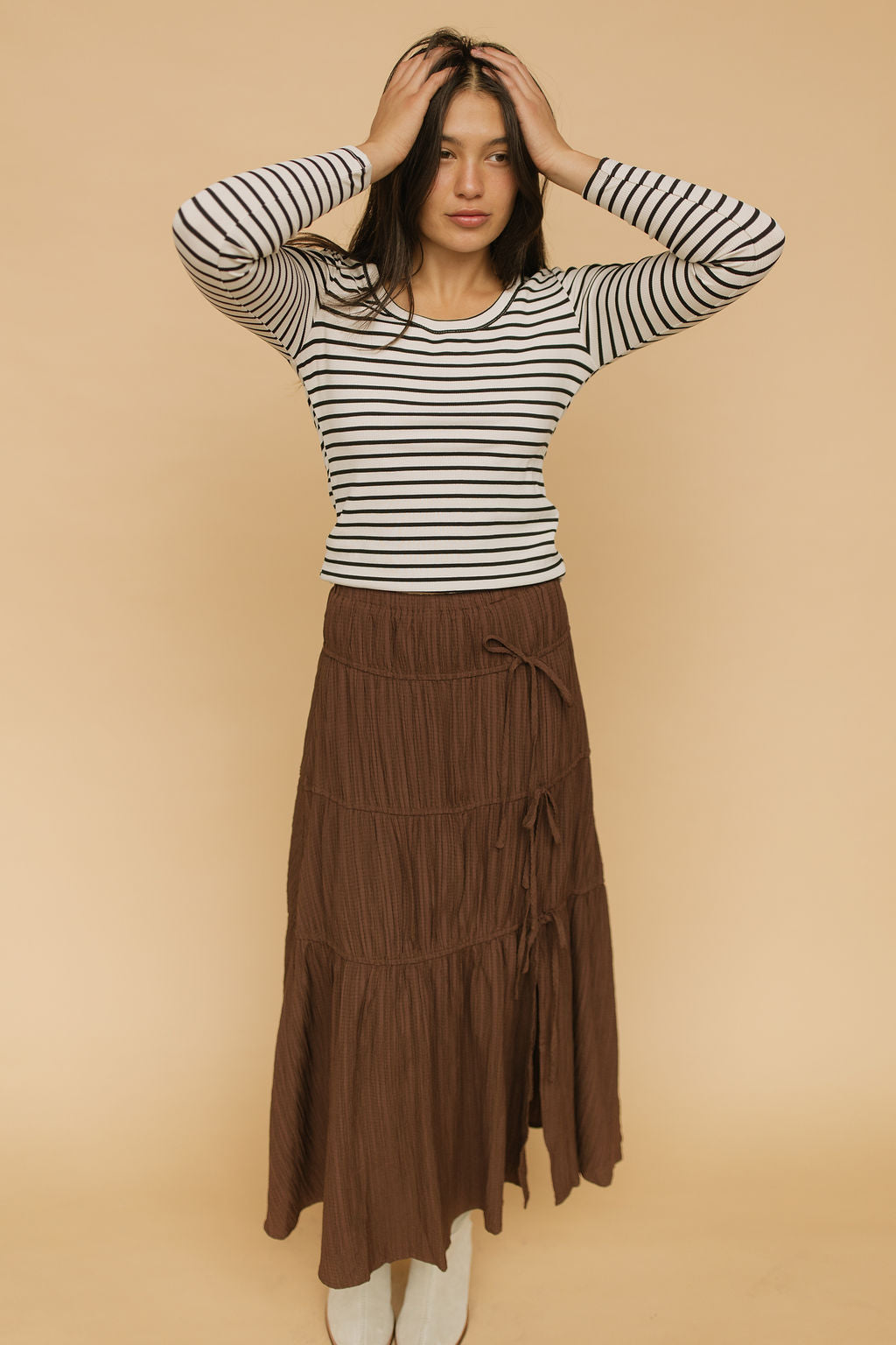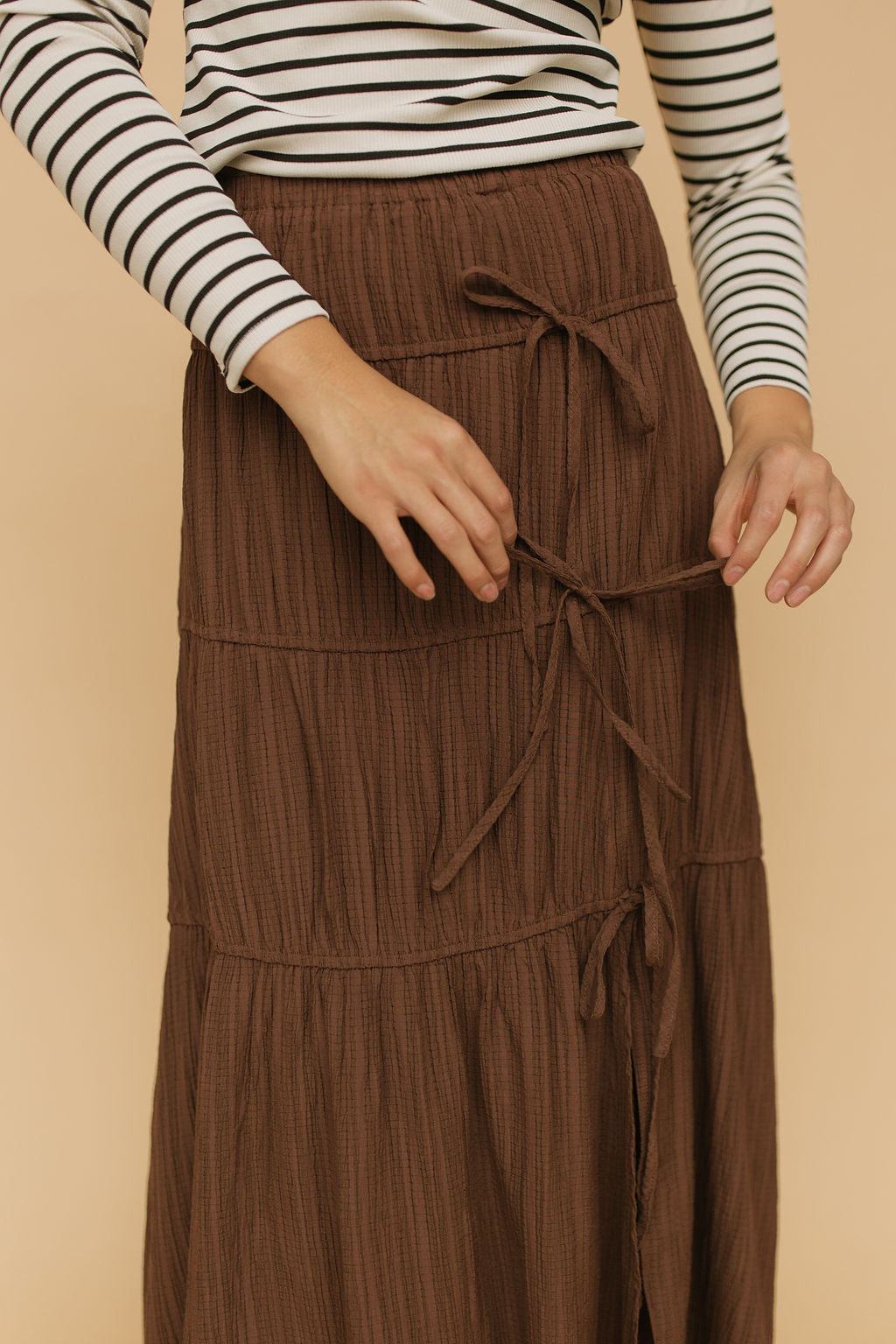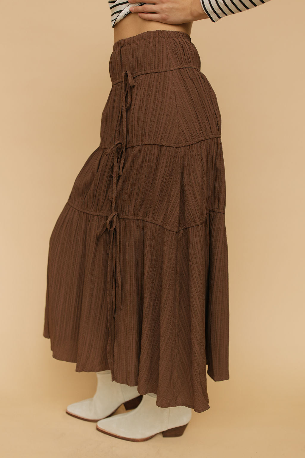 Details: Textured brown fabric with side bow ties and short slit. Elastic waistband