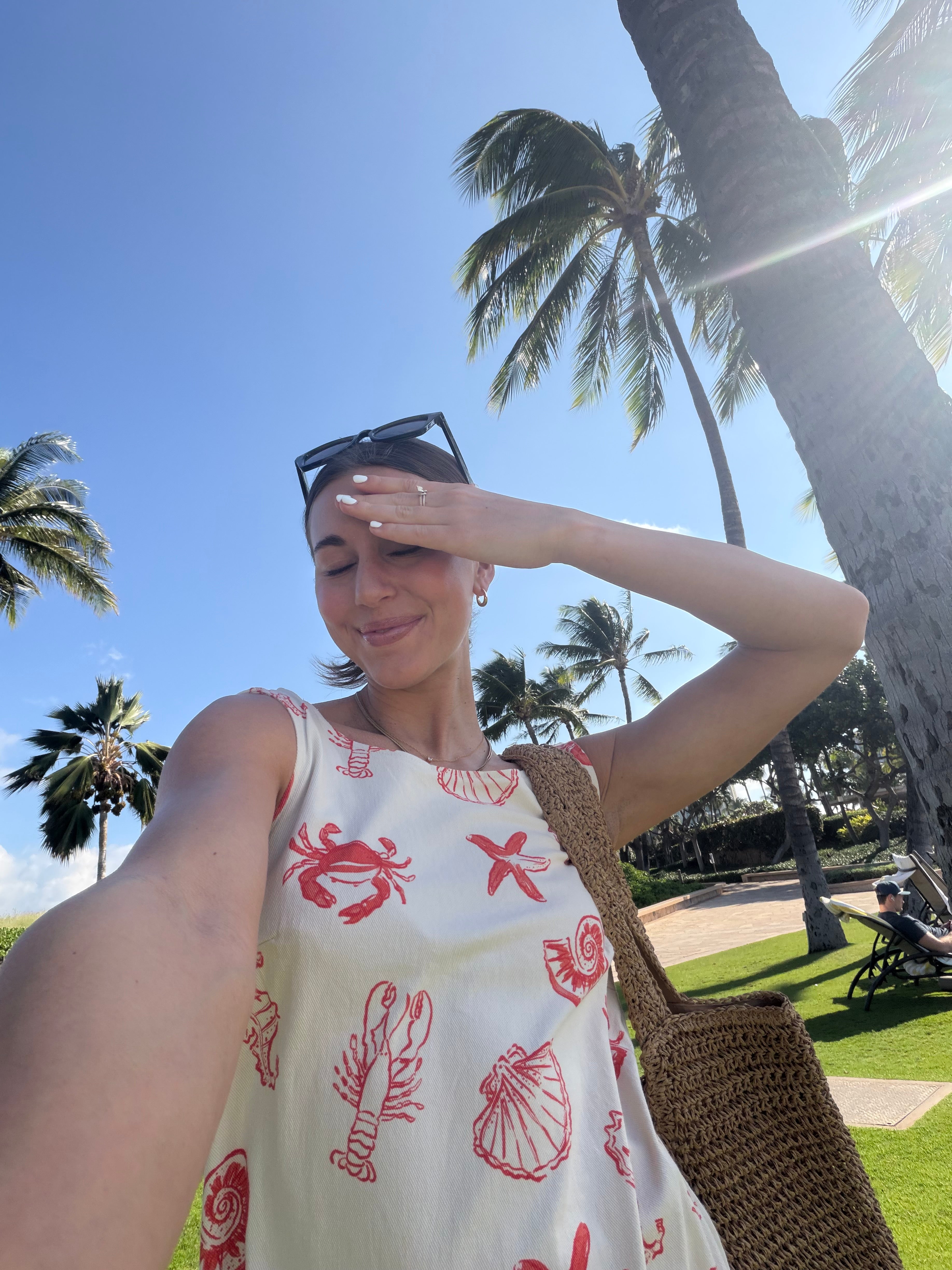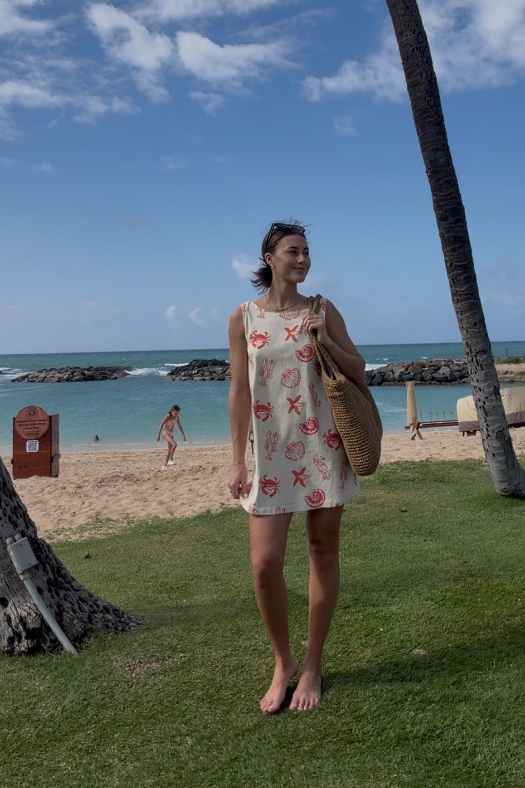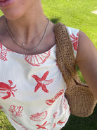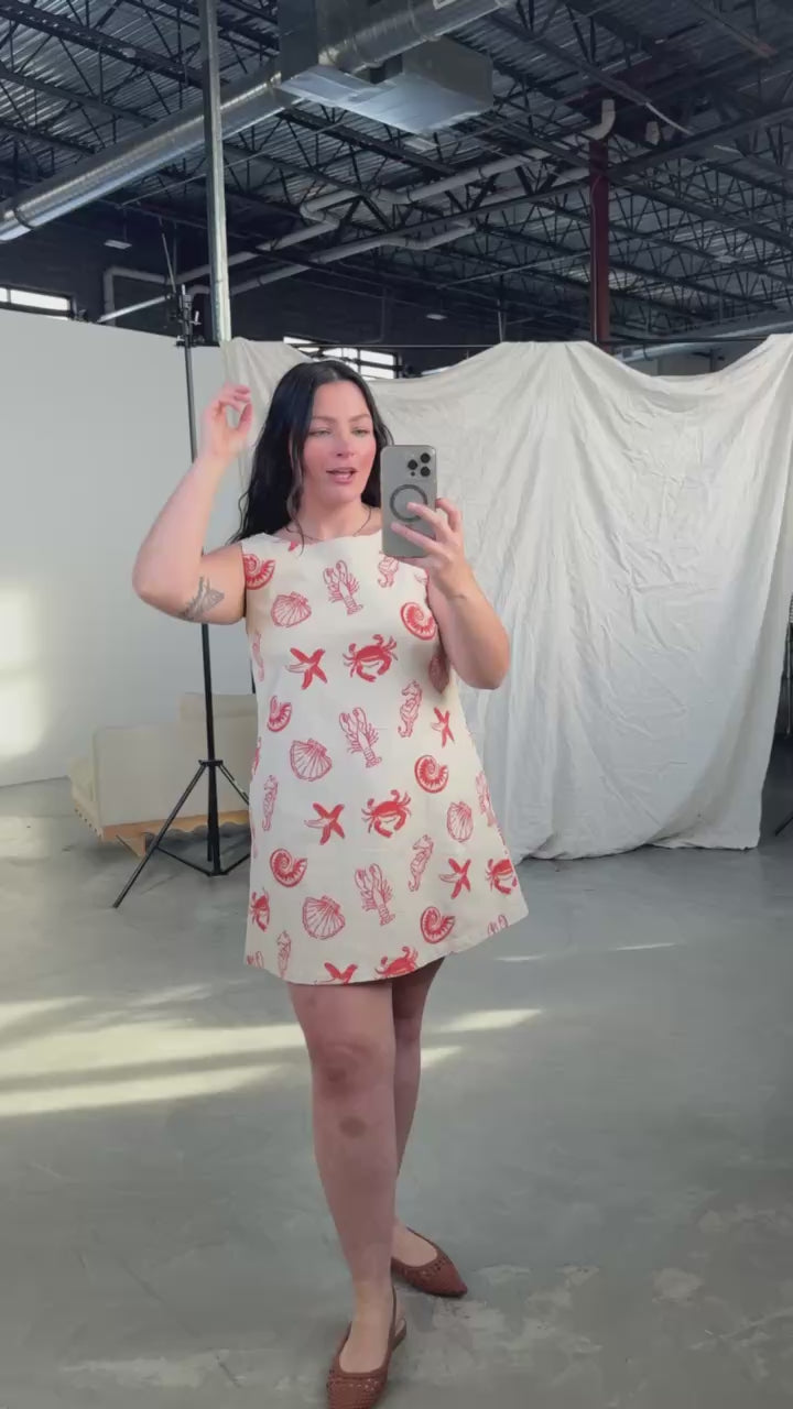 Main details: Soft stretchy light denim feel dress. Zip up back. Beautiful hand-drawn seashell print perfect for brunch, trip to the lake, beach or a vacation!
