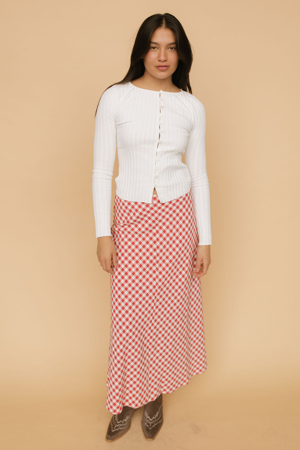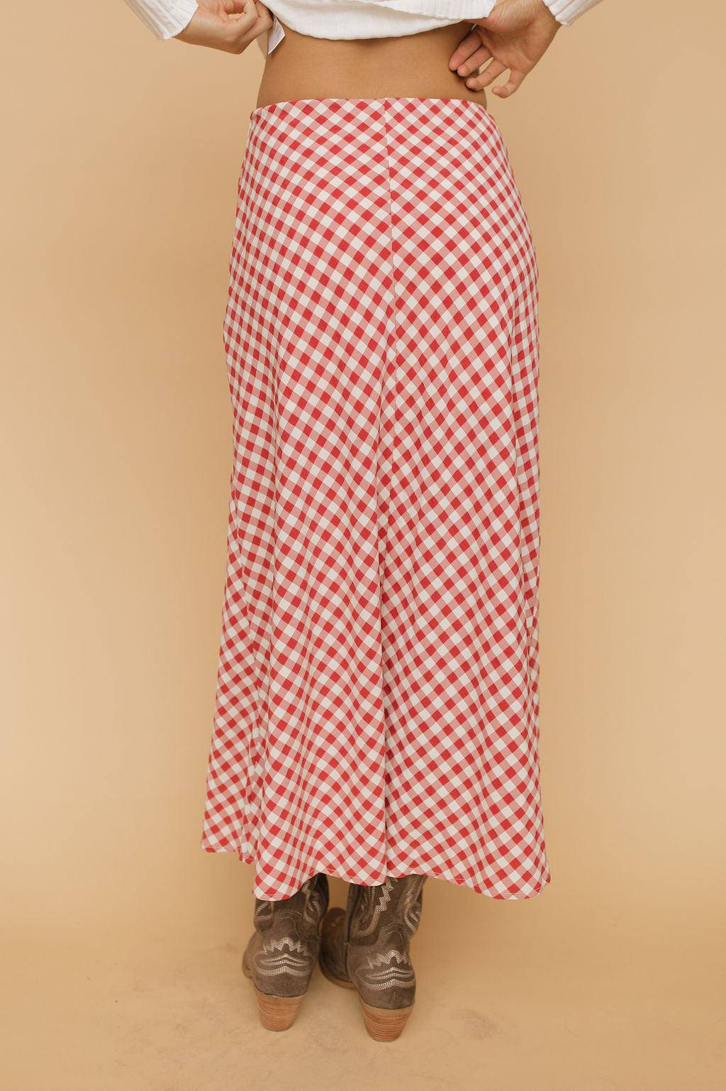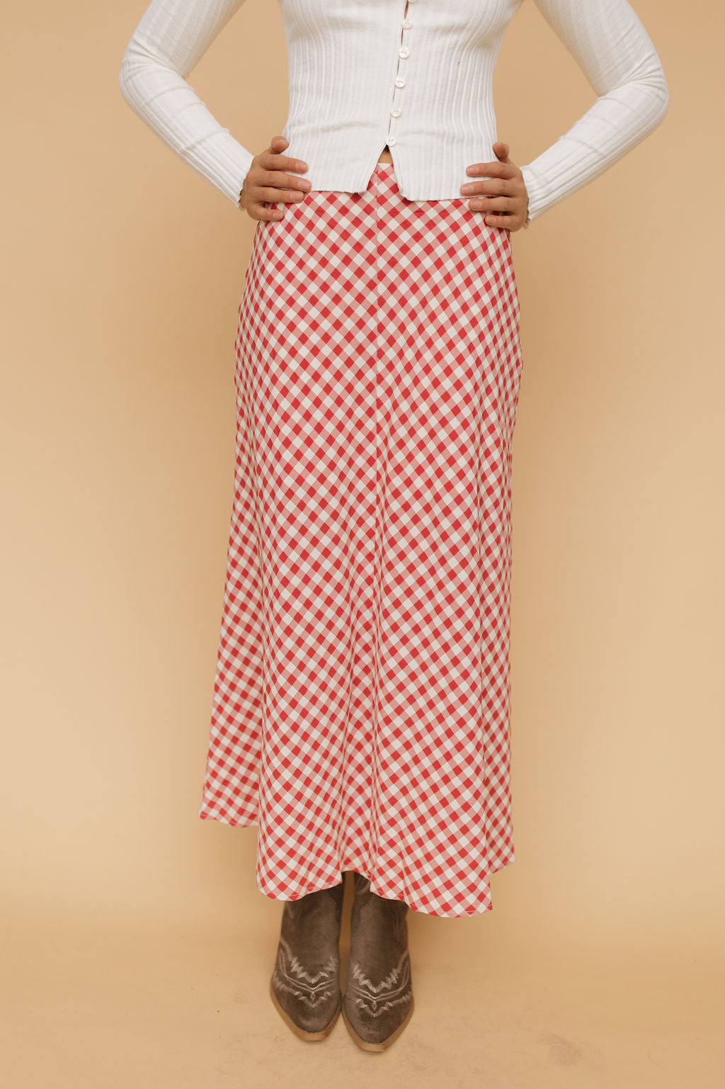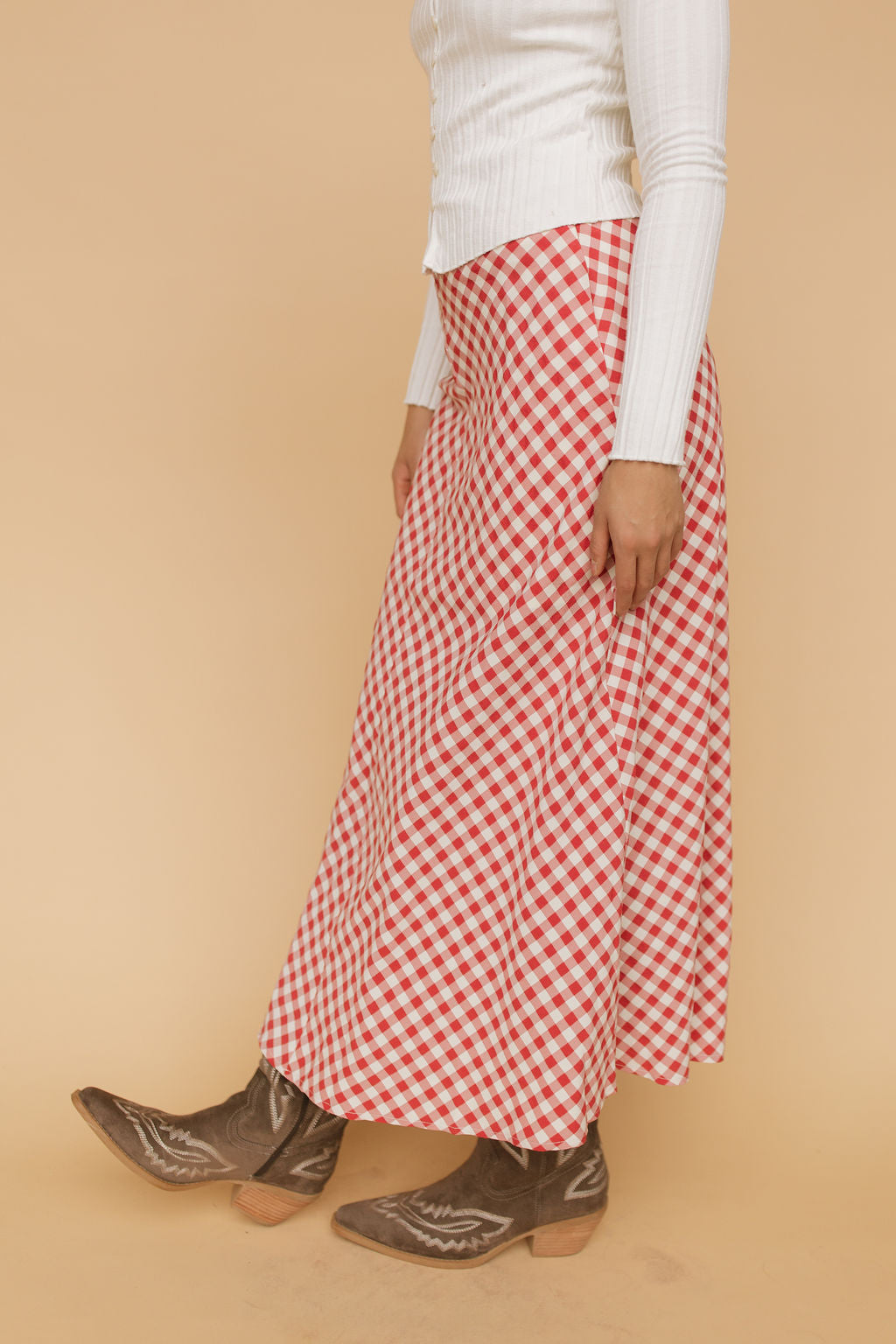 Details: Red & cream gingham slip a-line skirt with seam detail down front. Side zipper closure, not elastic in this skirt! Lined.