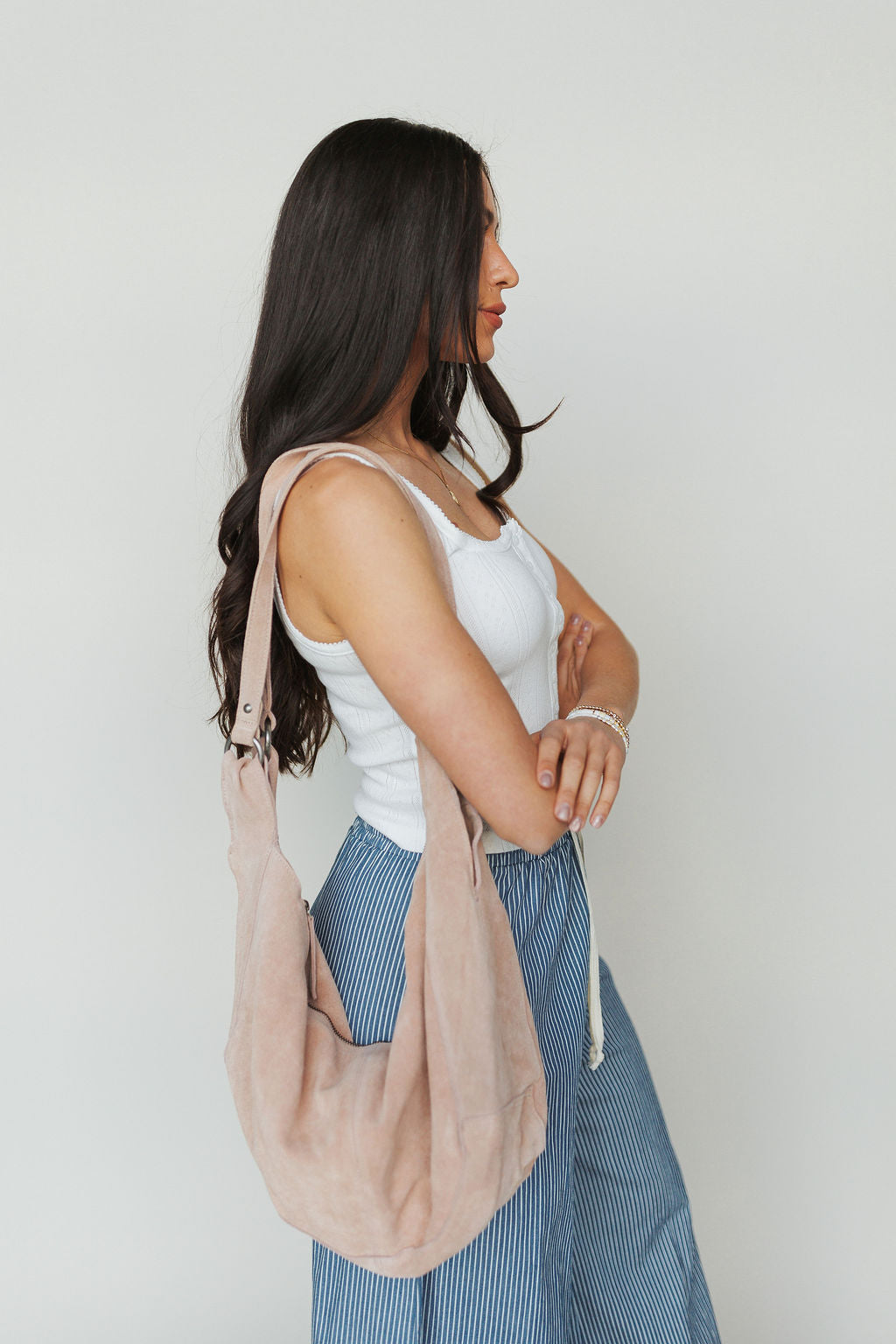 Effortlessly functional, this tote bag is featured in a slouchy hobo style with two elongated shoulder straps, all in soft suede fabrication with zipper closure for the perfect go-to bag.