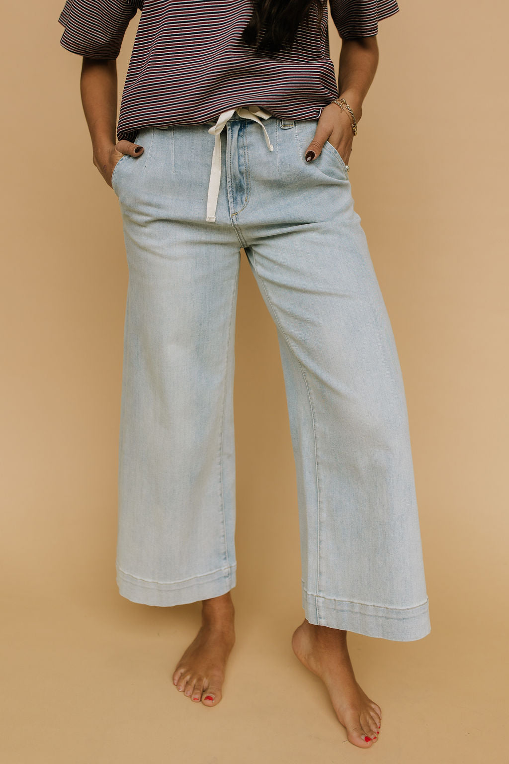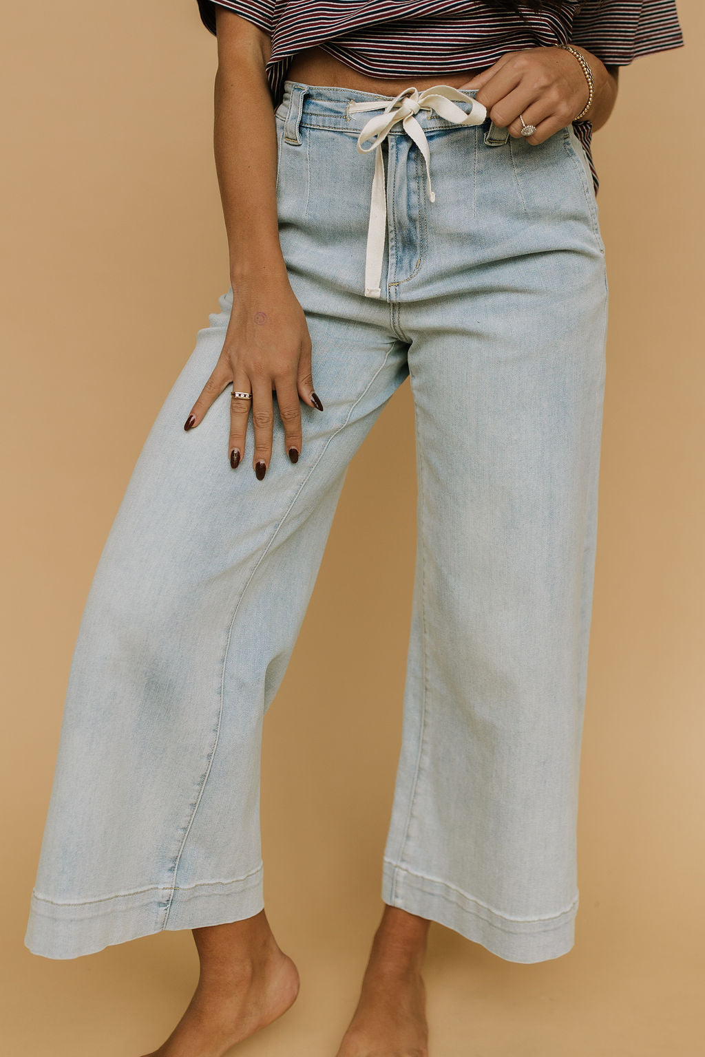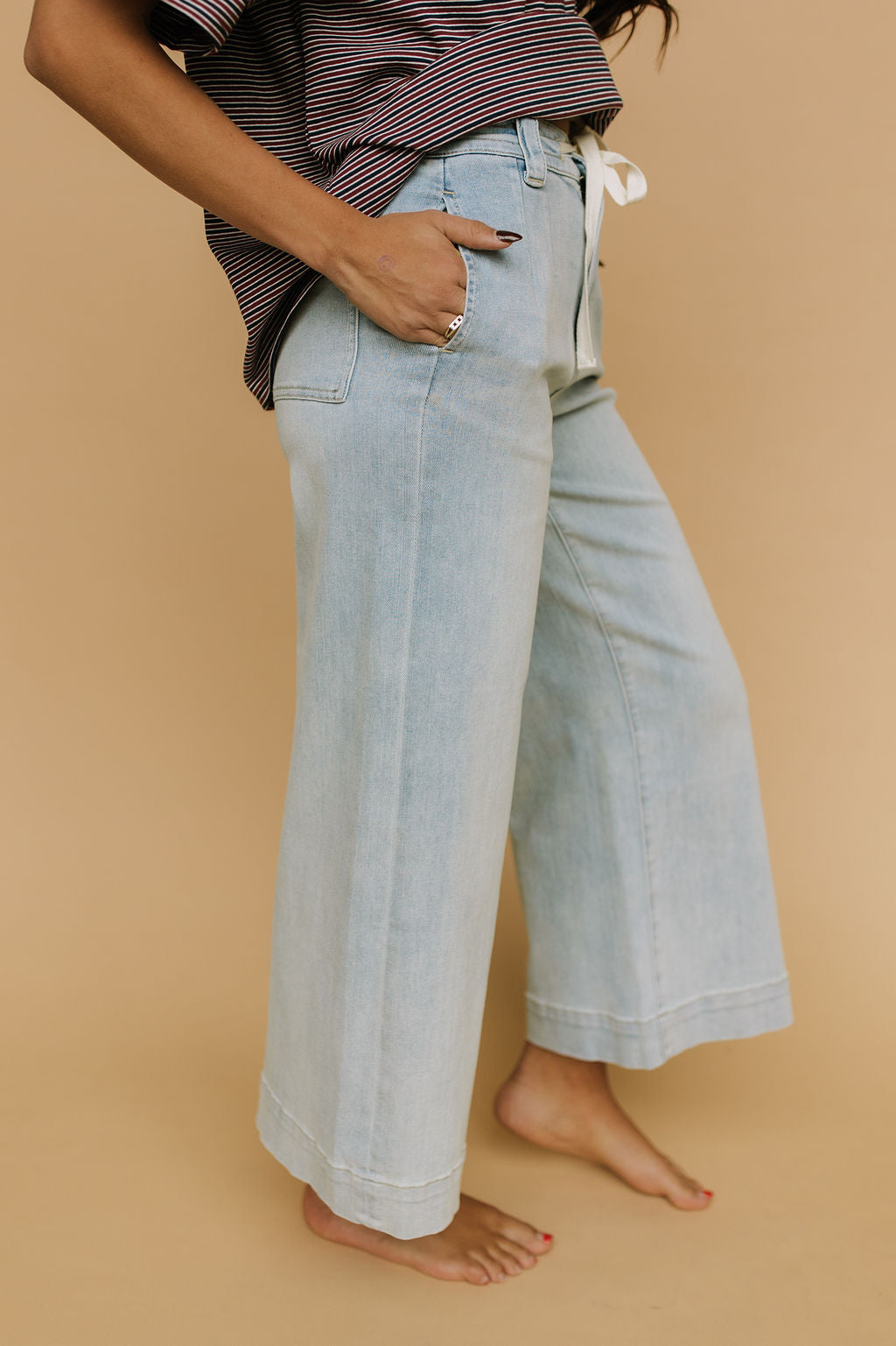 Details: Super stretchy wide leg jeans with contrast tie