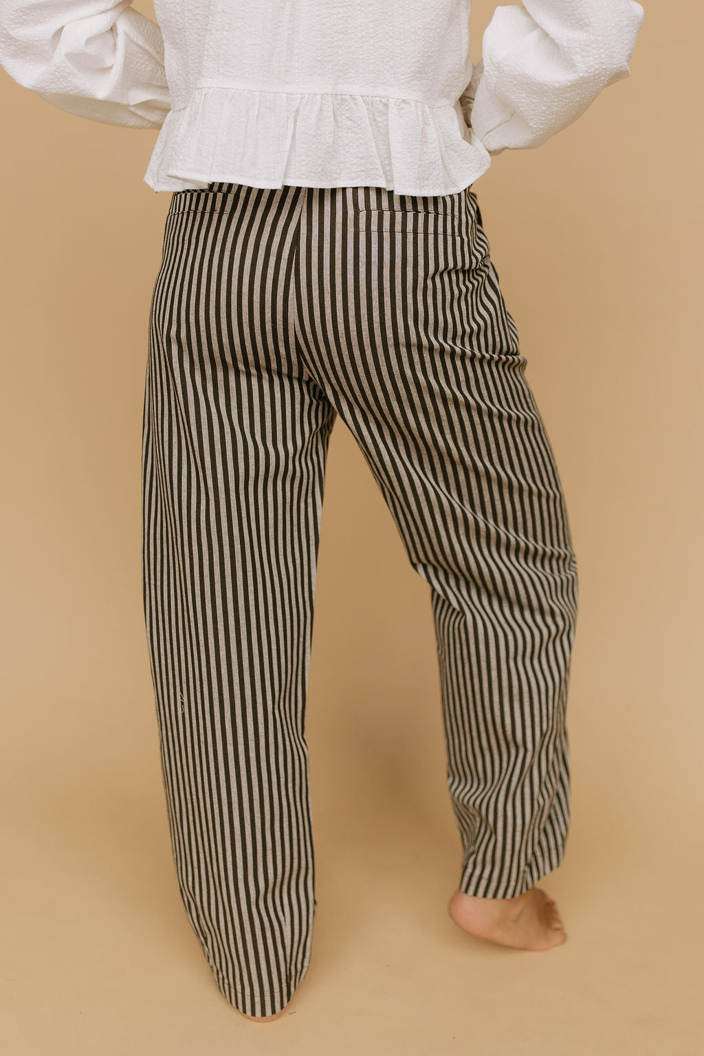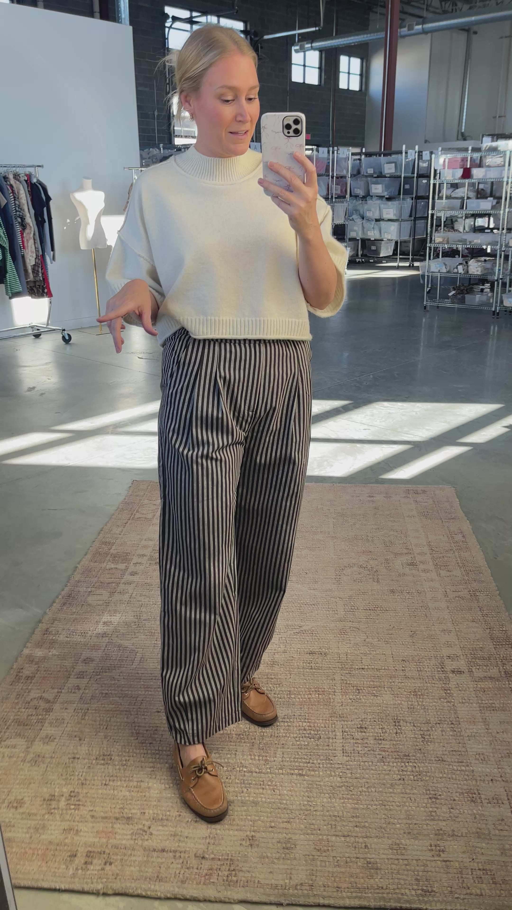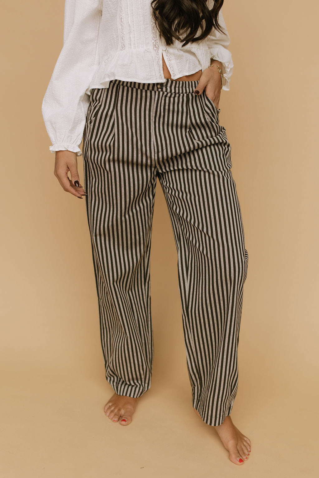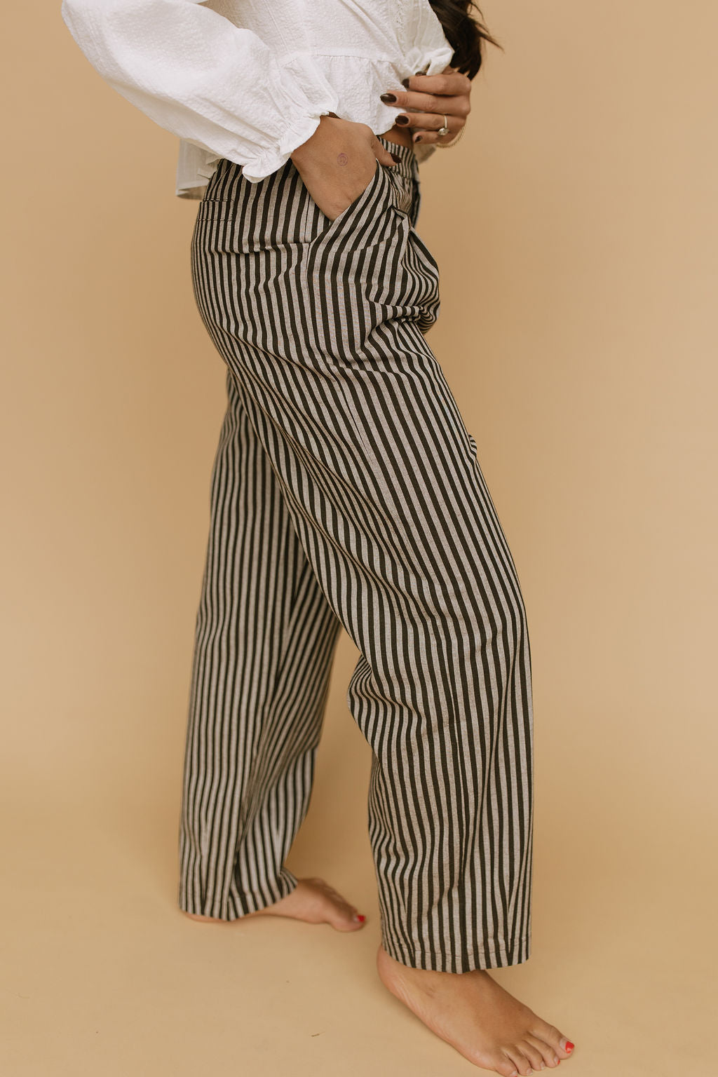 Details: Non-sheer soft lightweight stripe pants with elastic across back. Flat waistband on the front with front pleats. Side pockets