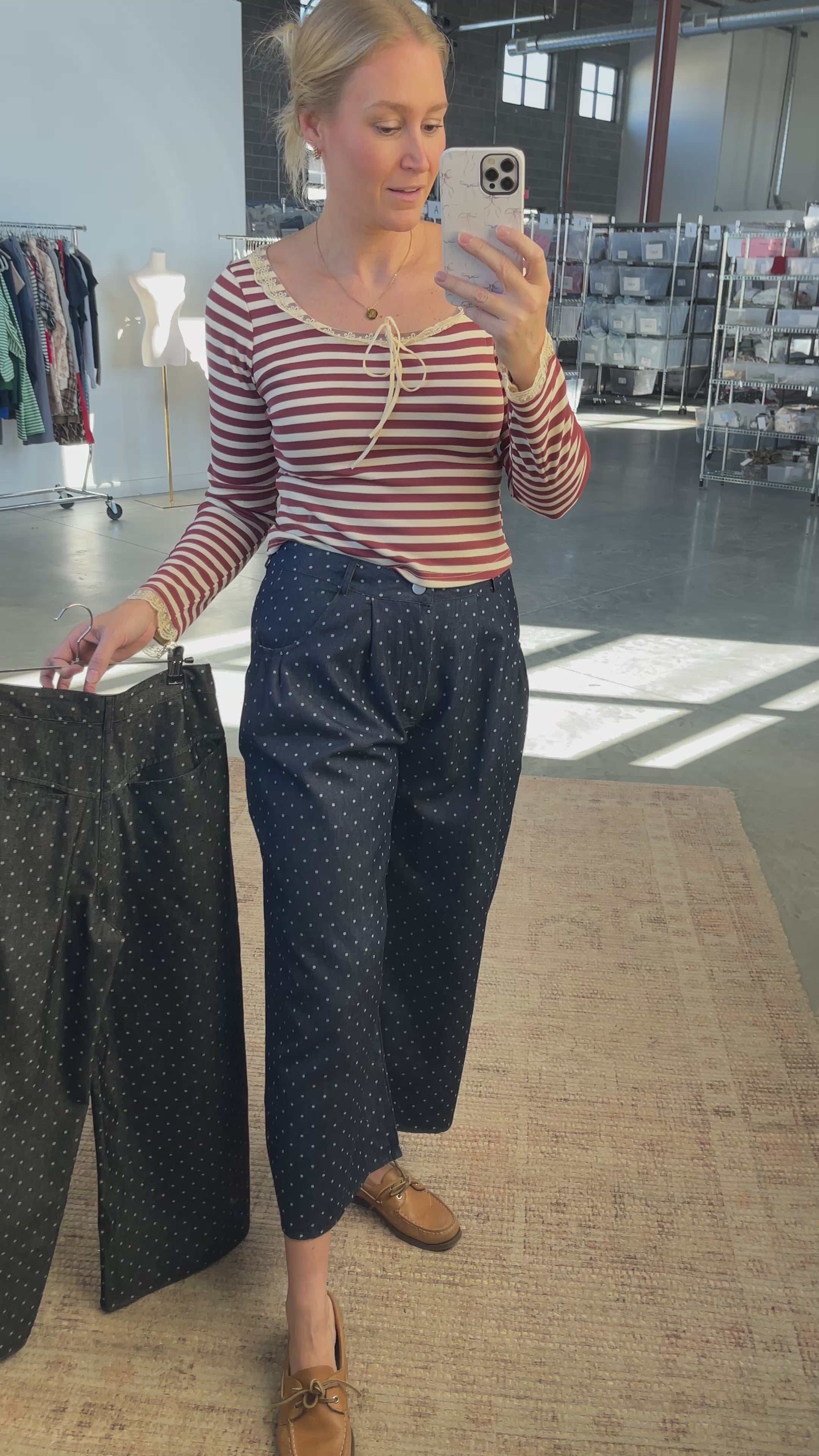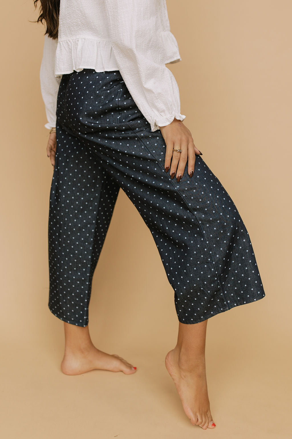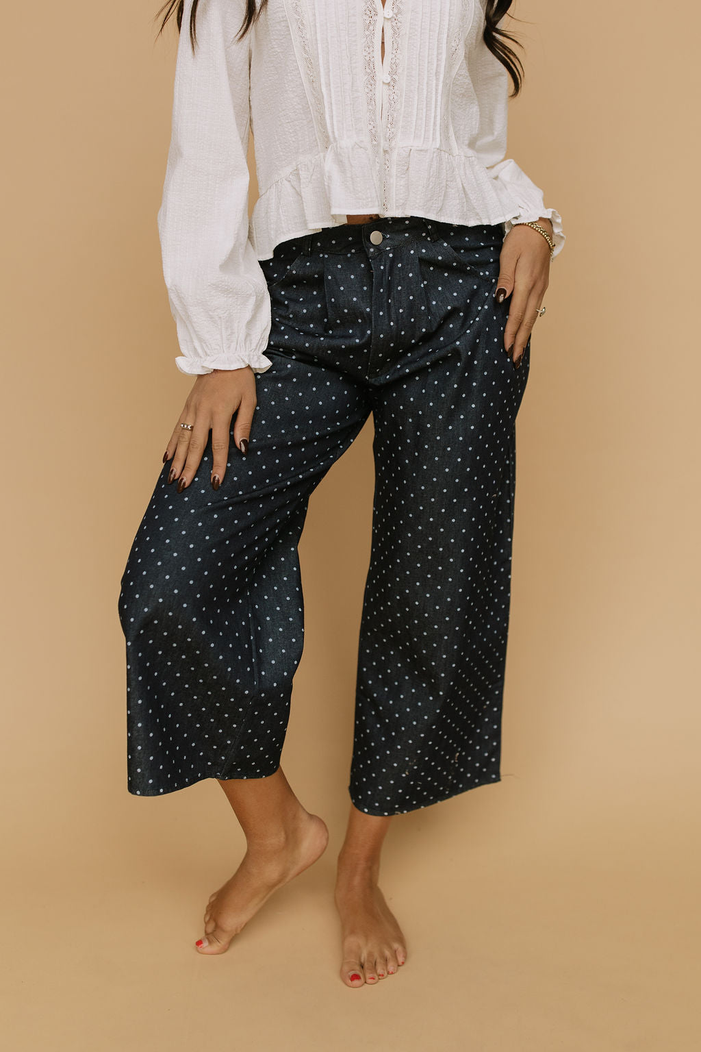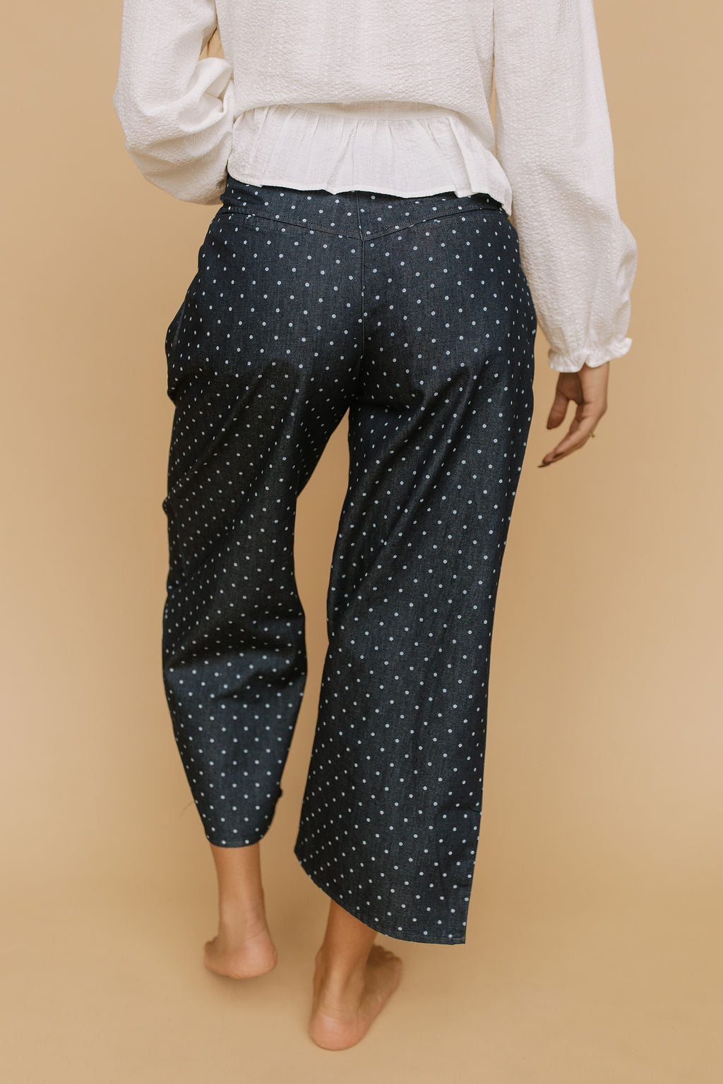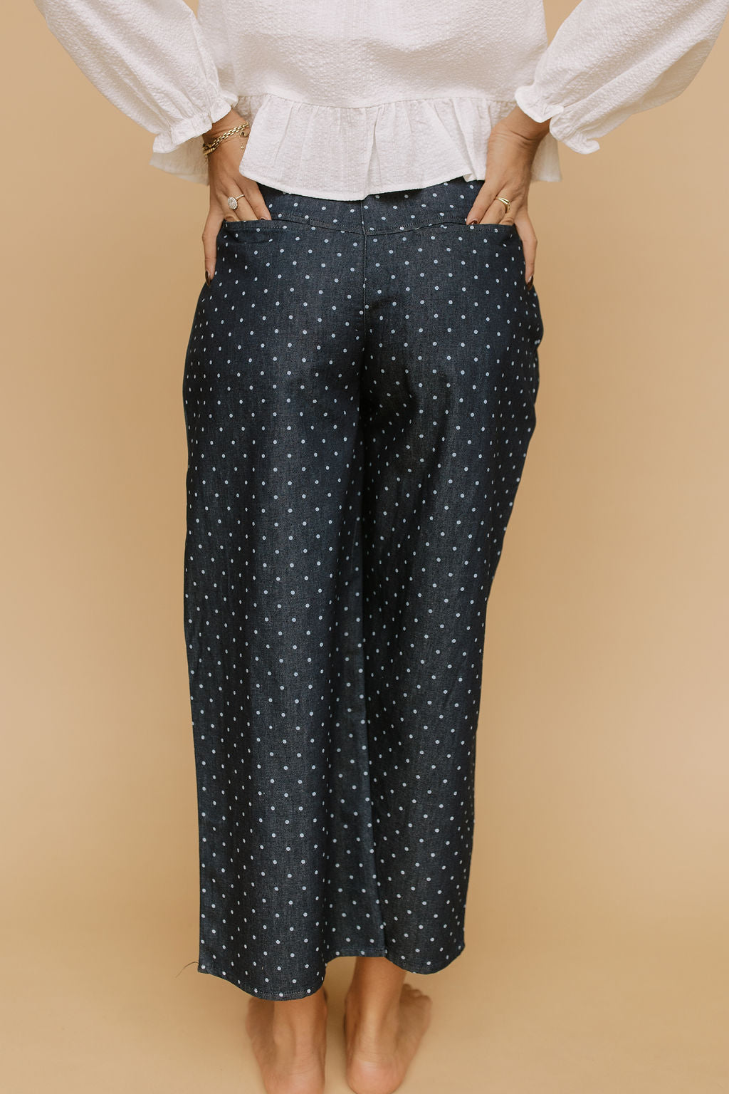 Details: Lightweight non-sheer denim with dot print. No stretch or elastic in these. Zipper fly front