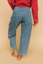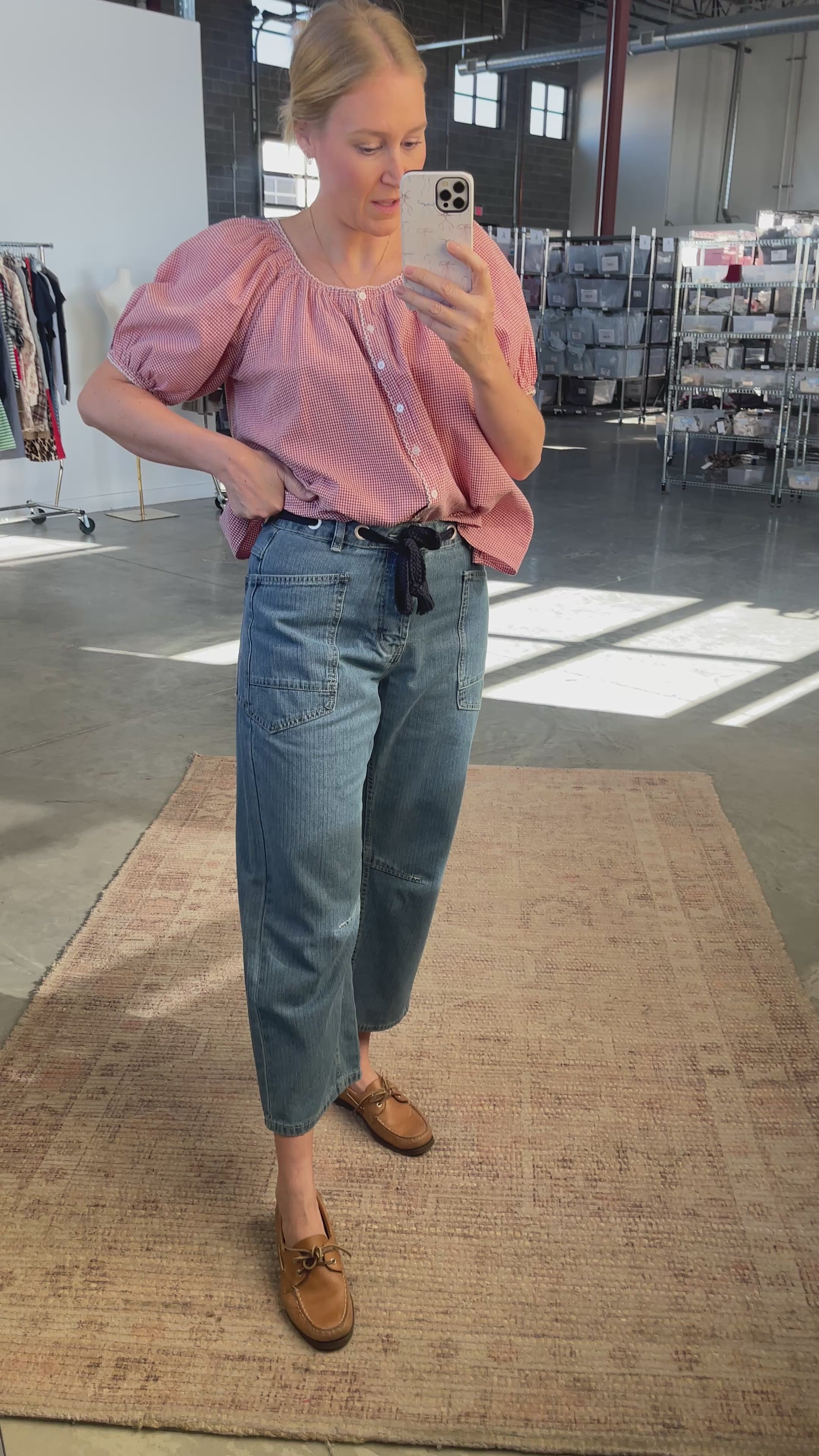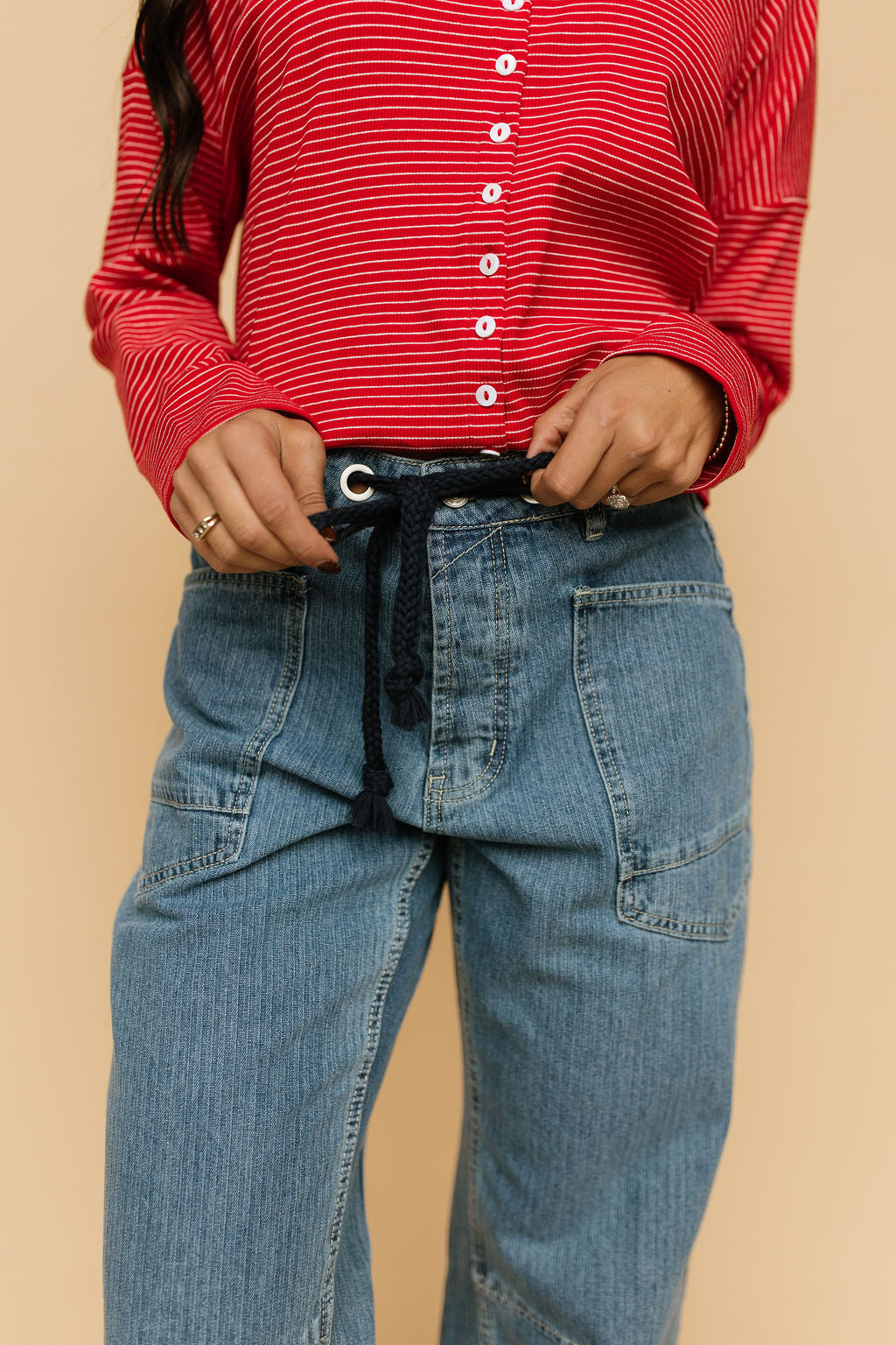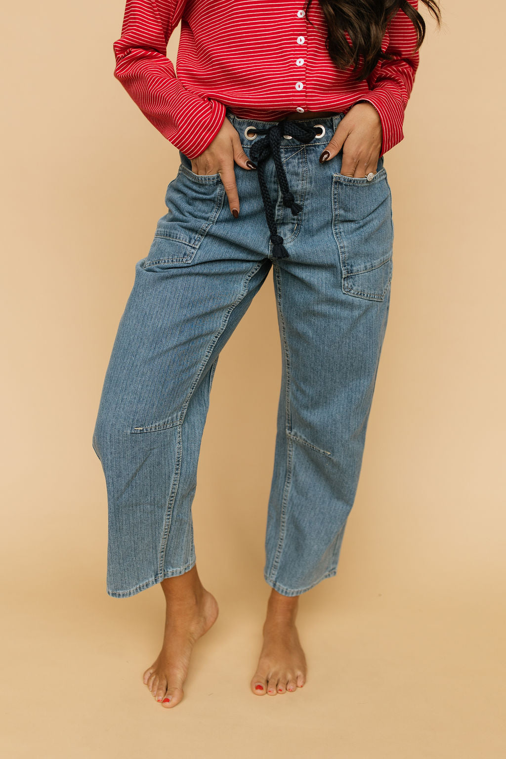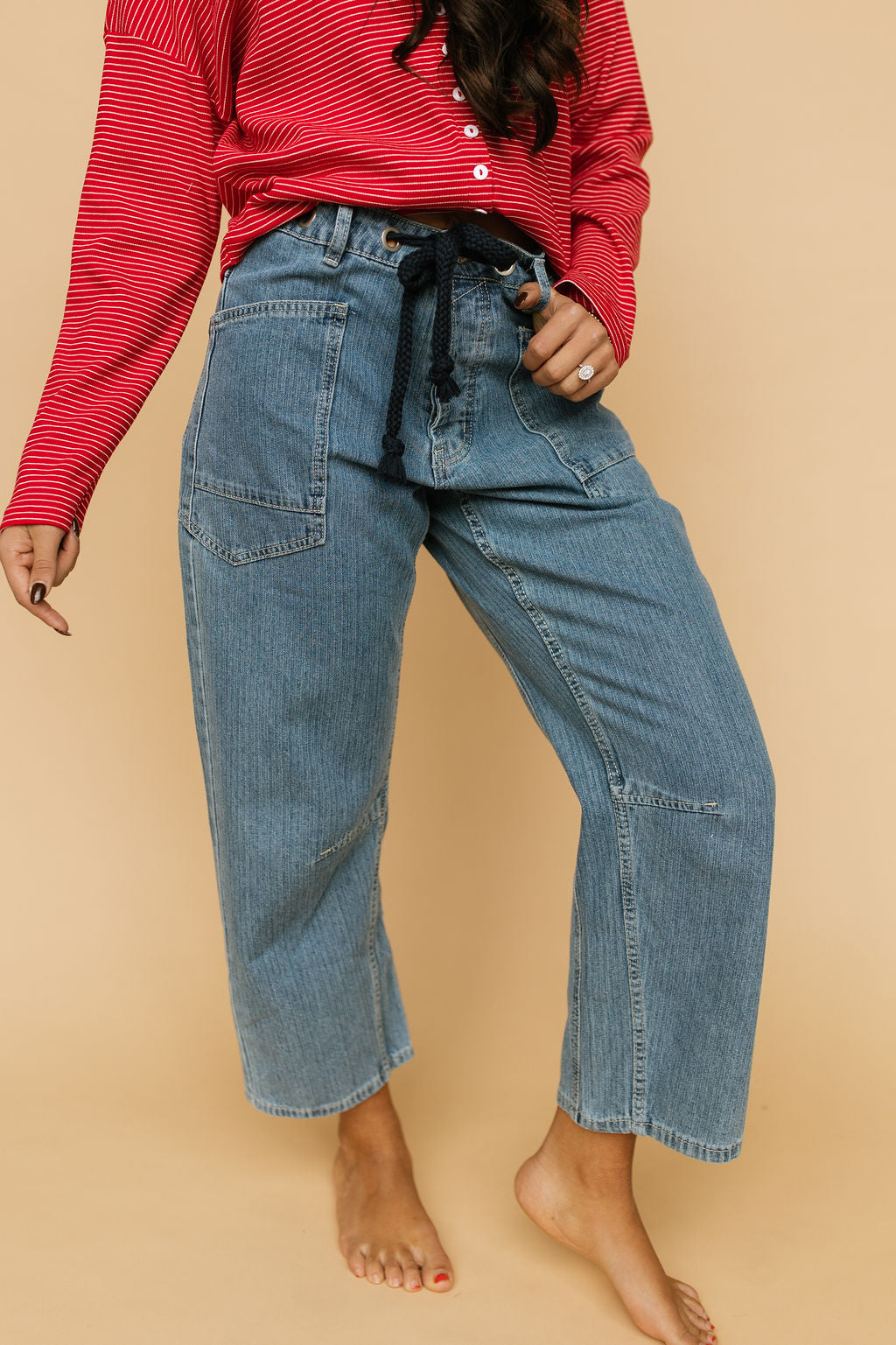 Details: Denim stripe barrel jeans, no stretch. Zipper fly front. Grommet tie waistband