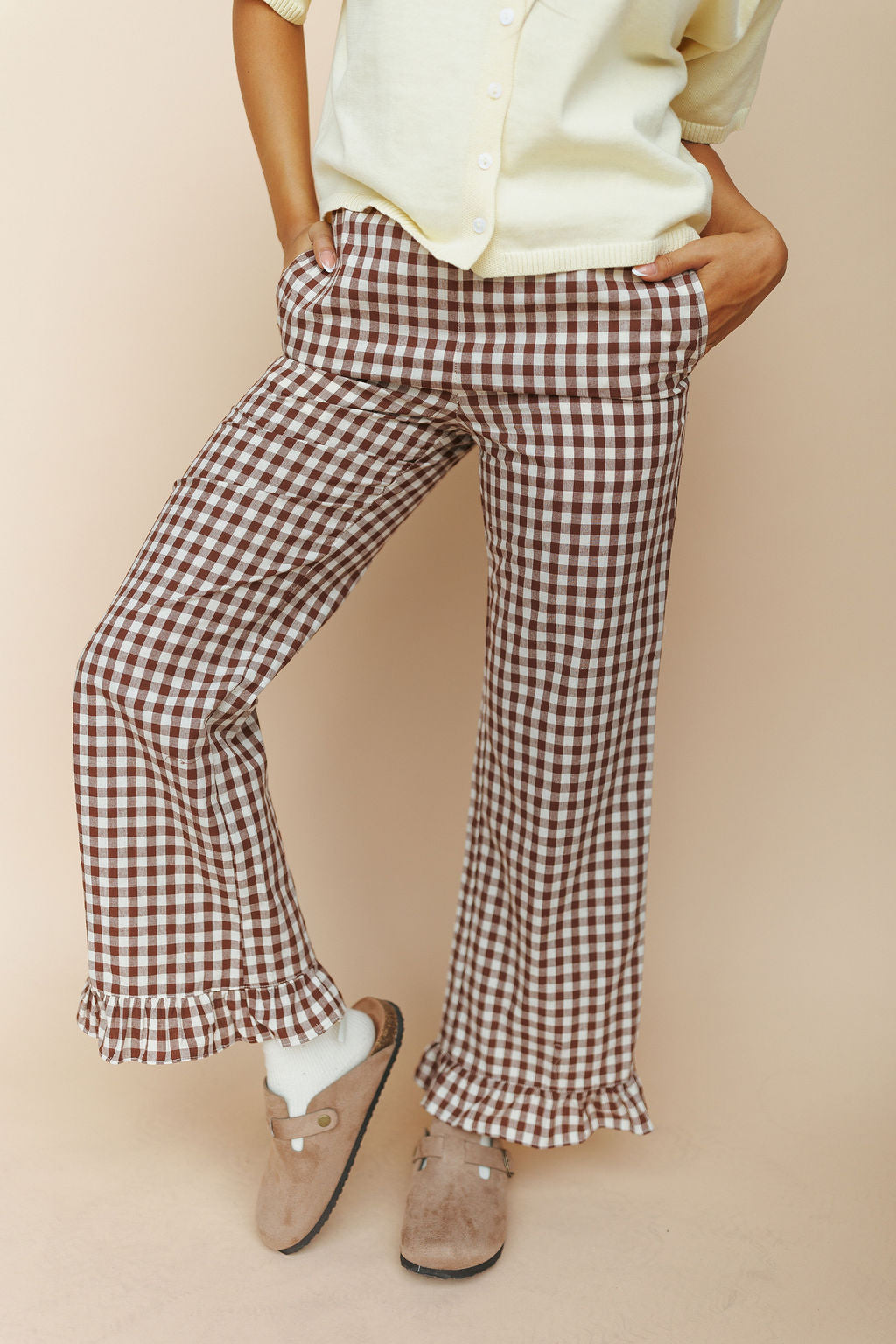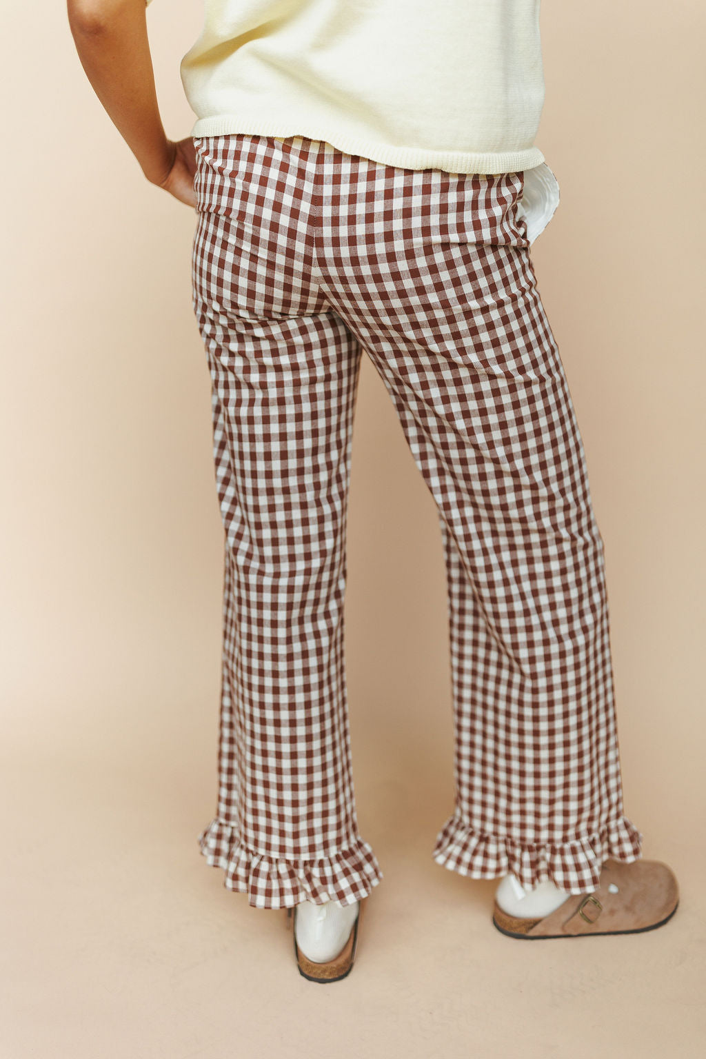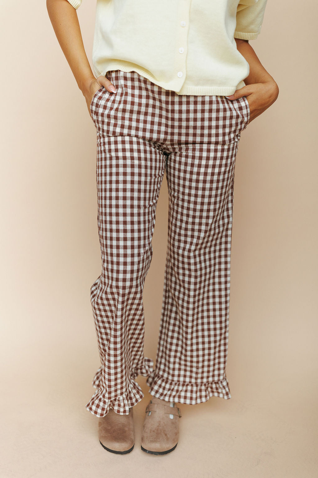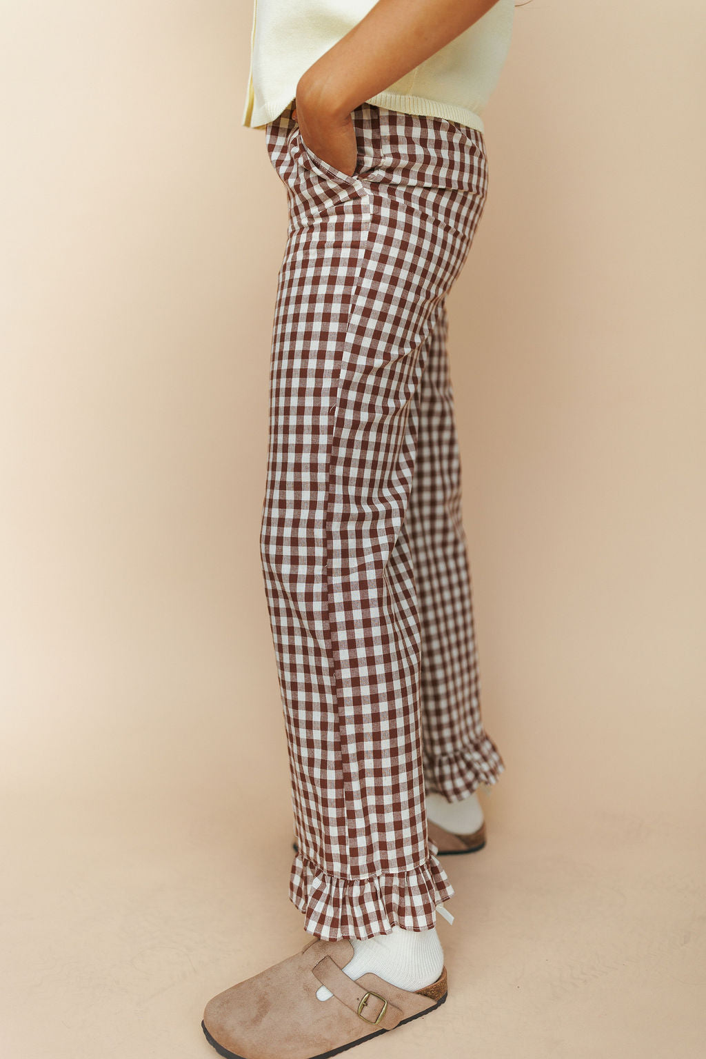 Marci Ruffle Gingham Pants in Brown
