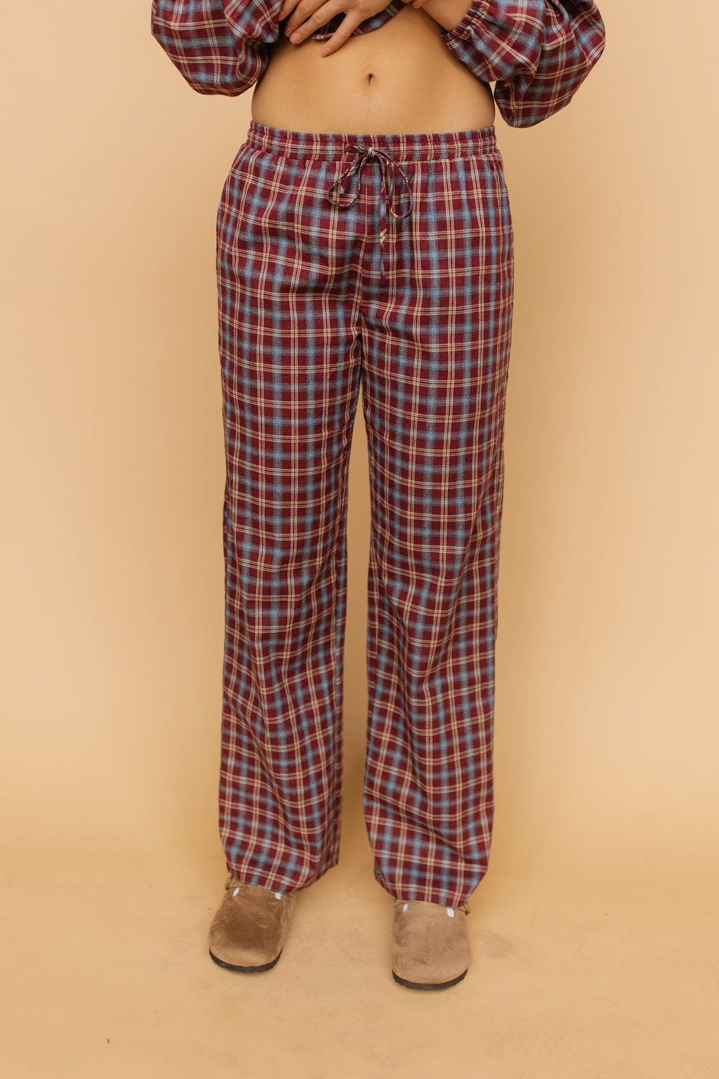 Details: Red plaid cotton pants with elastic band and functional tie. Side pockets. Comfy like lounge pants but will be so fun to dress up with cardigans & sweaters!