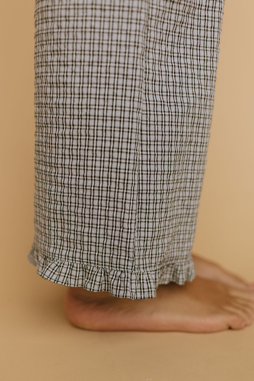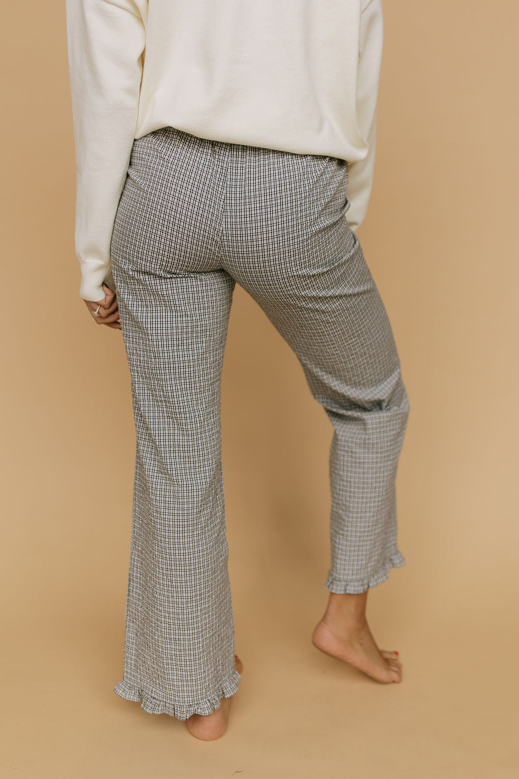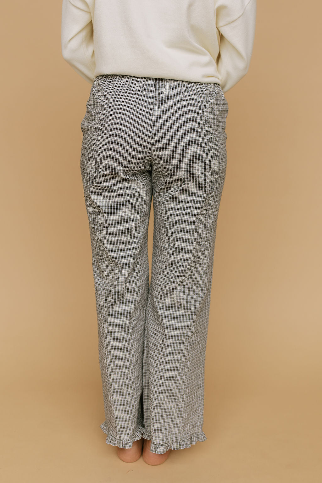 Details: Plaid pants with elastic waistband with pockets. Ruffle detail on hem