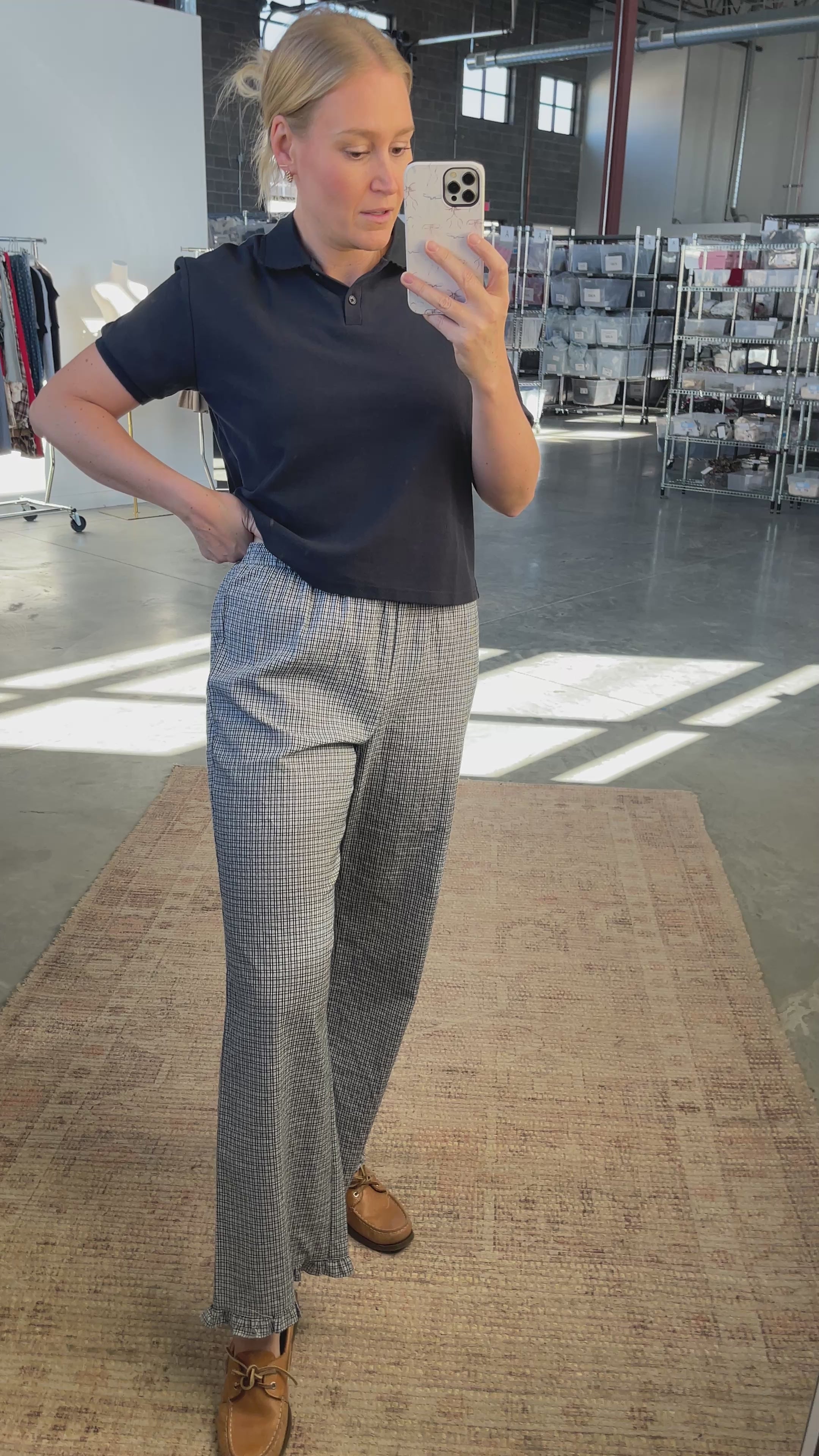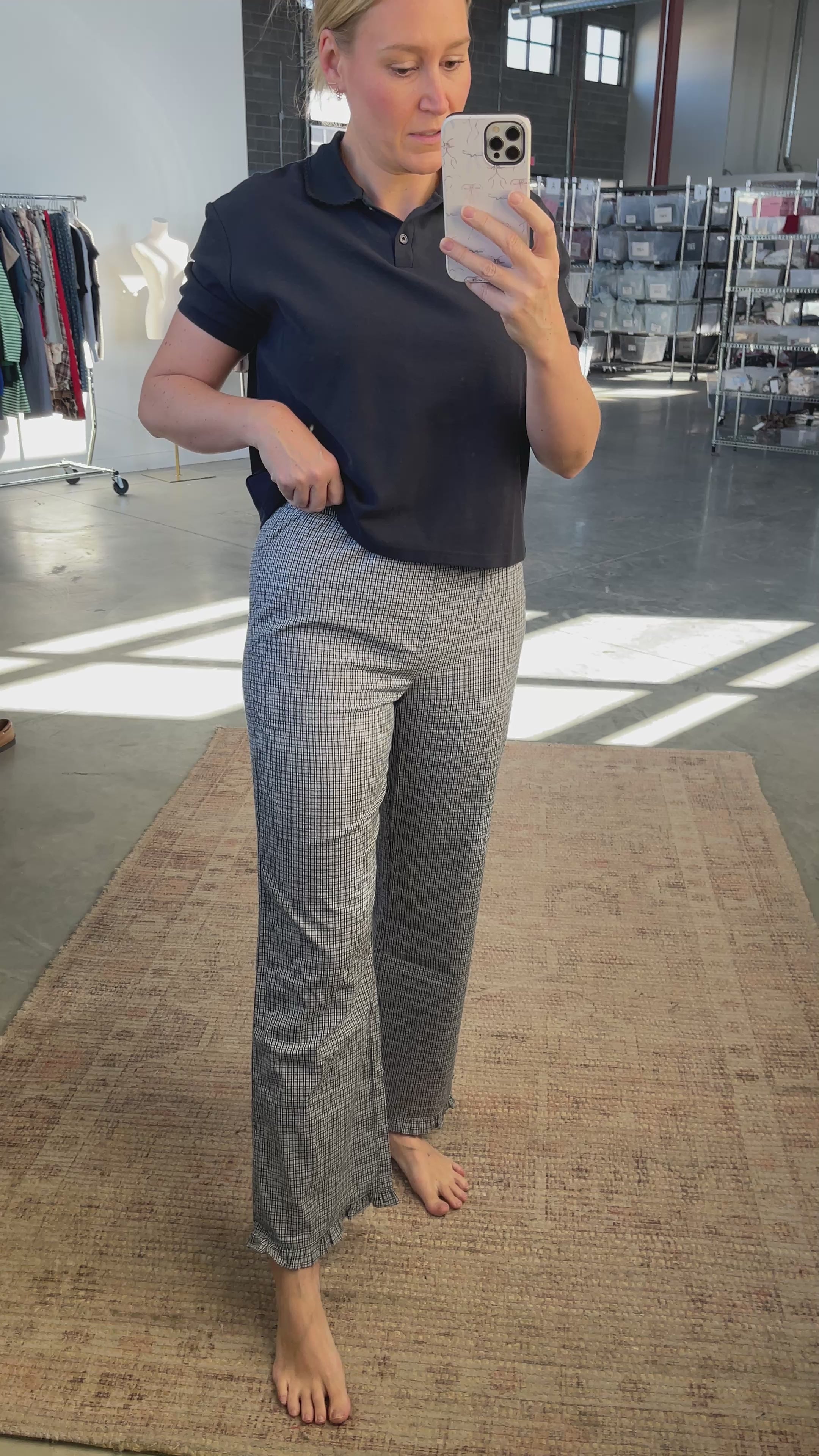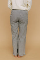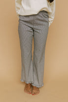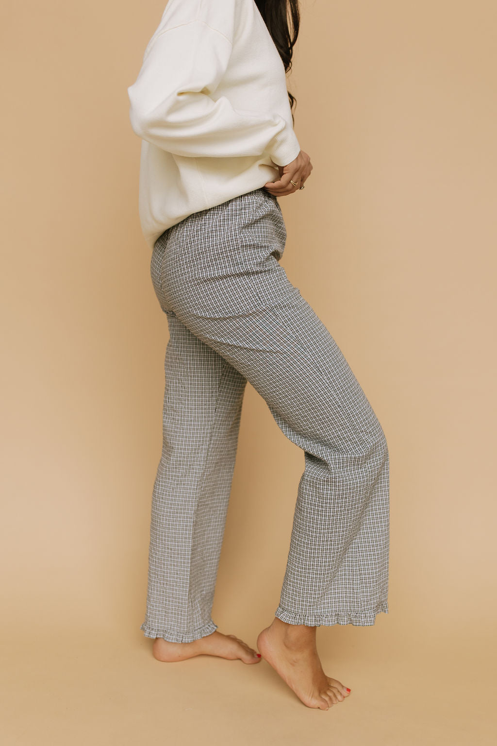 Details: Plaid pants with elastic waistband with pockets. Ruffle detail on hem