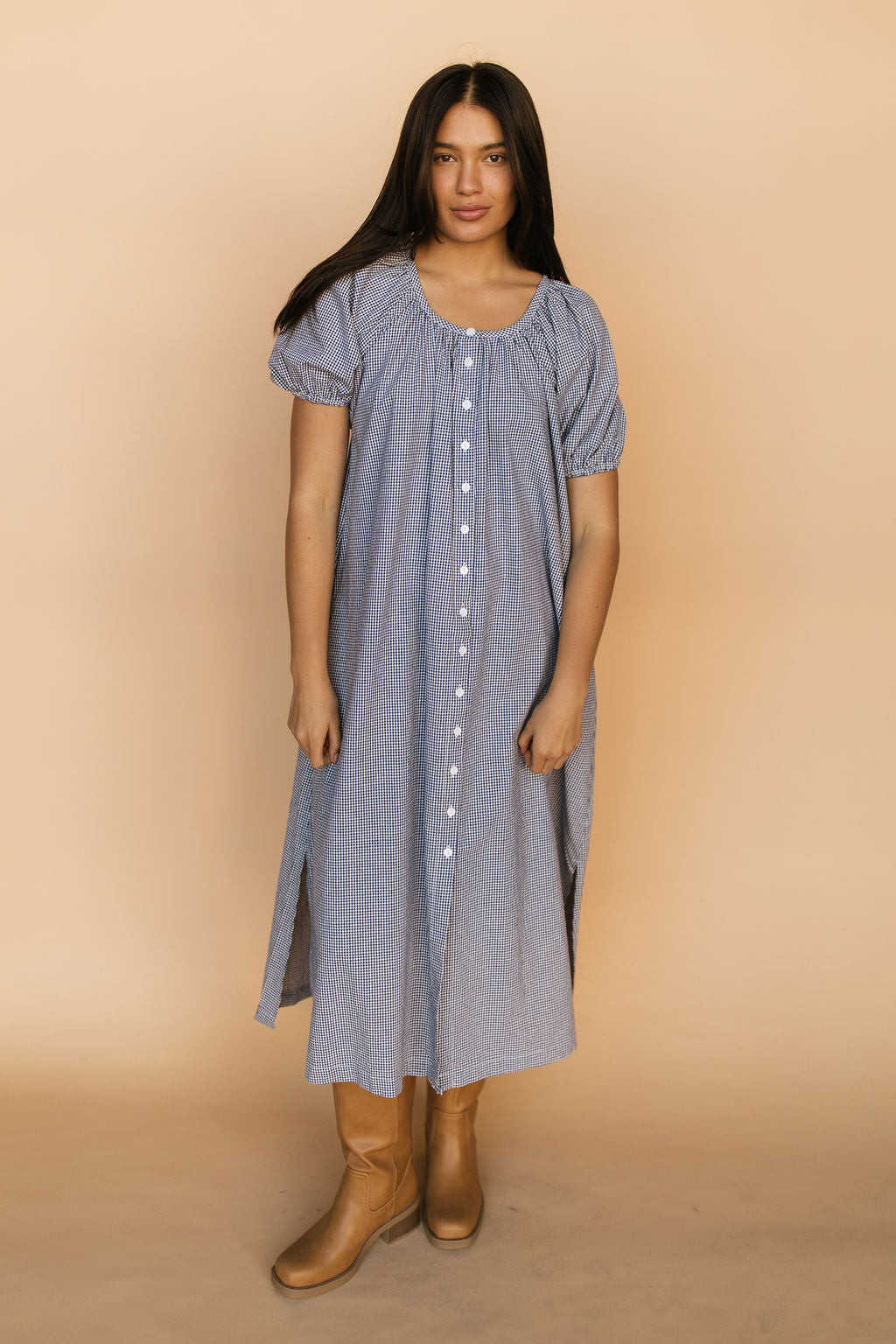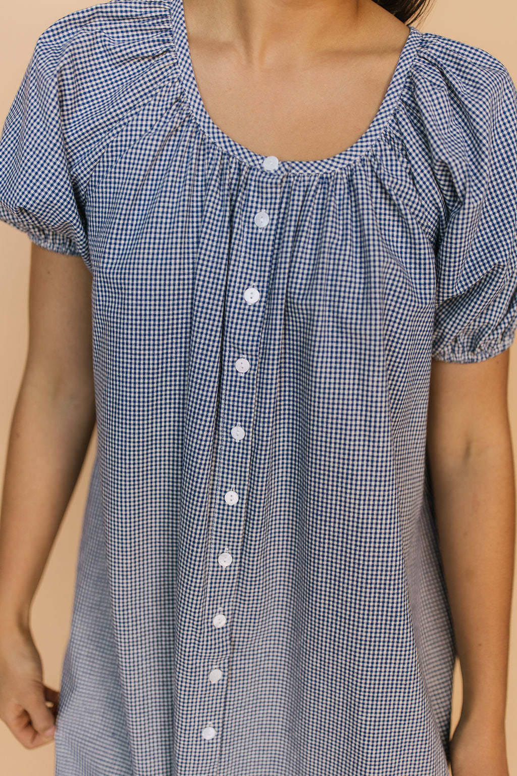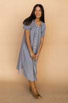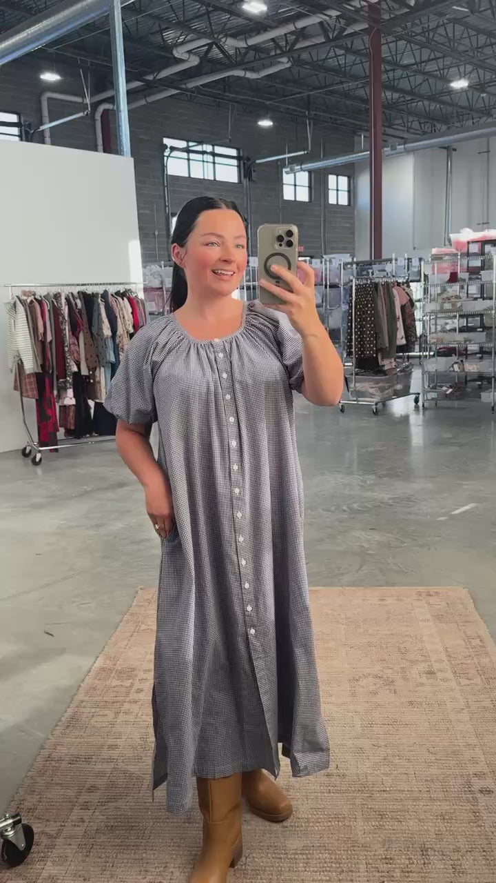 Main details: Gingham navy dress with button down front, nursing friendly. Bump friendly