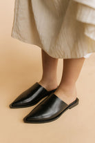Details: Genuine black leather slides. Leather will stretch and soften with wear. These mules give the look of boots but with the comfort of flats!