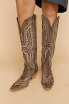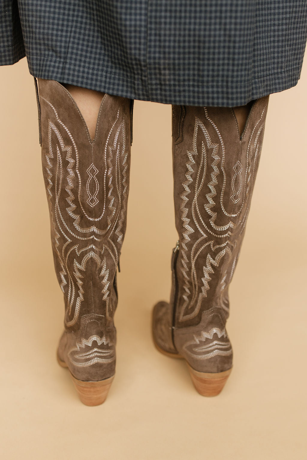 Details: Embroidered dark brown cowboy boots with 2.5" stacked heel. Slip on style with inner zipper at ankle. Velvety suede material