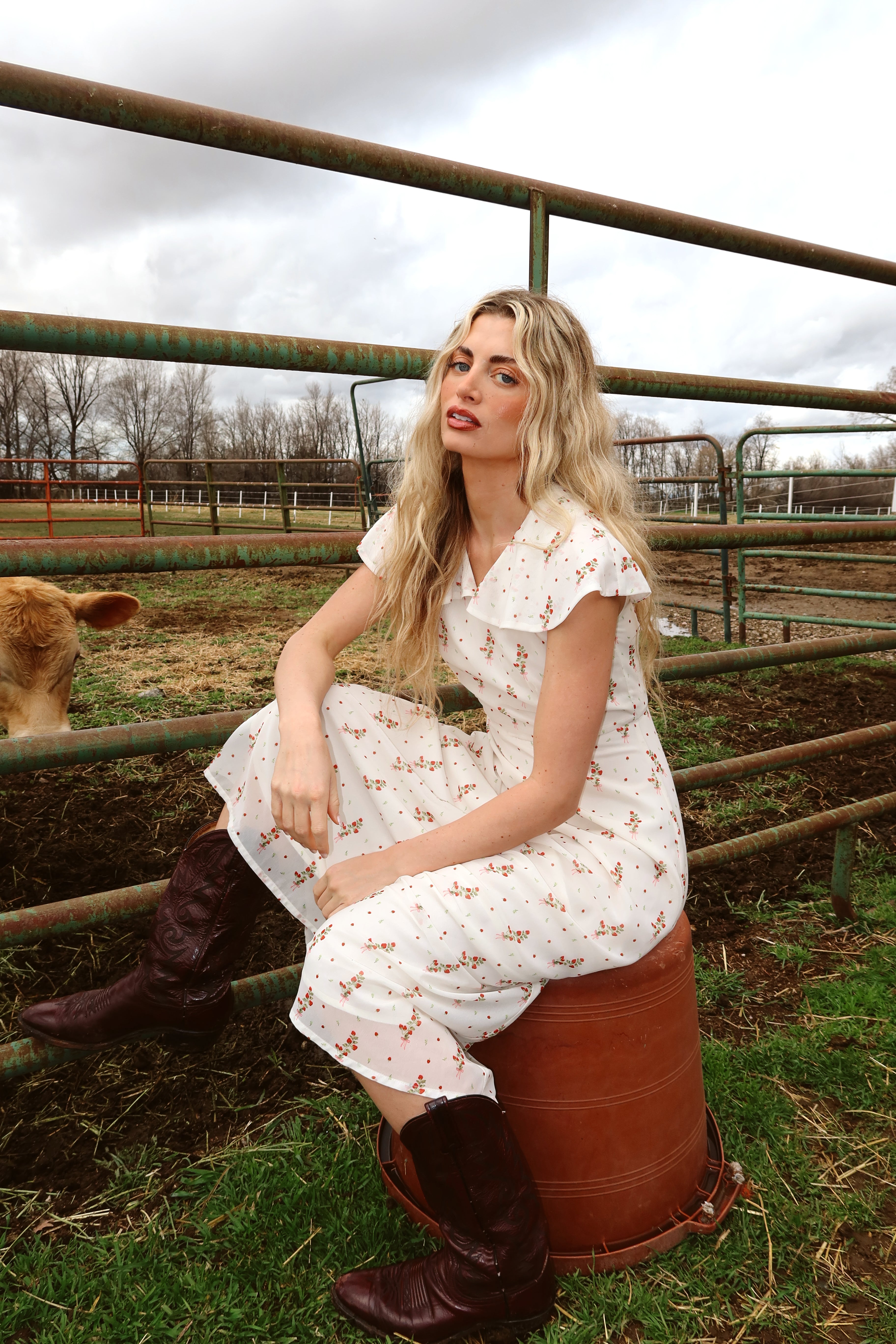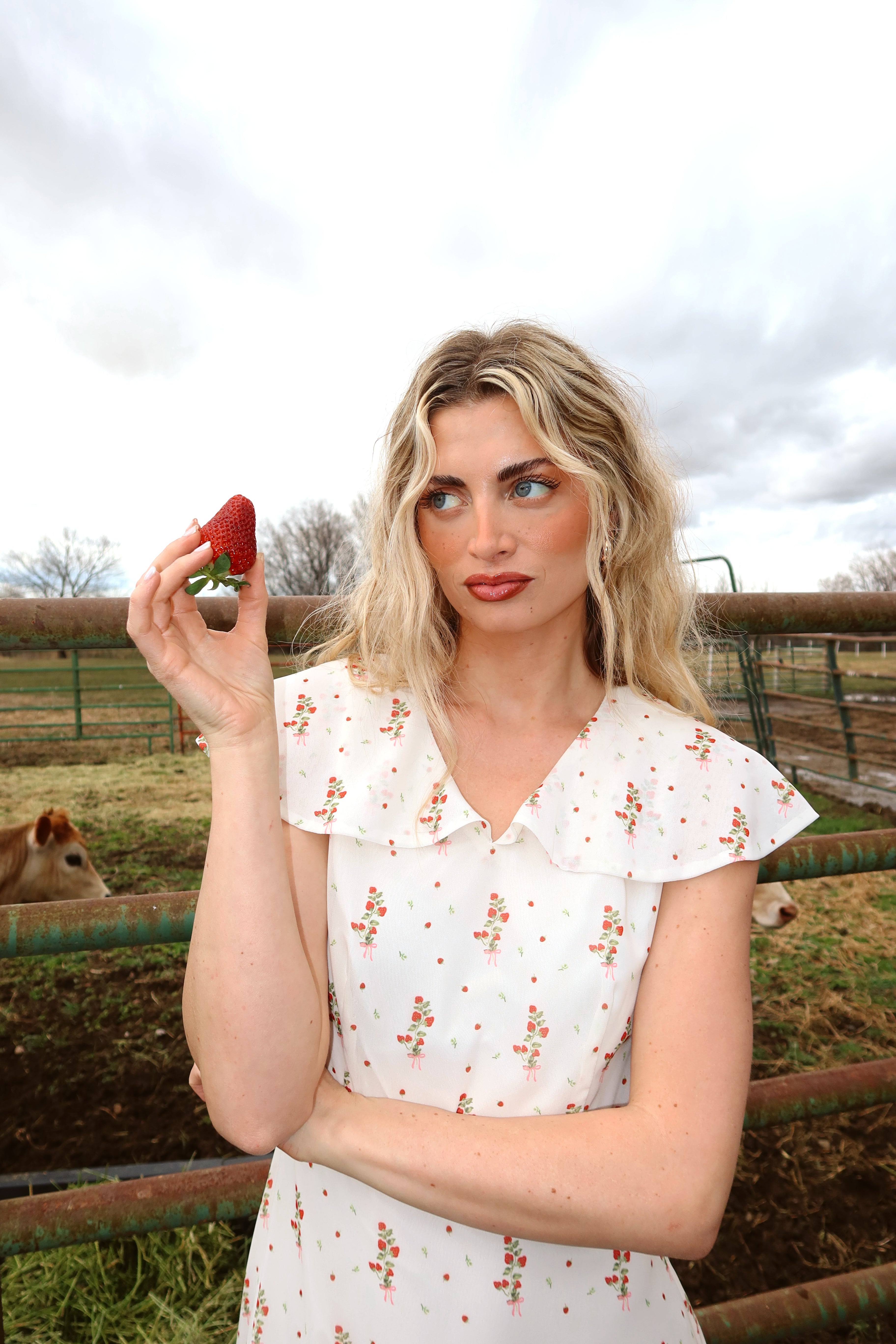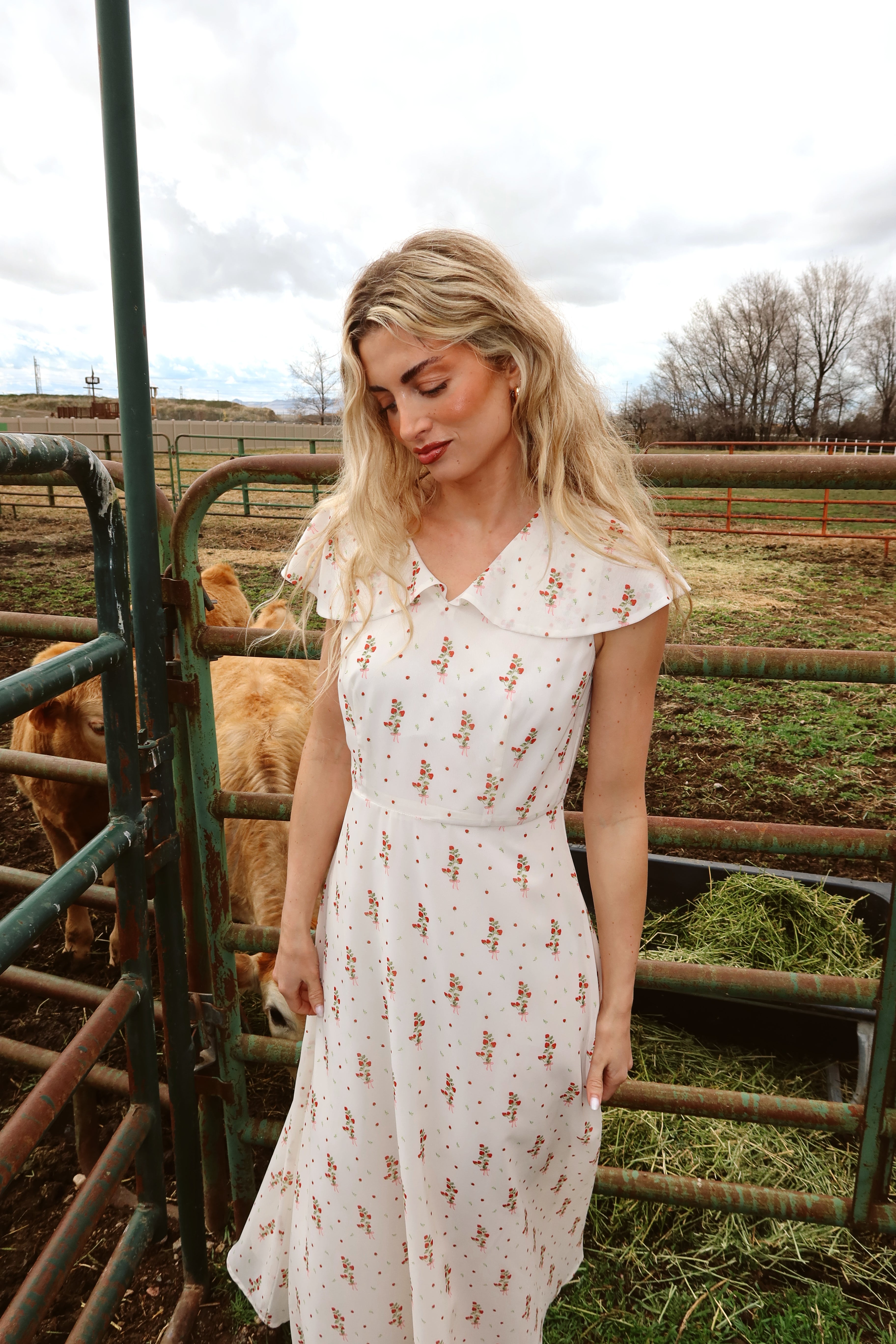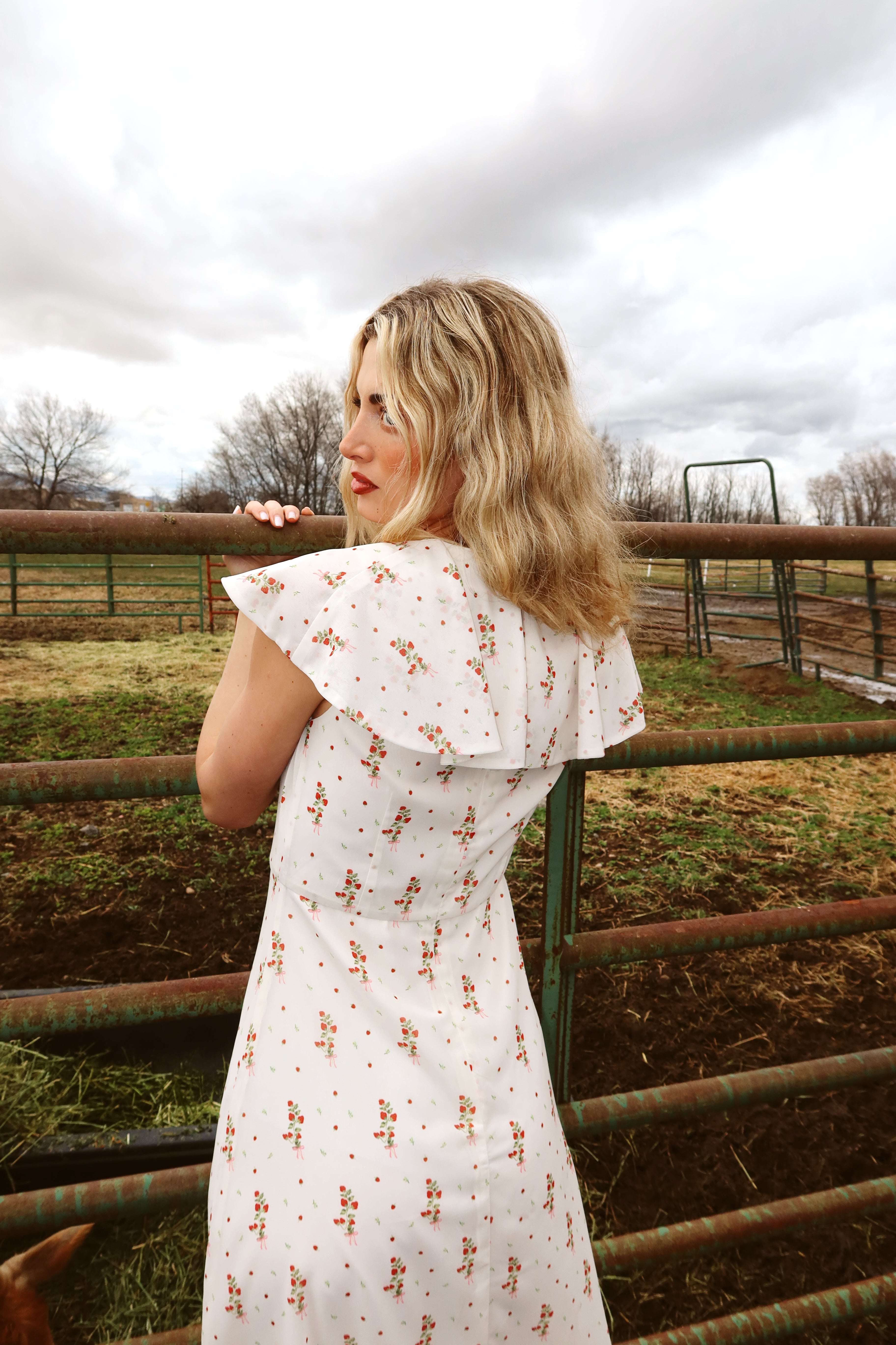 Main details: A Henly exclusive designed for effortless spring-to-summer femininity. Featuring a delicate strawberry vine print scattered across a soft ivory backdrop, this midi-length dress blends vintage romance with subtle western charm.