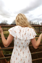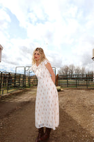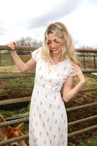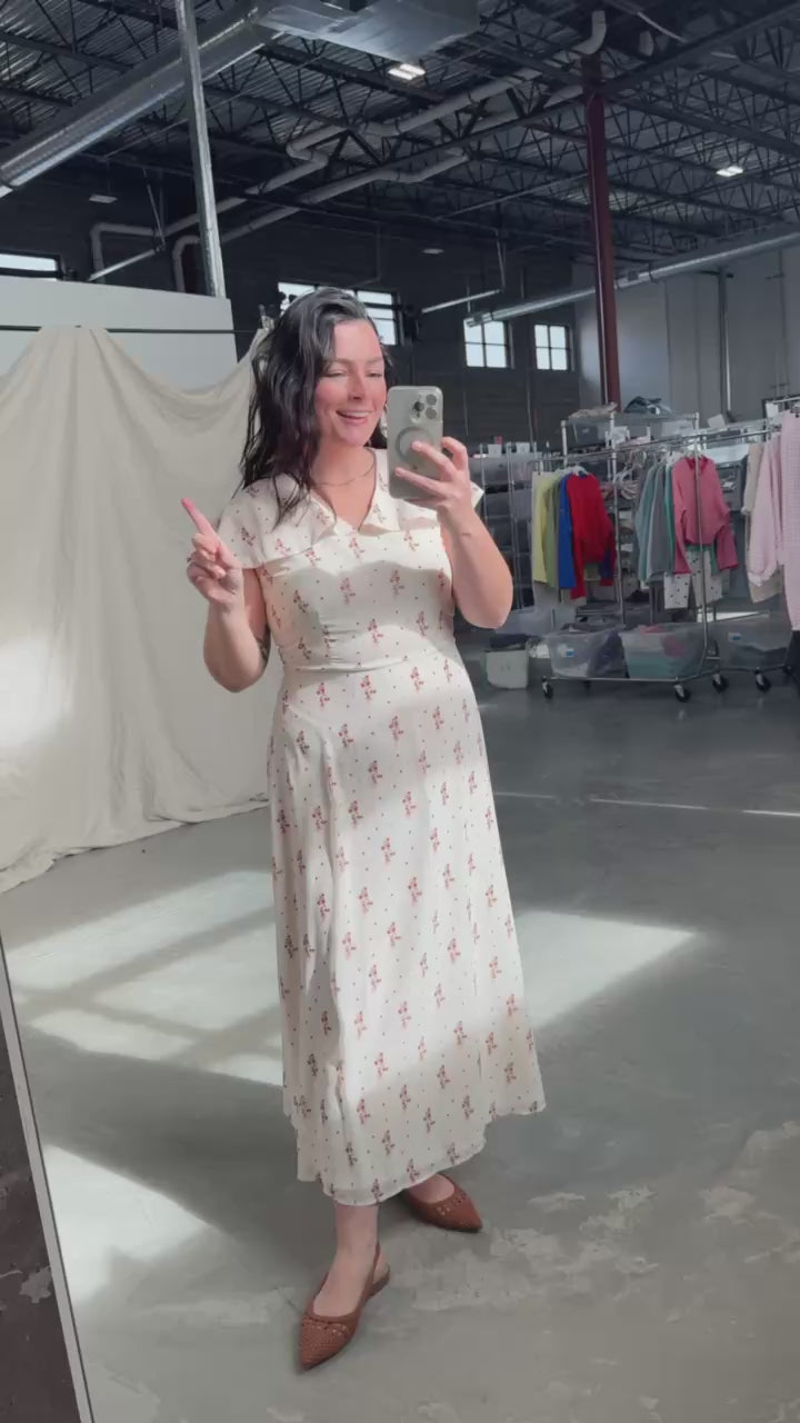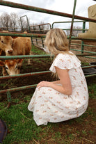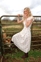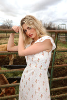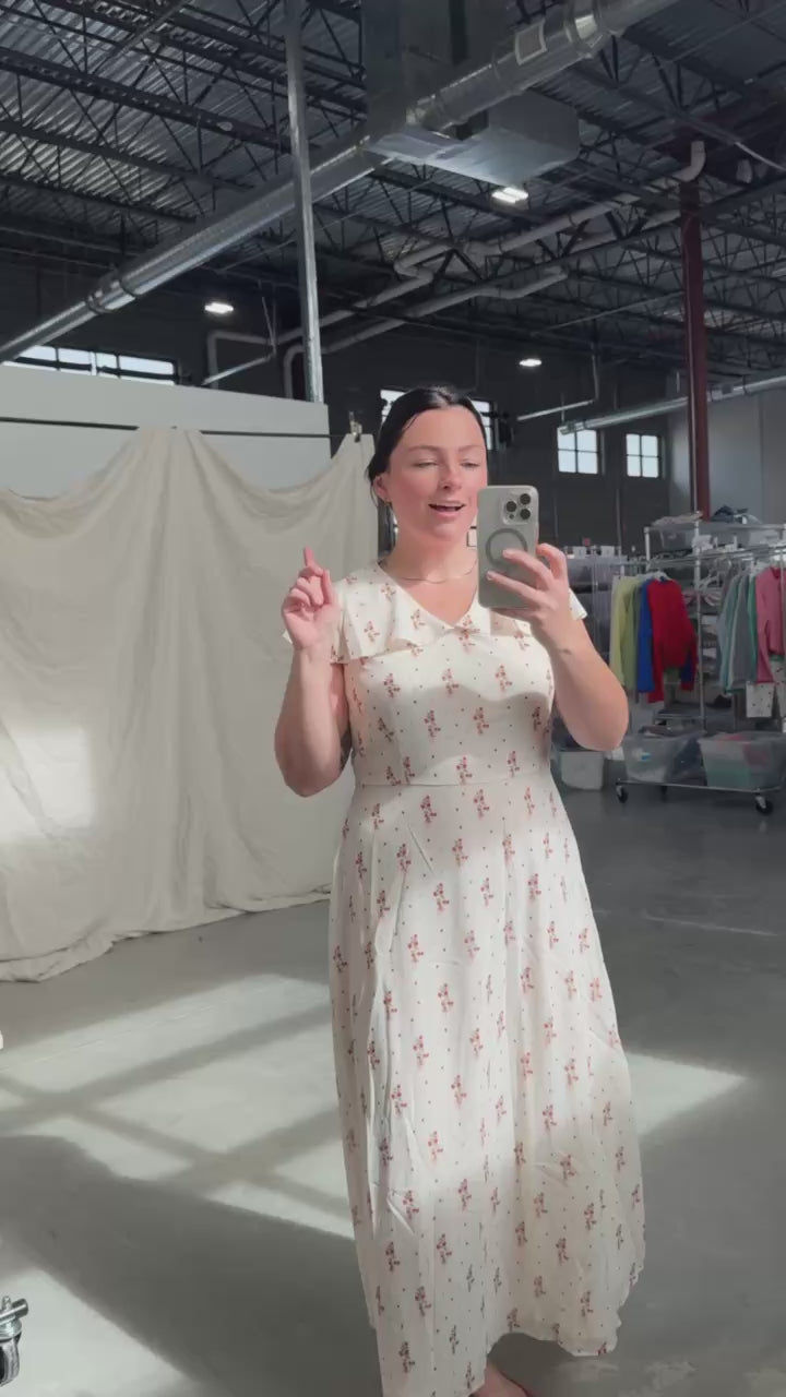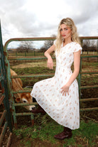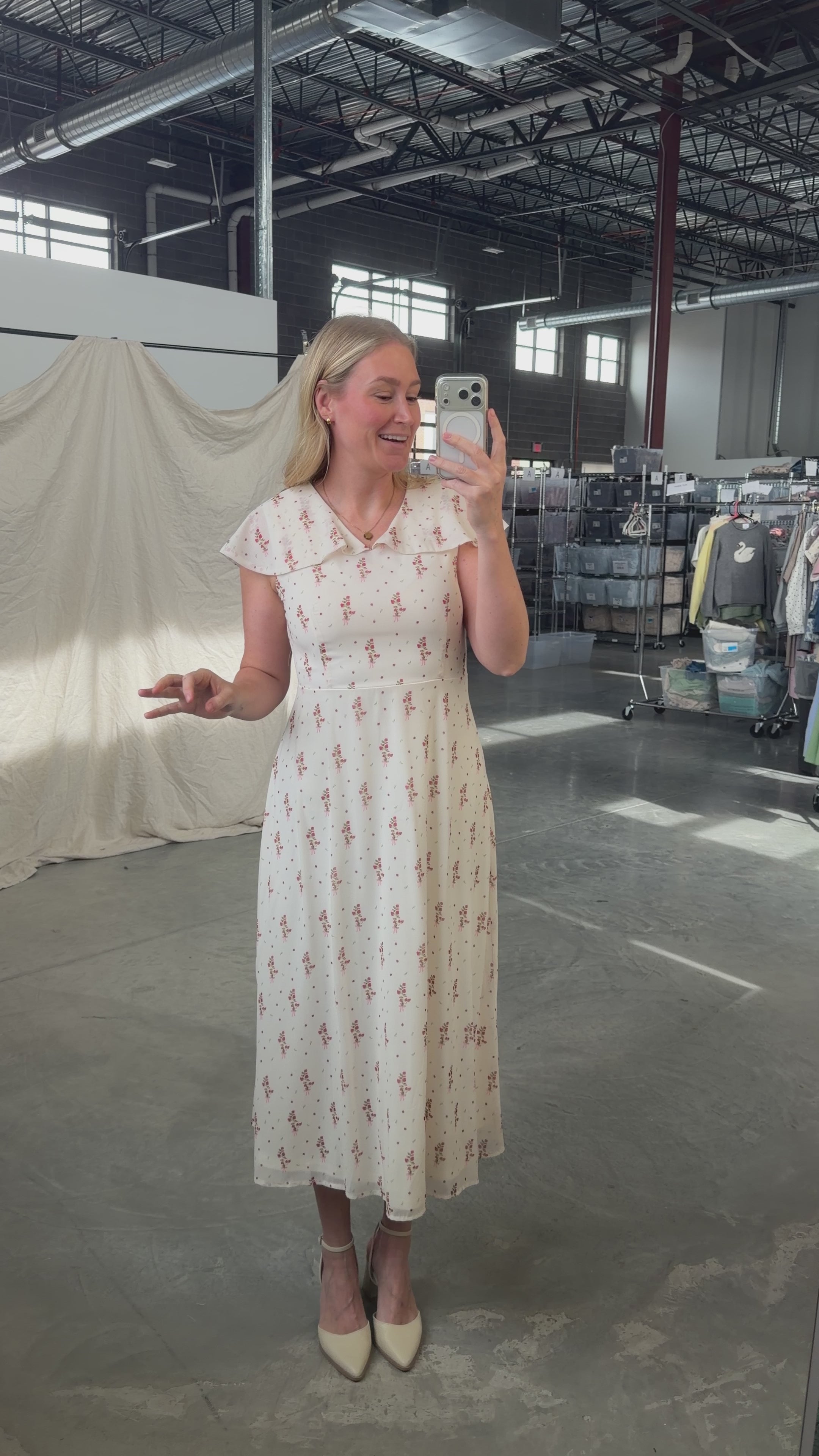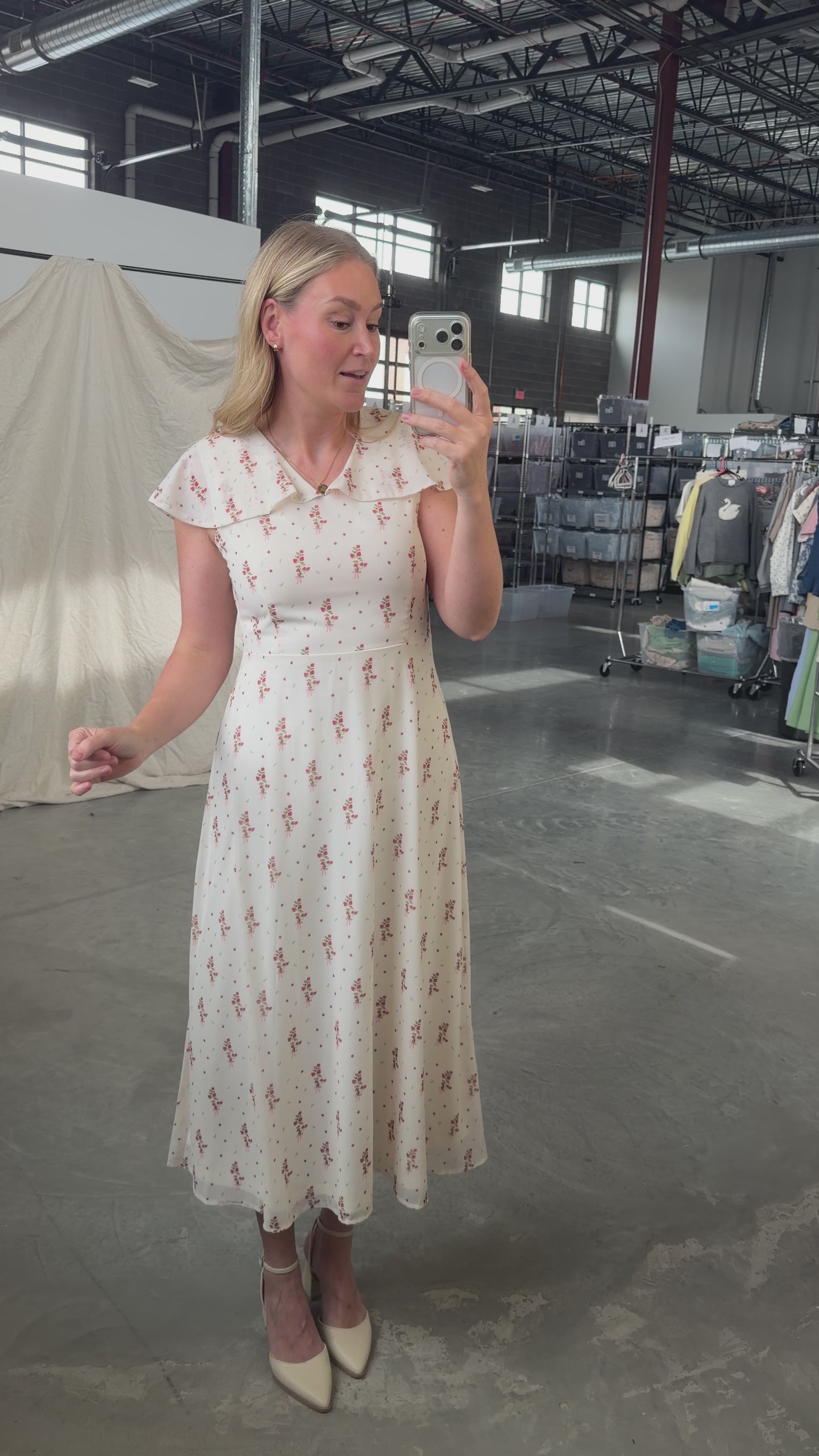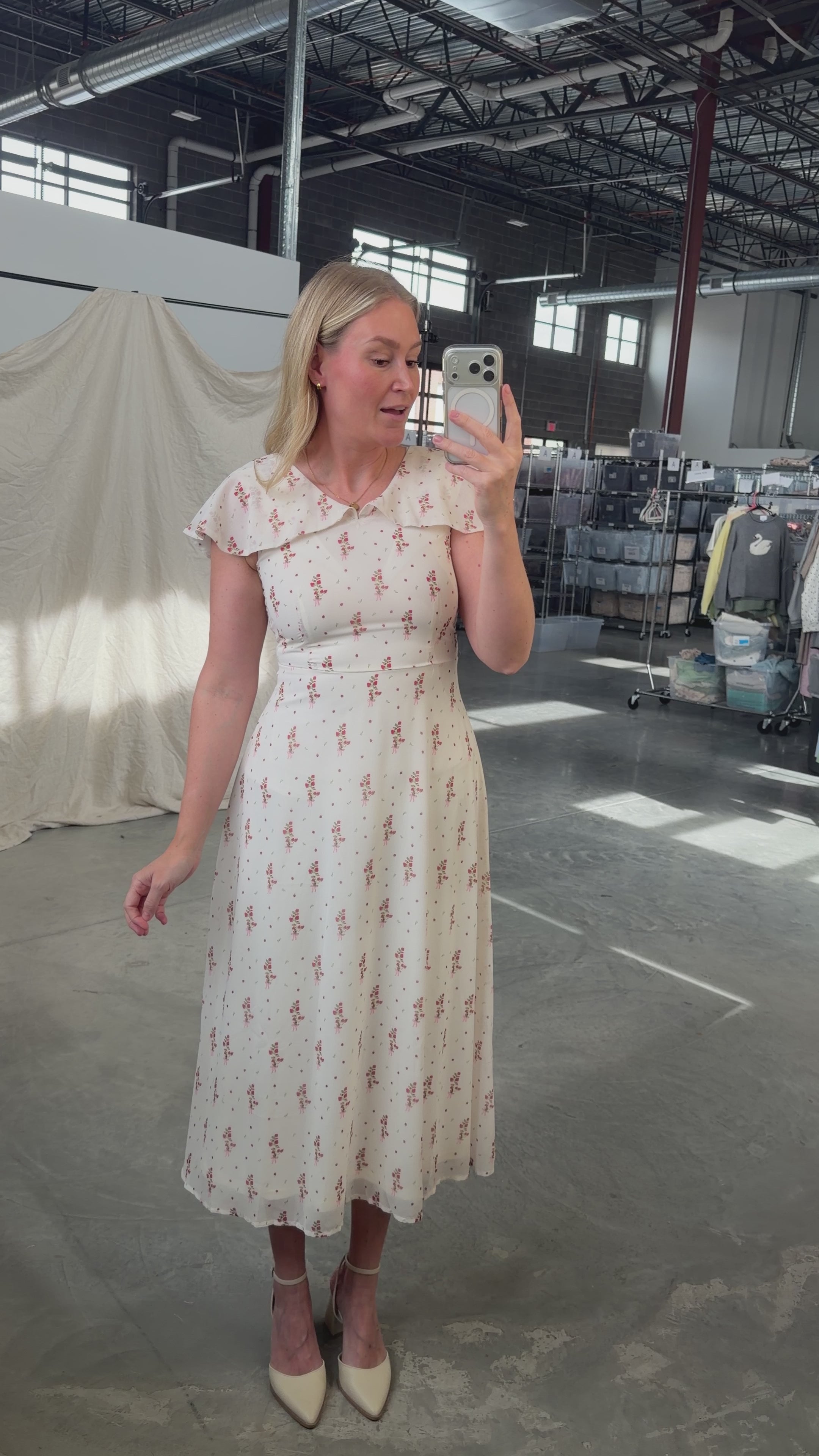 Main details: A Henly exclusive designed for effortless spring-to-summer femininity. Featuring a delicate strawberry vine print scattered across a soft ivory backdrop, this midi-length dress blends vintage romance with subtle western charm.