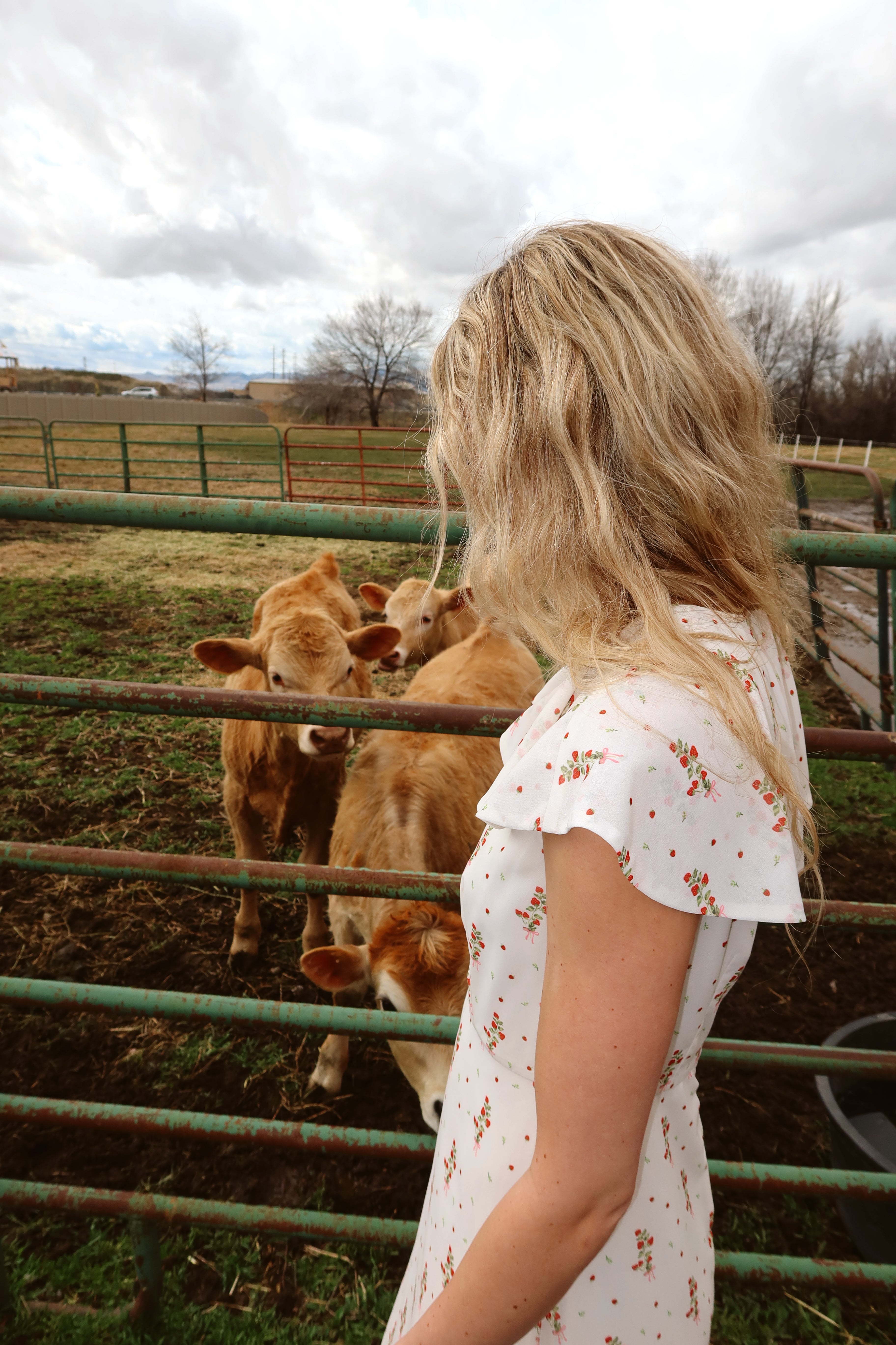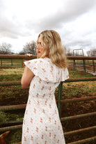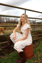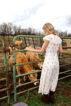 This dress pairs effortlessly with cowboy boots for a ranch-inspired look or with delicate flats, heels or sandals for a soft cottage-core aesthetic.