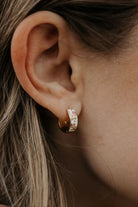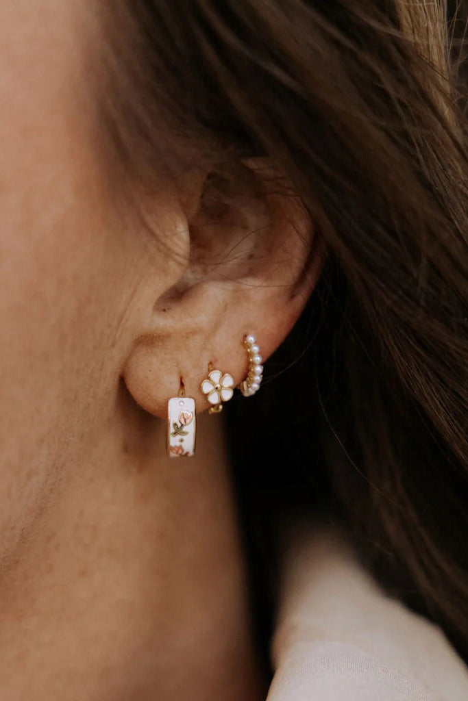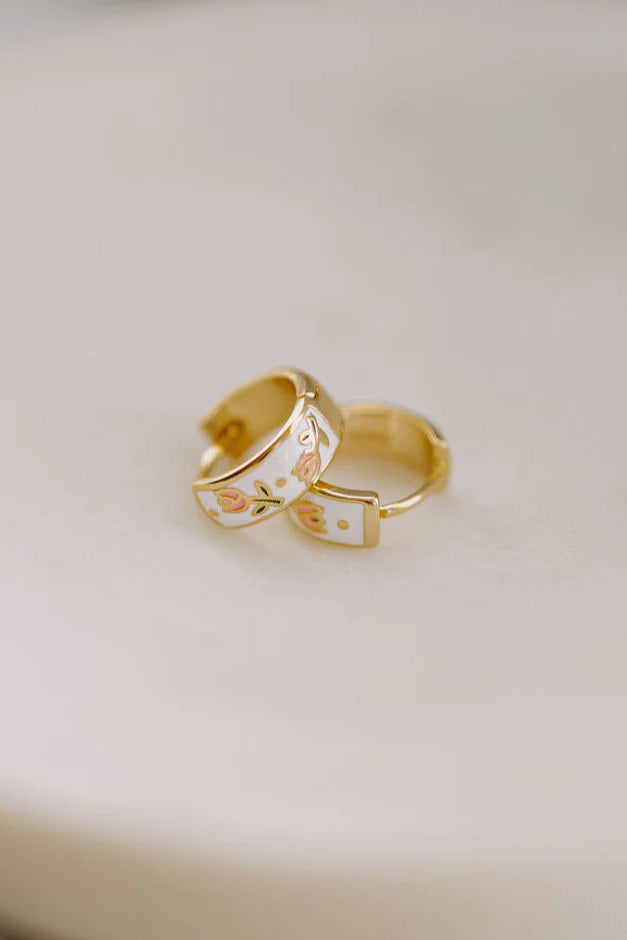 Pink tulips with a white enamel background. Gold vermeil (gold hoop with a sterling silver hypoallergenic base)