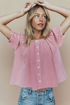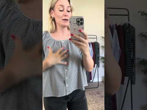 Details: Micro gingham blouse with scallop stitch detail on neck, sleeves & down button front. Nursing-friendly! Soft elastic on sleeves. Flowy!