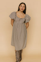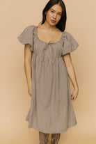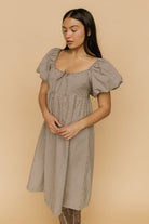 Details: Brown & cream gingham dress. Elastic neckline with tie, nursing friendly. Lined. Puff soft elastic sleeve. Bump friendly