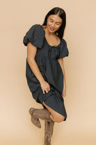 Details: Navy & greyish blue gingham dress. Elastic neckline with tie, nursing friendly. Lined. Puff soft elastic sleeve. Bump friendly