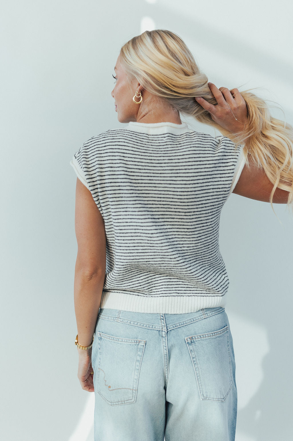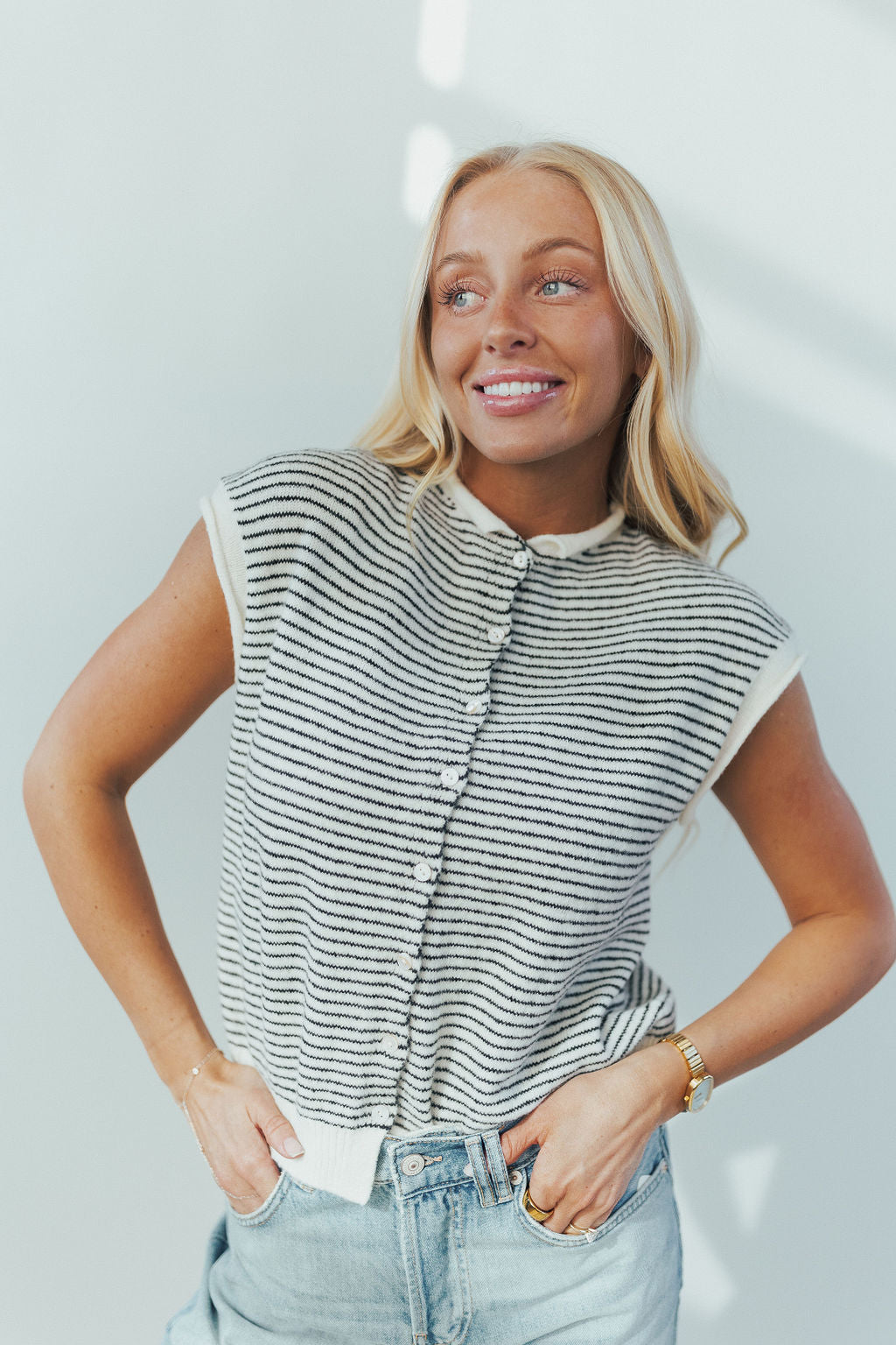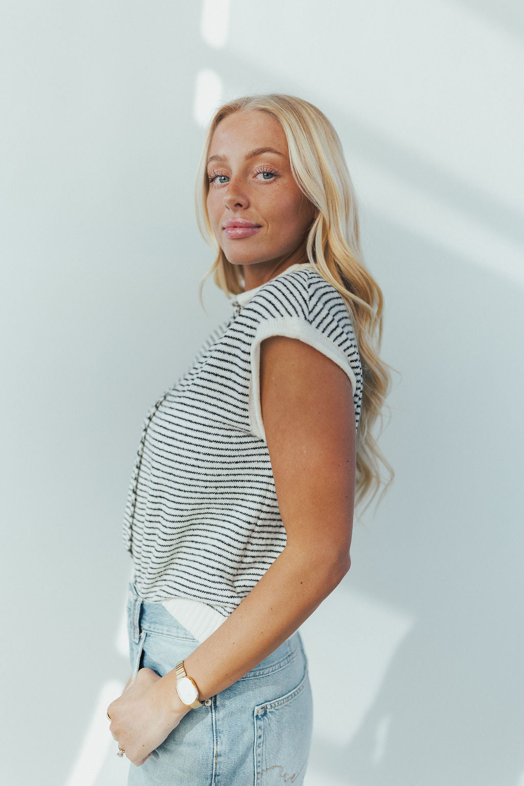 Piper Short Sleeve Cardigan in Black Pinstripe