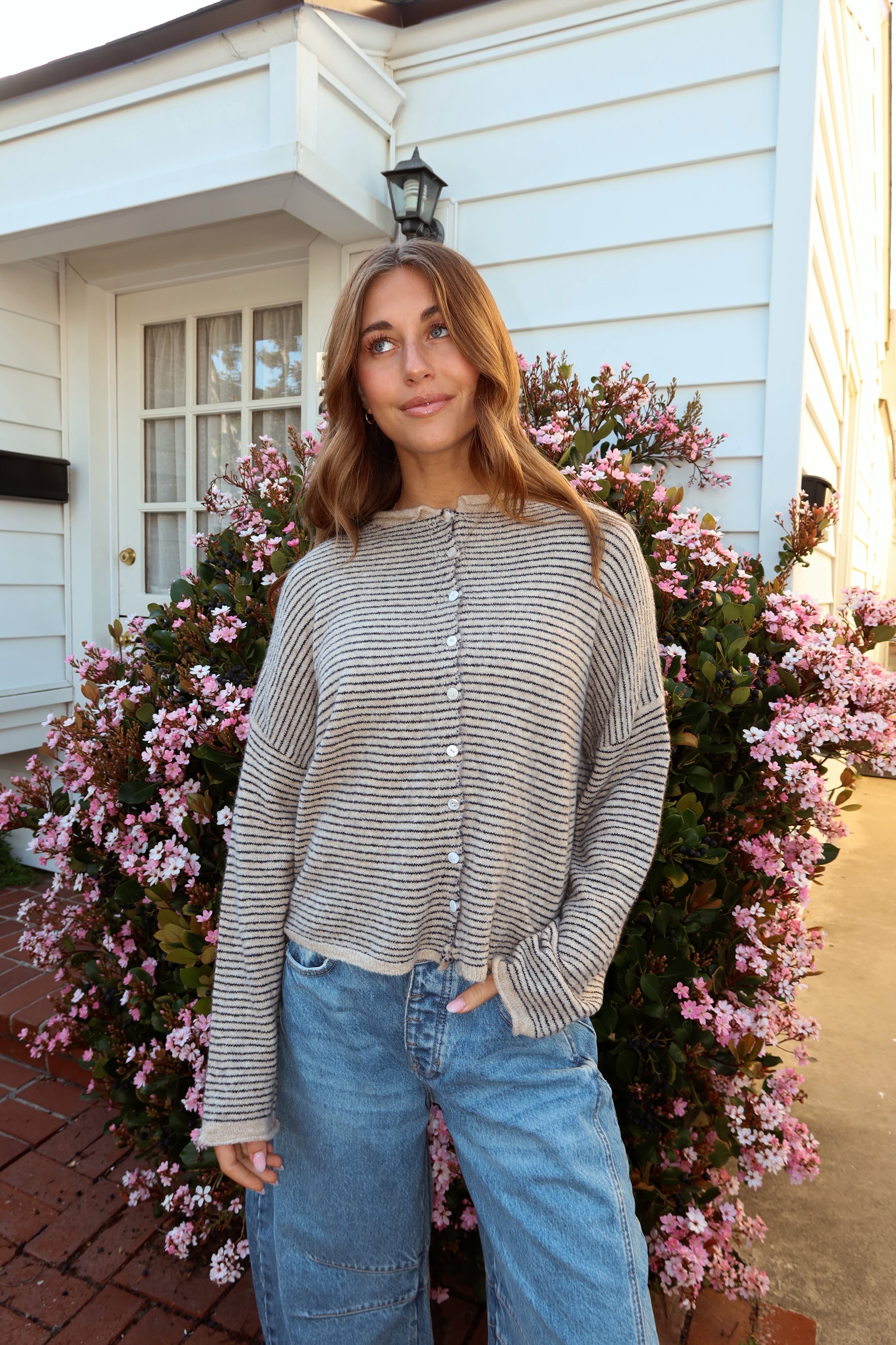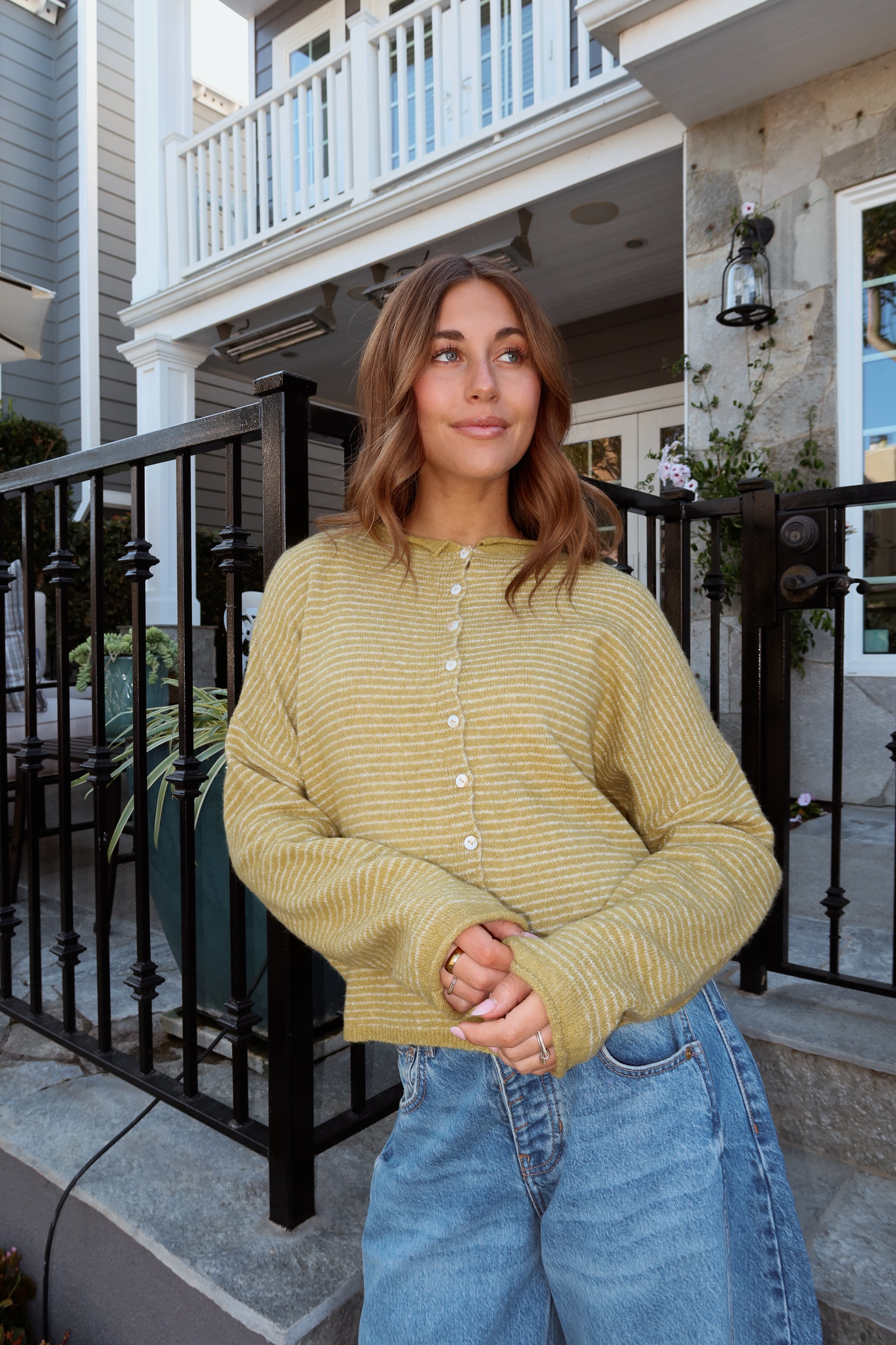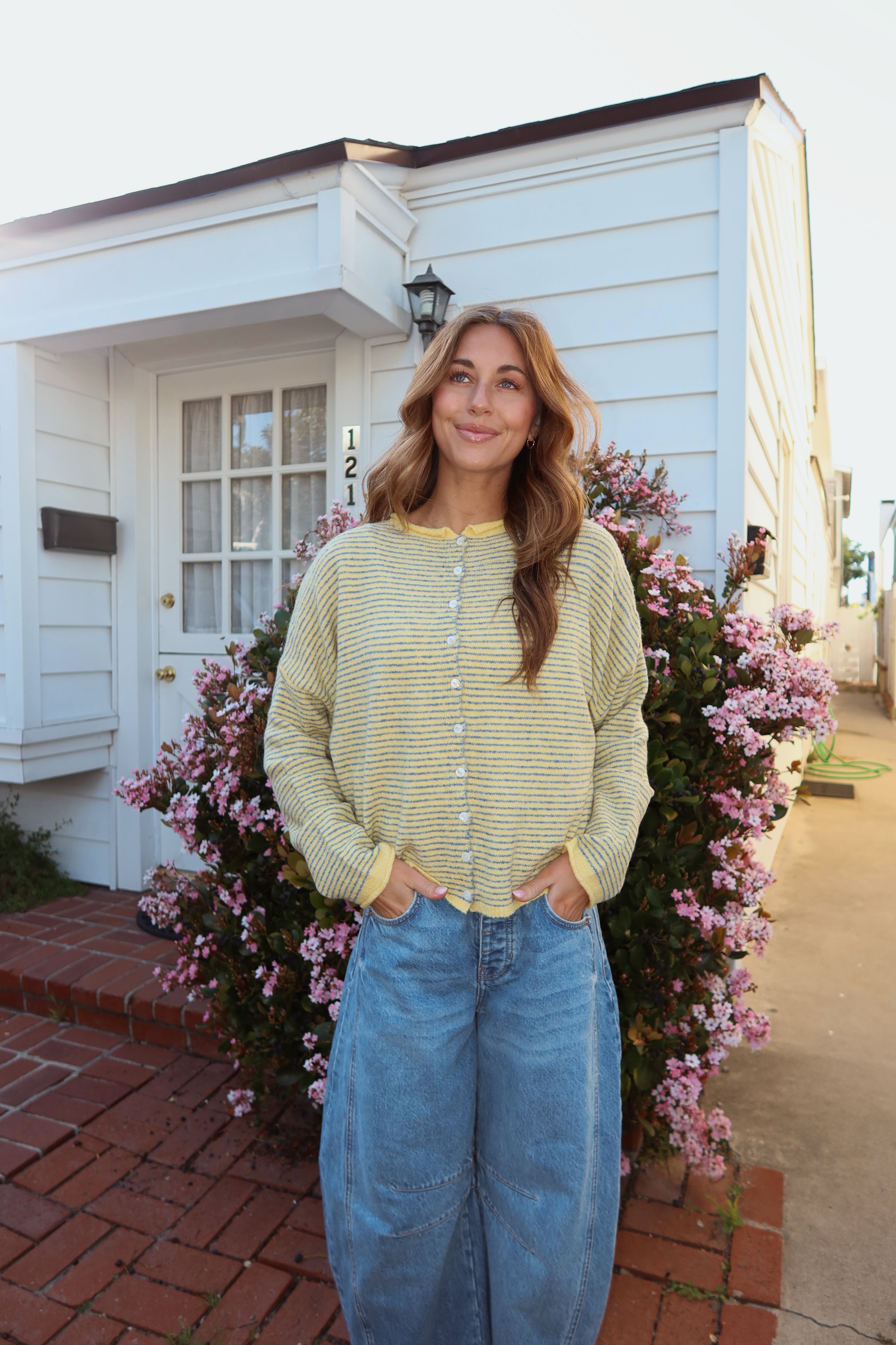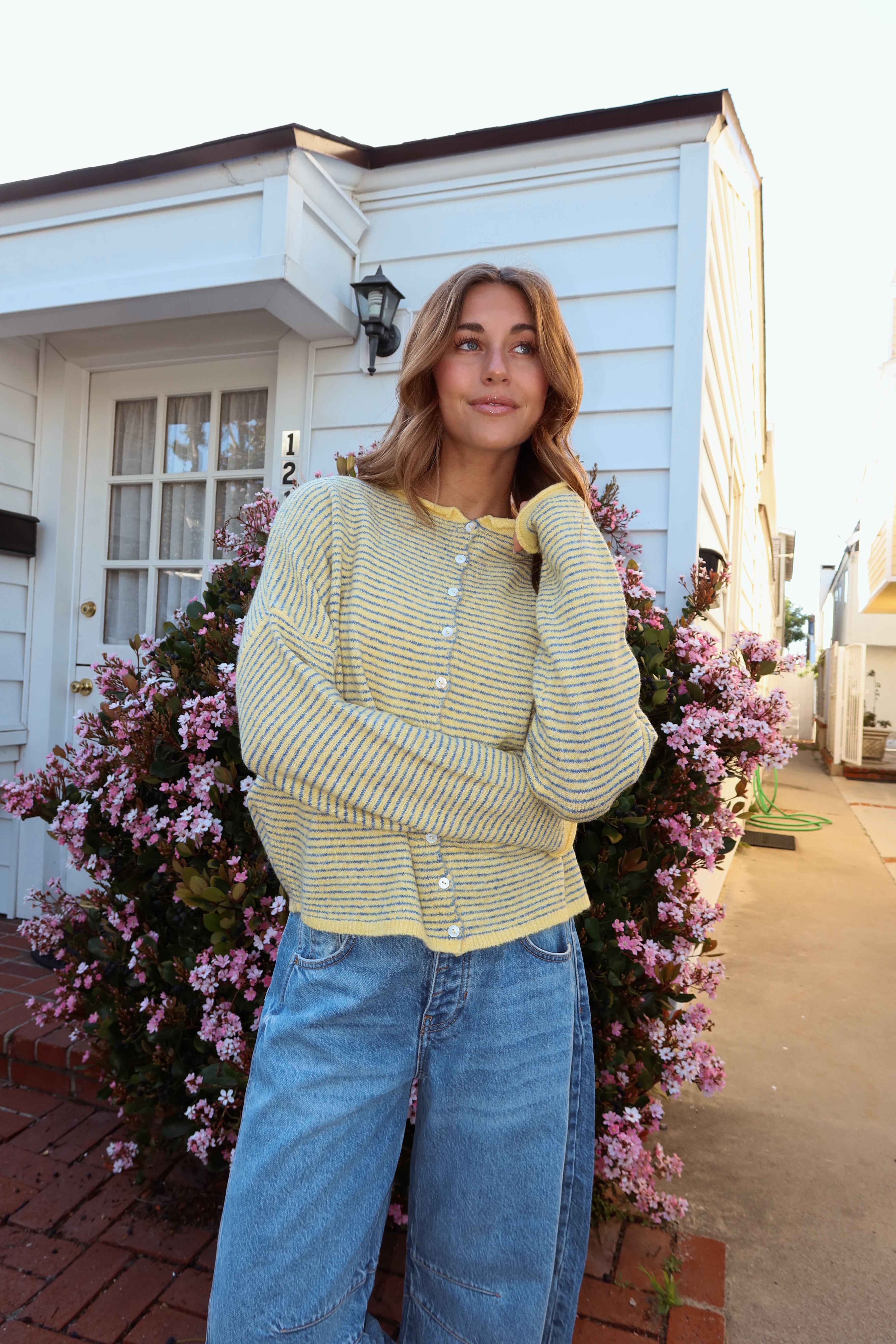 Piper Short Sleeve Cardigan in Butter Pinstripe