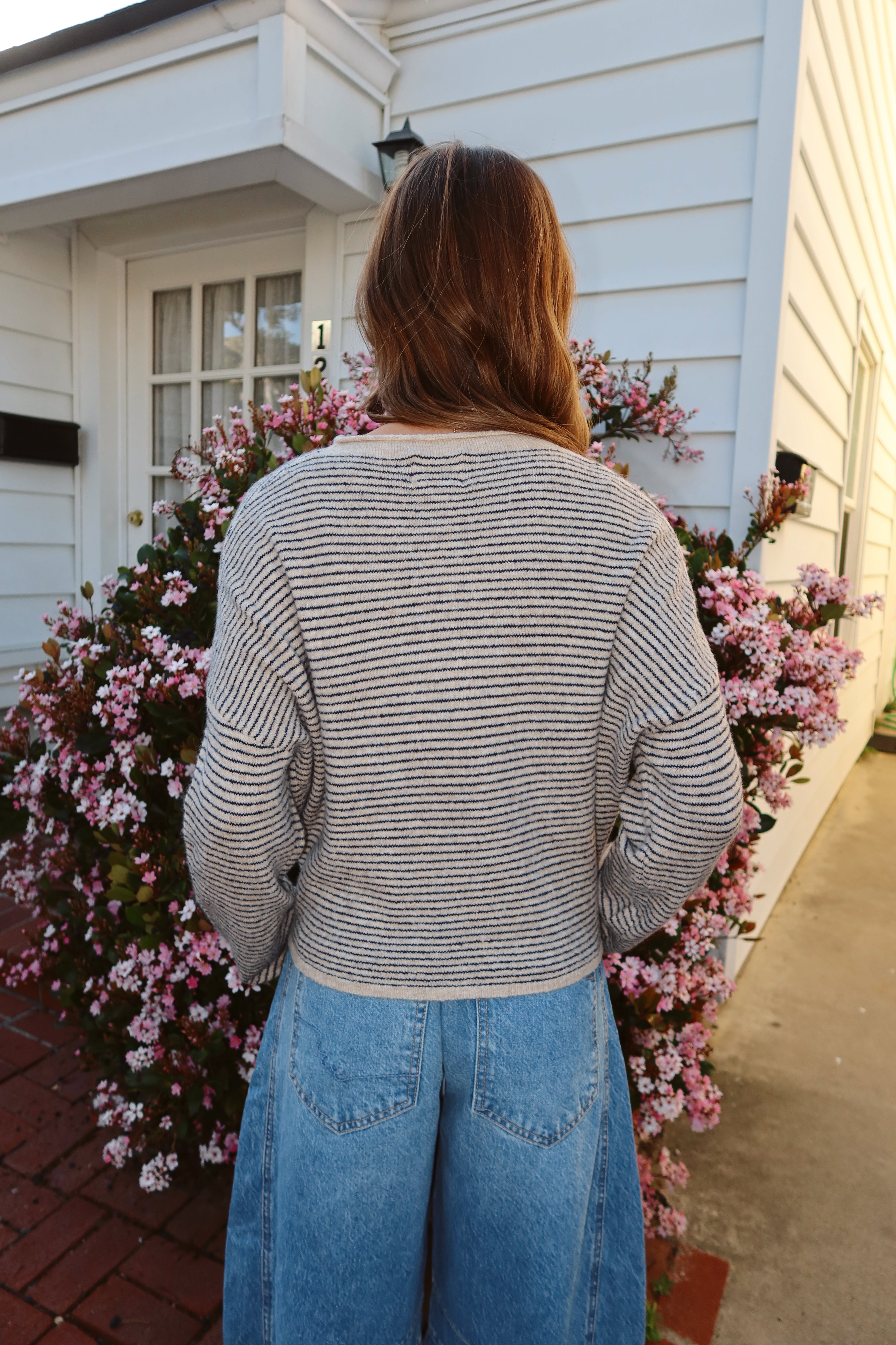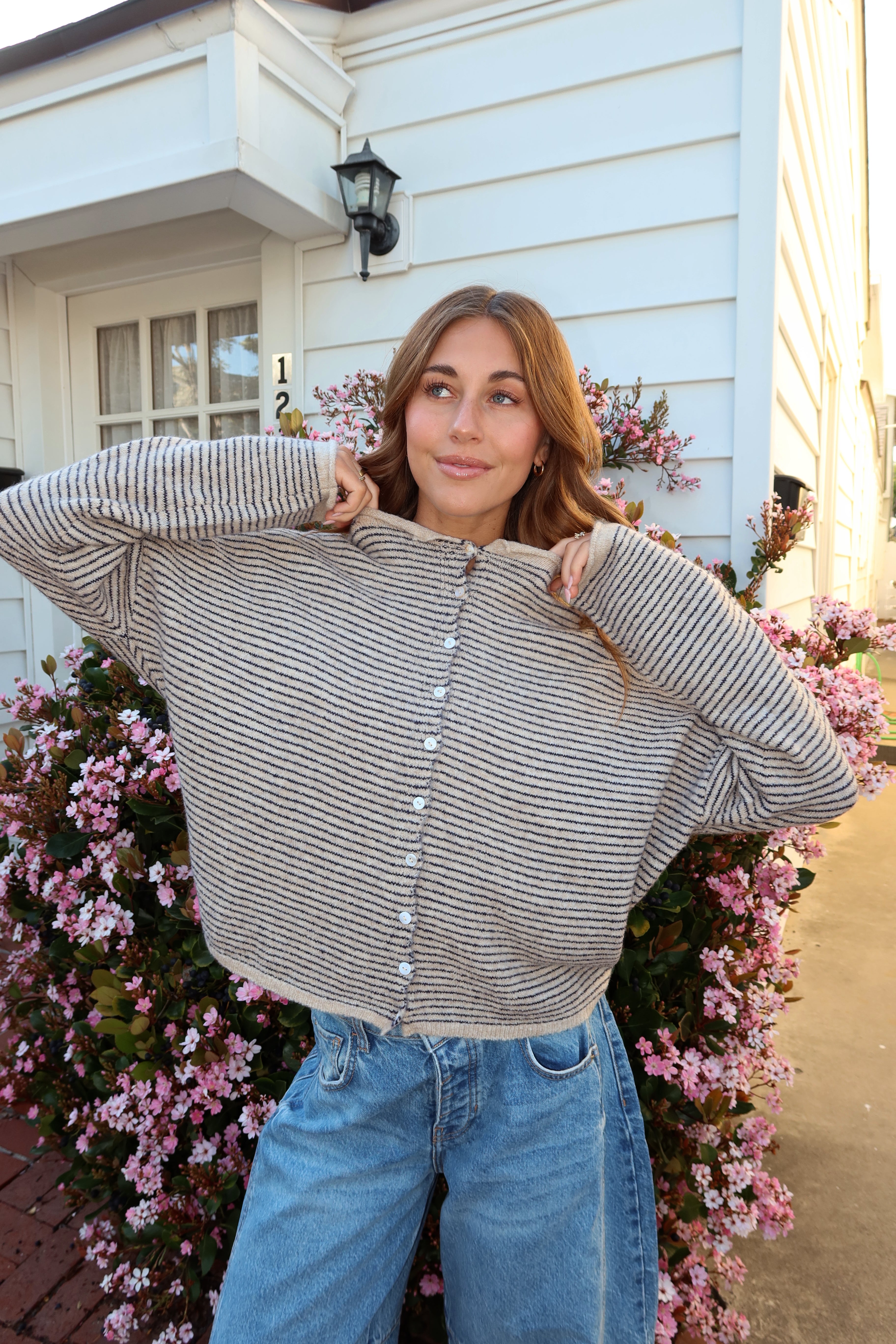 Piper Short Sleeve Cardigan in Tan & Navy Pinstripe