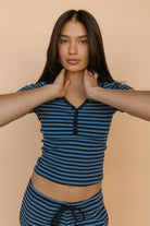 Main details: Soft ribbed stripe fabric with snap closure front. Possibly nursing friendly