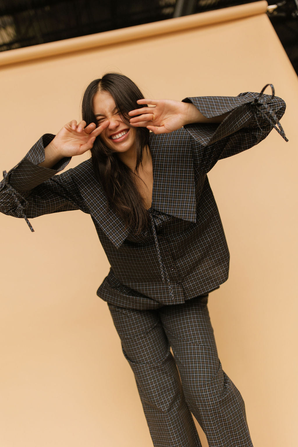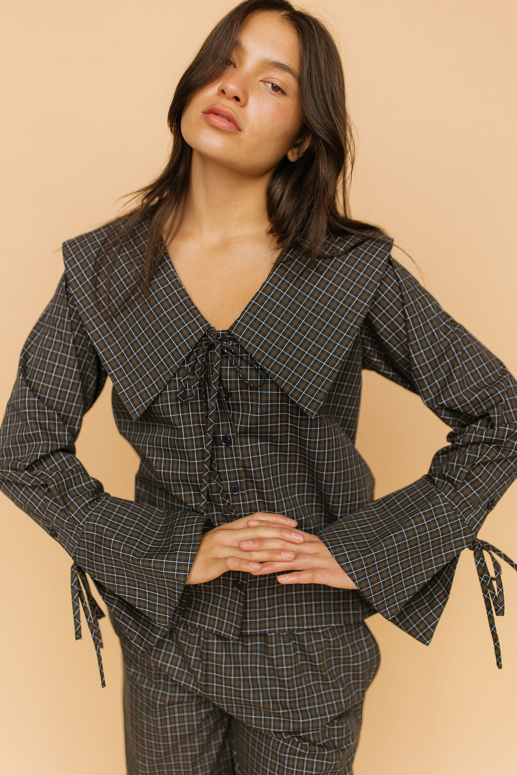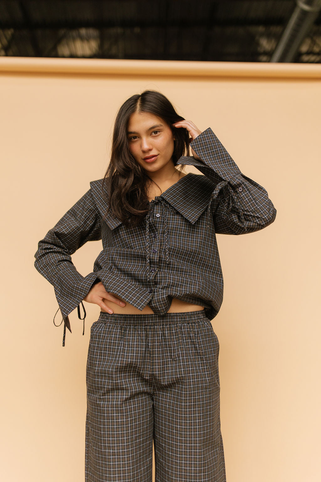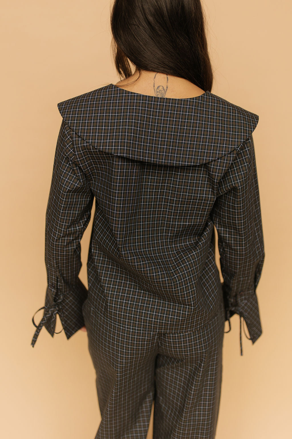 Details: Dark navy plaid with oversized collar. Nursing friendly