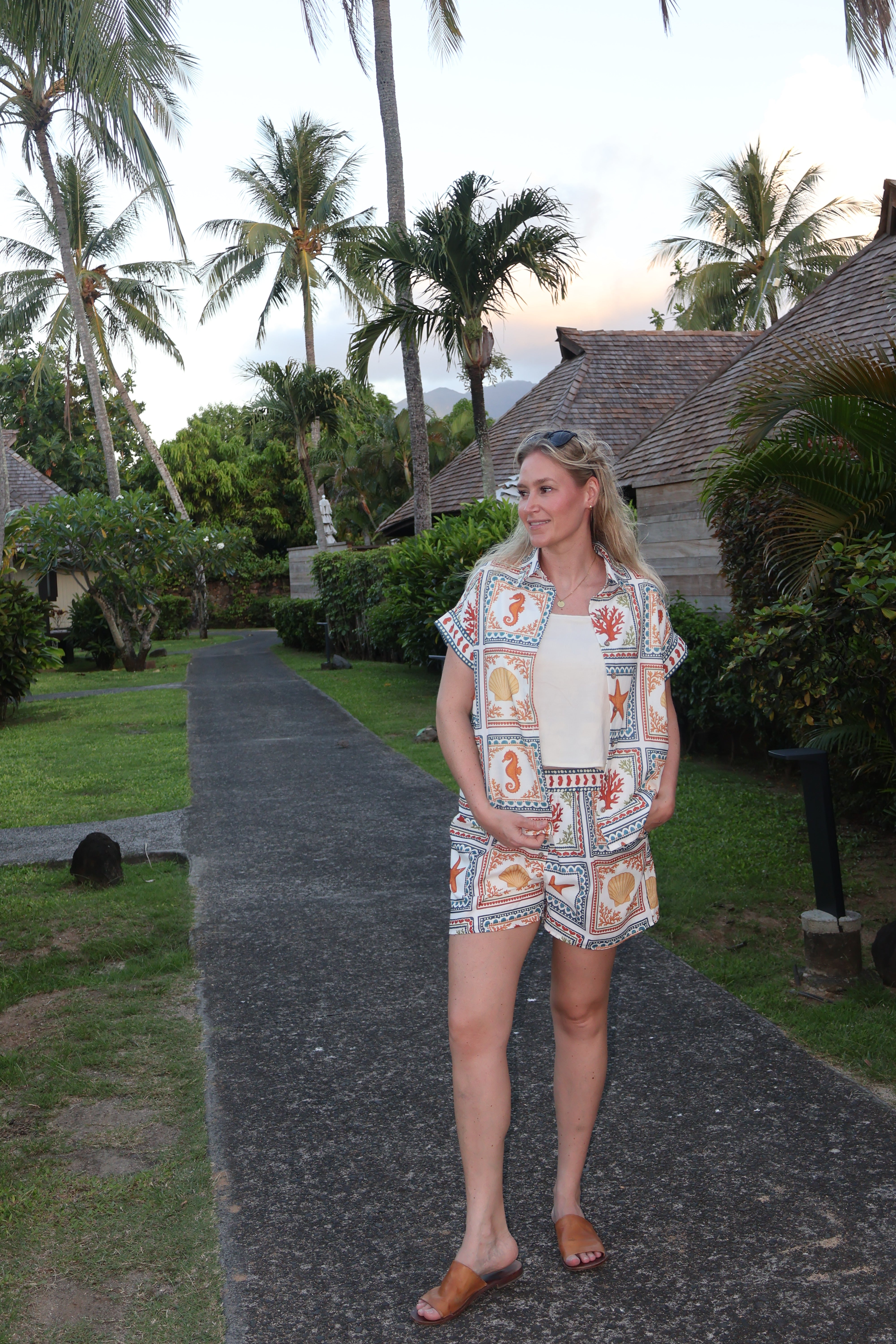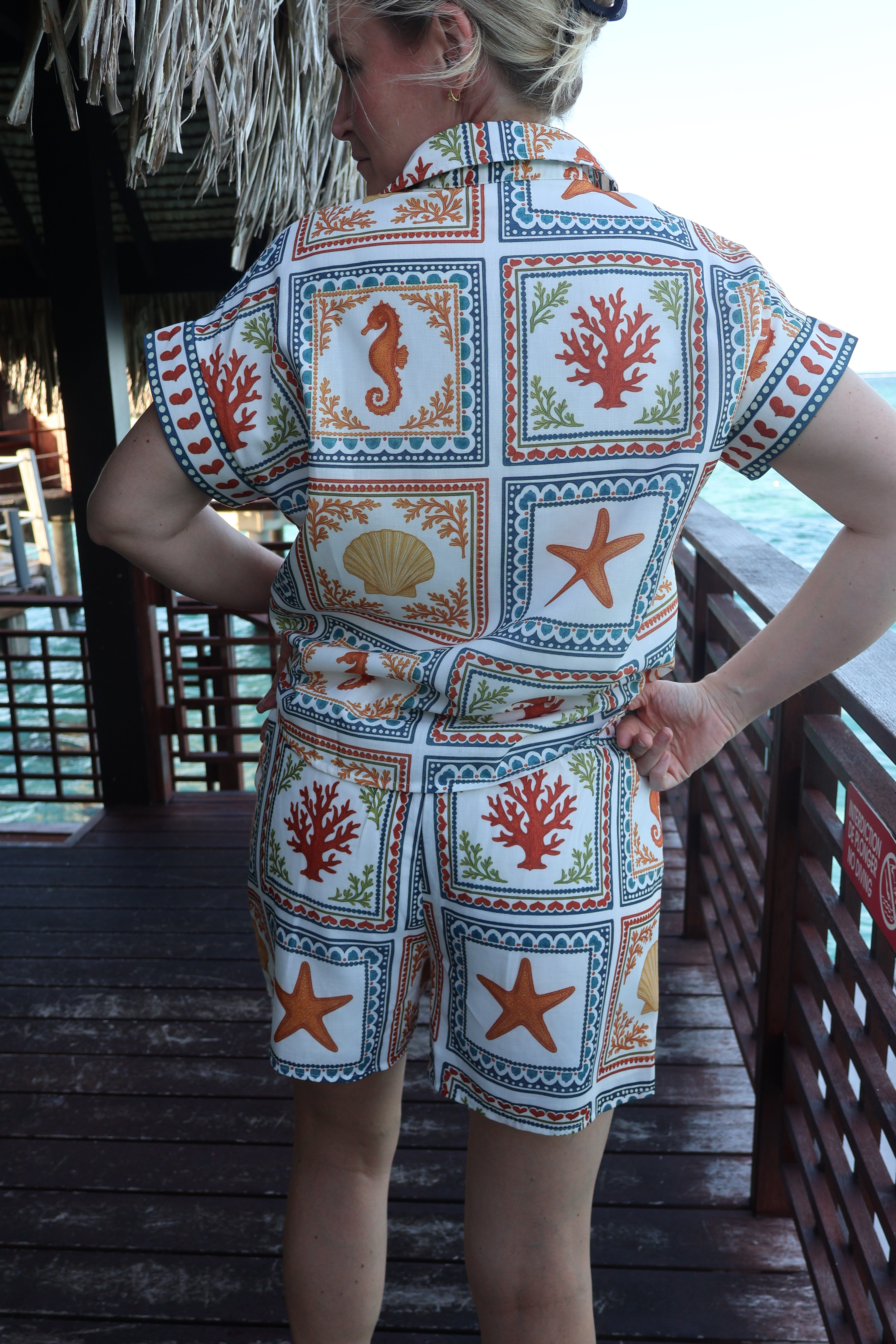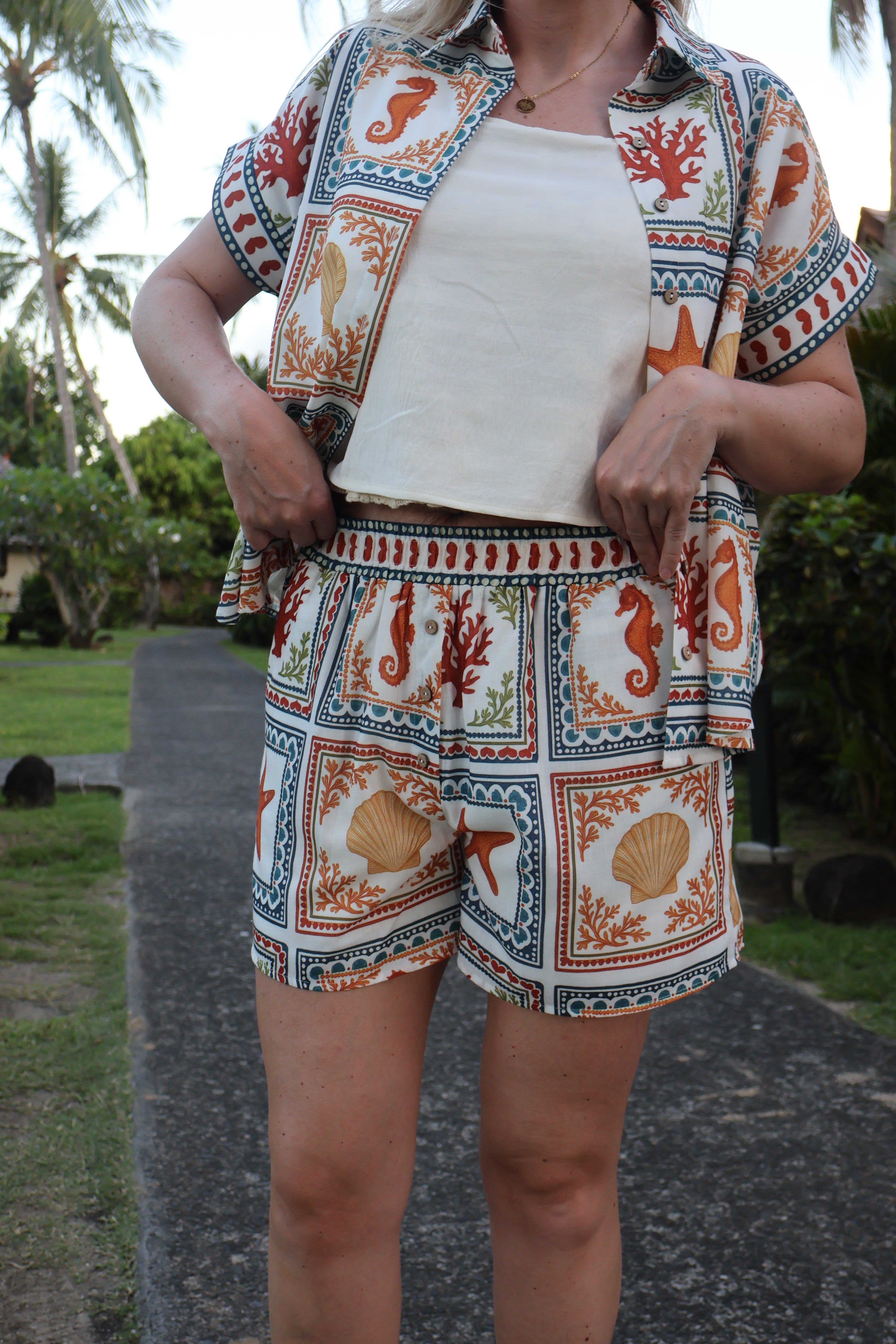Details: Fun stamped seaside print shorts with side pockets. Beautifully made high quality! Perfect paired as a set with the Under The Sea top, or worn on their own with a cute tank or tee or lightweight cardigan. Perfect for days at the beach, they would make cute shorts coverups! Soft elastic waistband