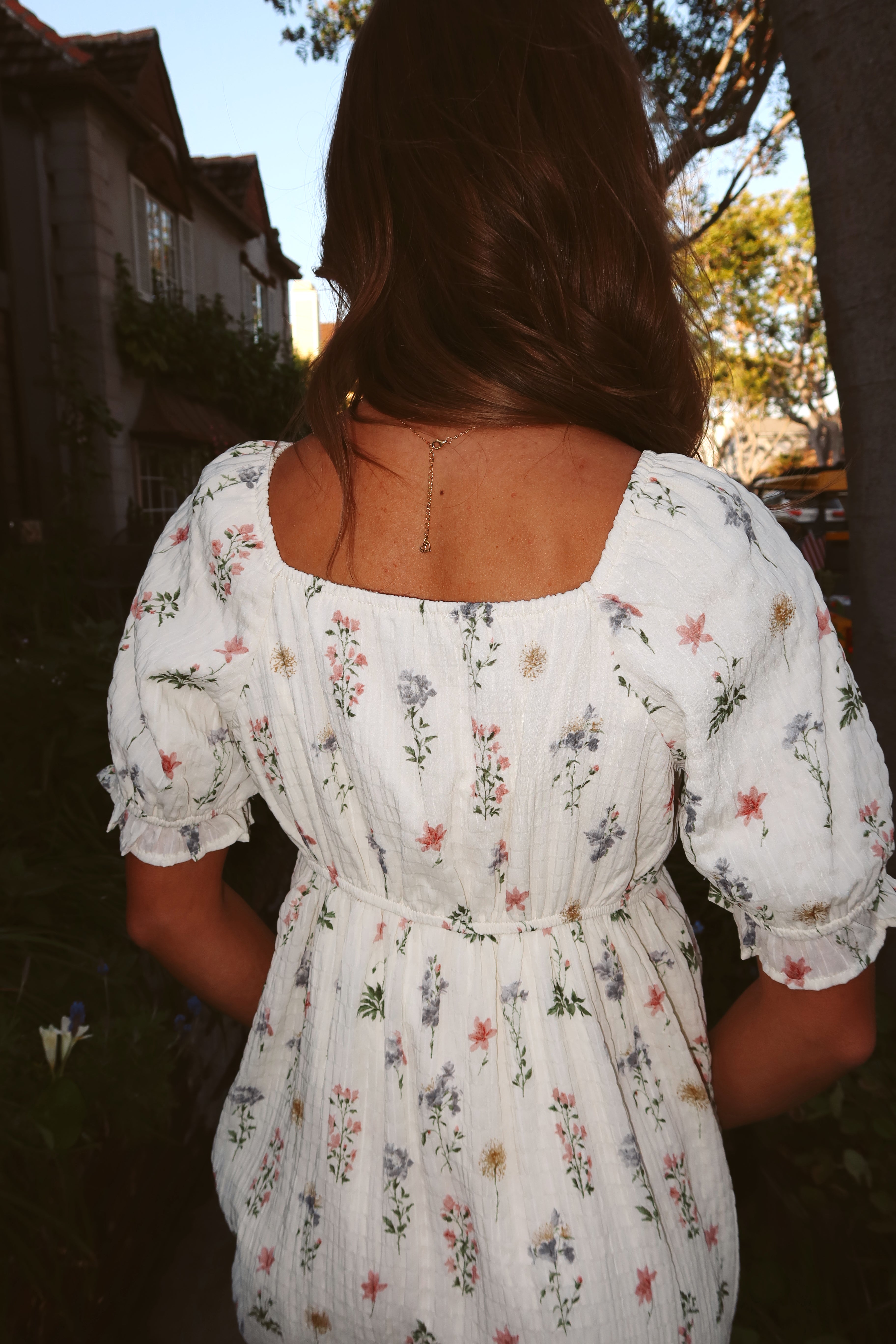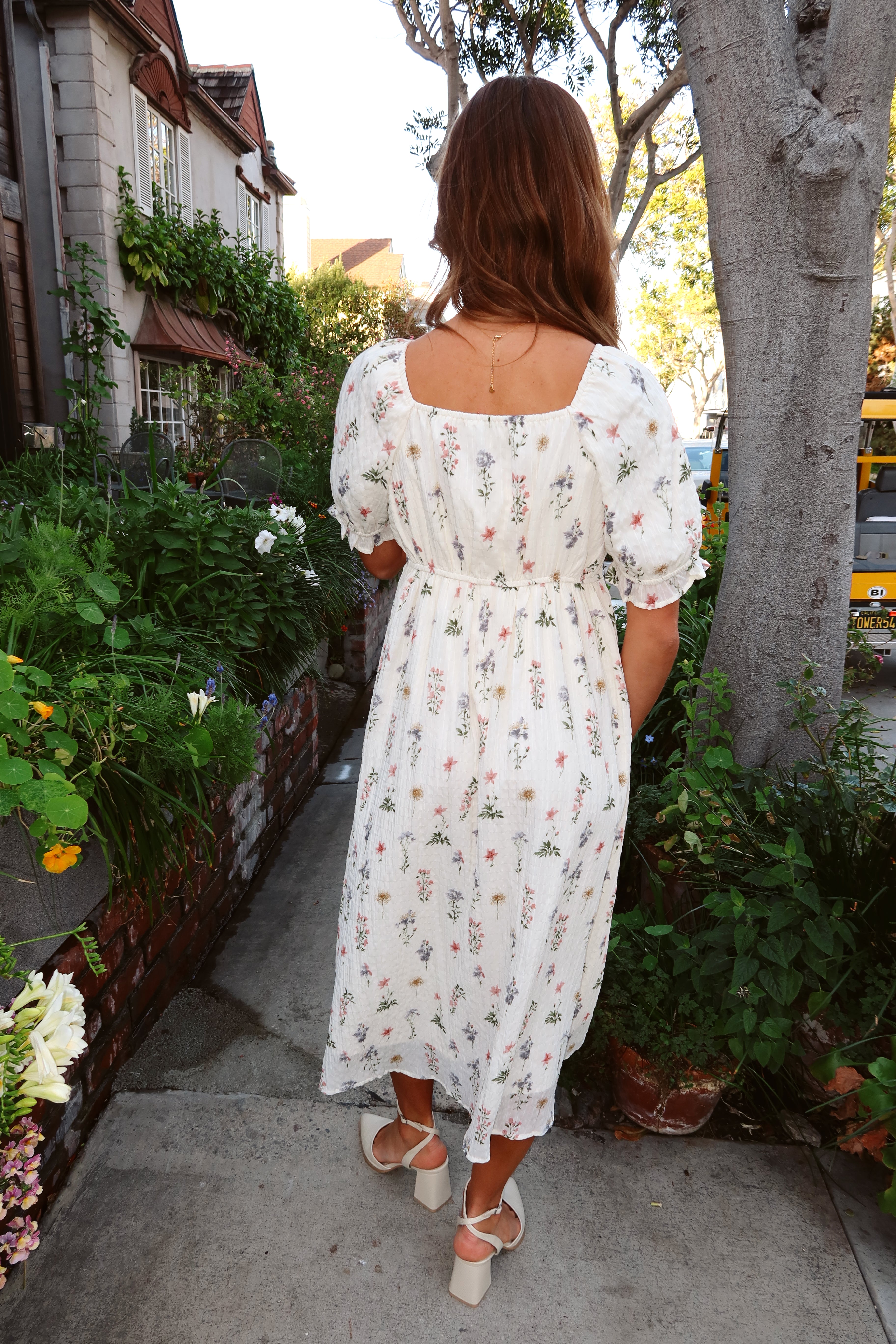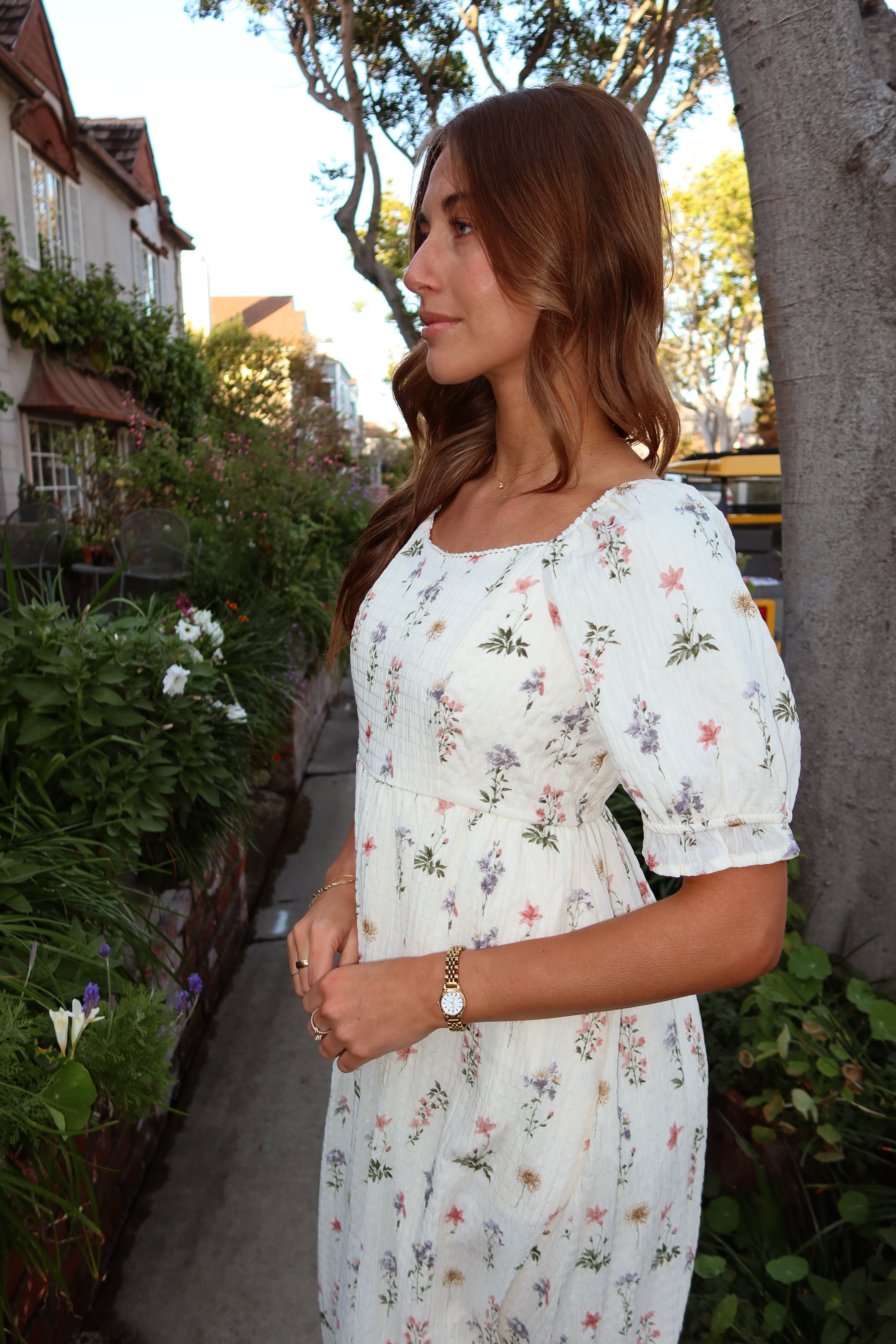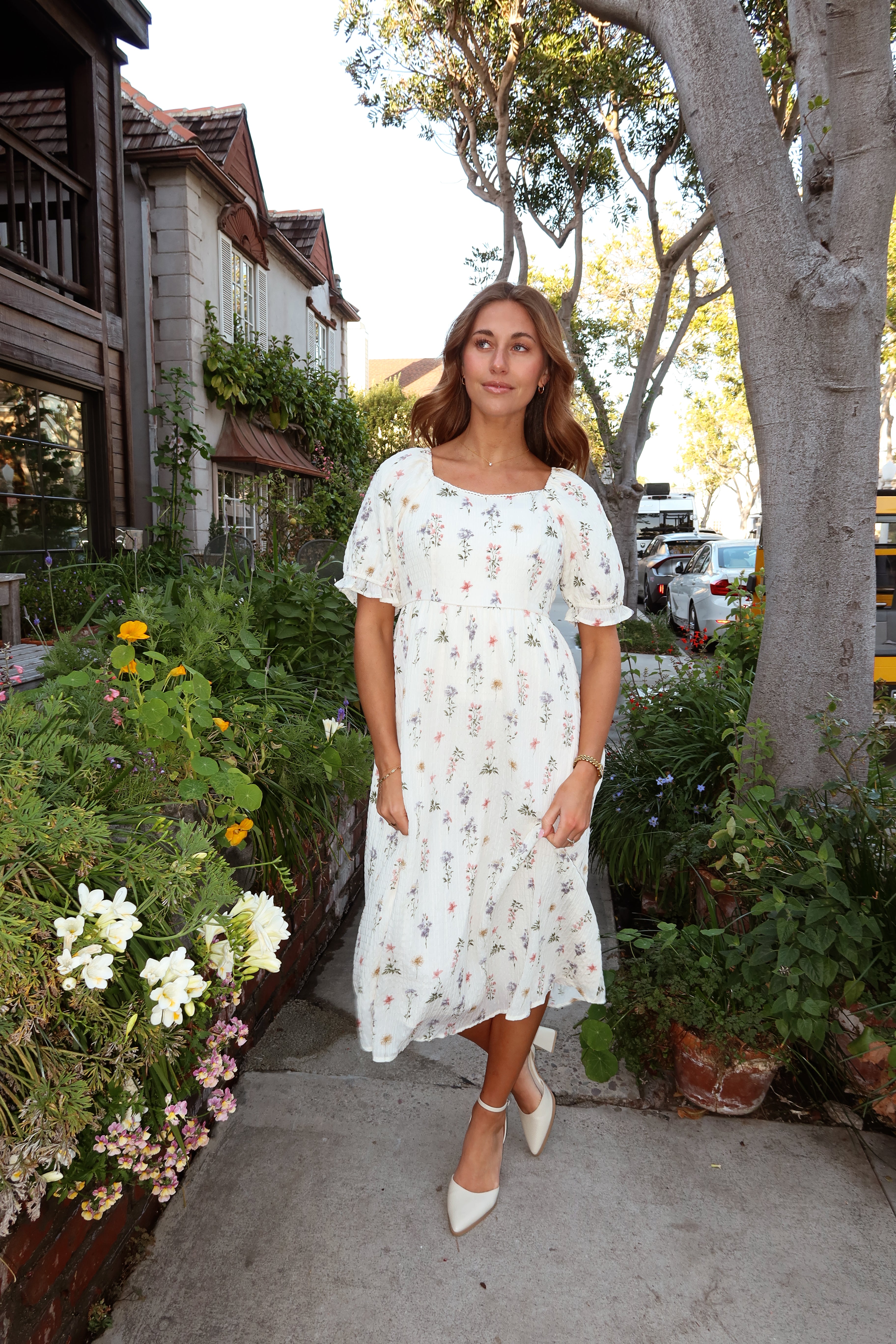 Main details: Textured wildflower print dress with square neckline and puff sleeves. Lined. Bump friendly