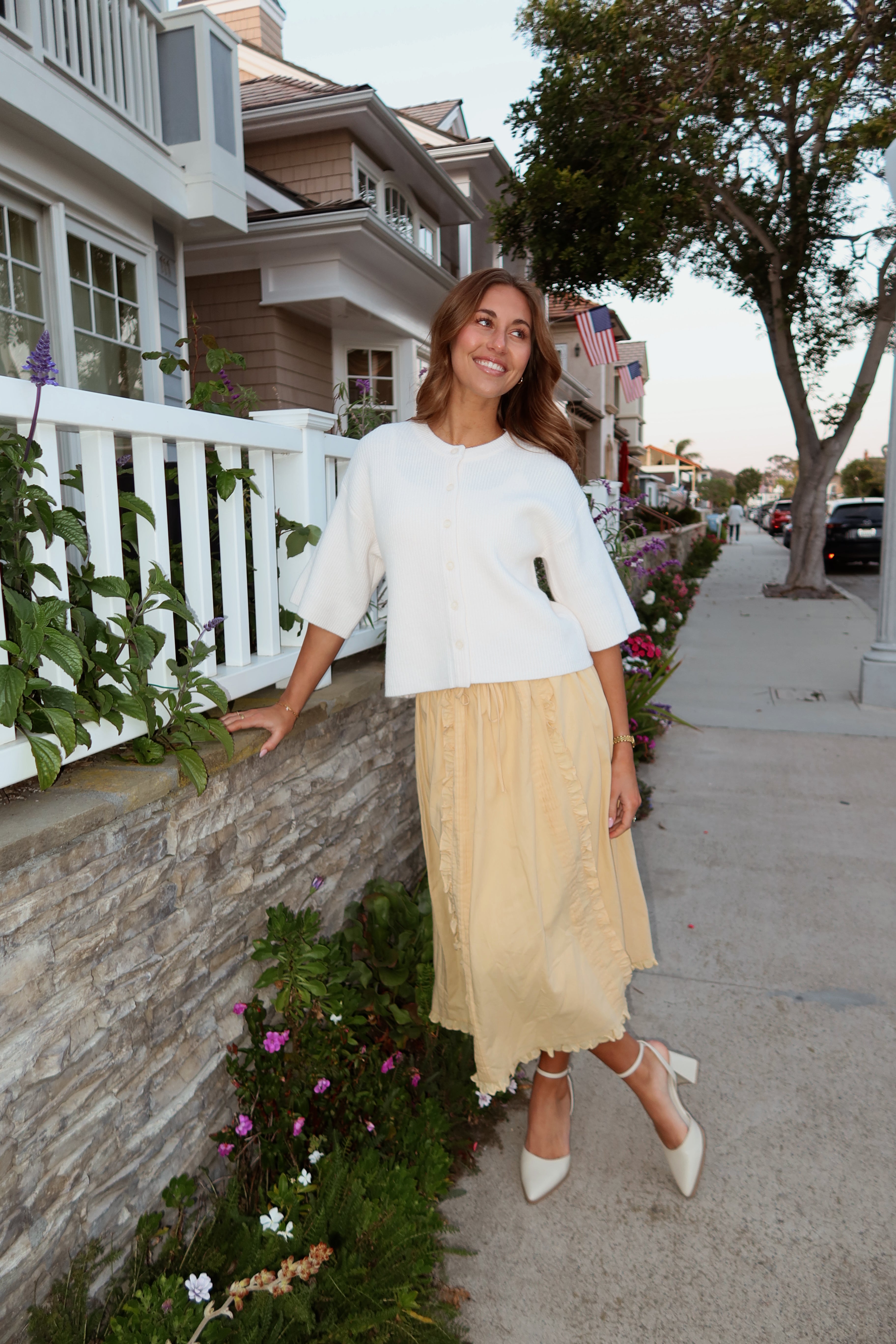 Main details: Solid cotton skirt with ruffle and pleated detailing. Soft elastic waistband. Lined