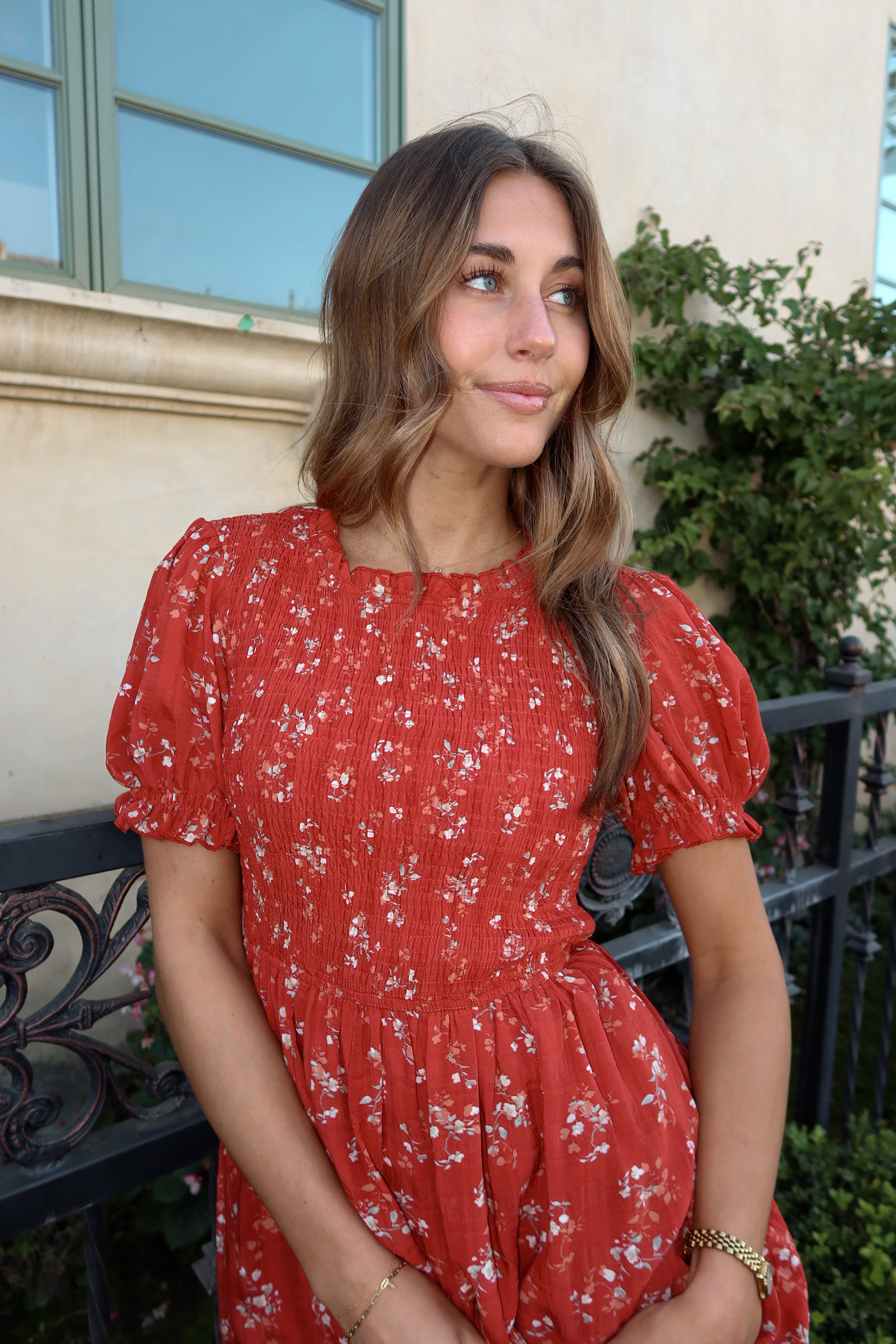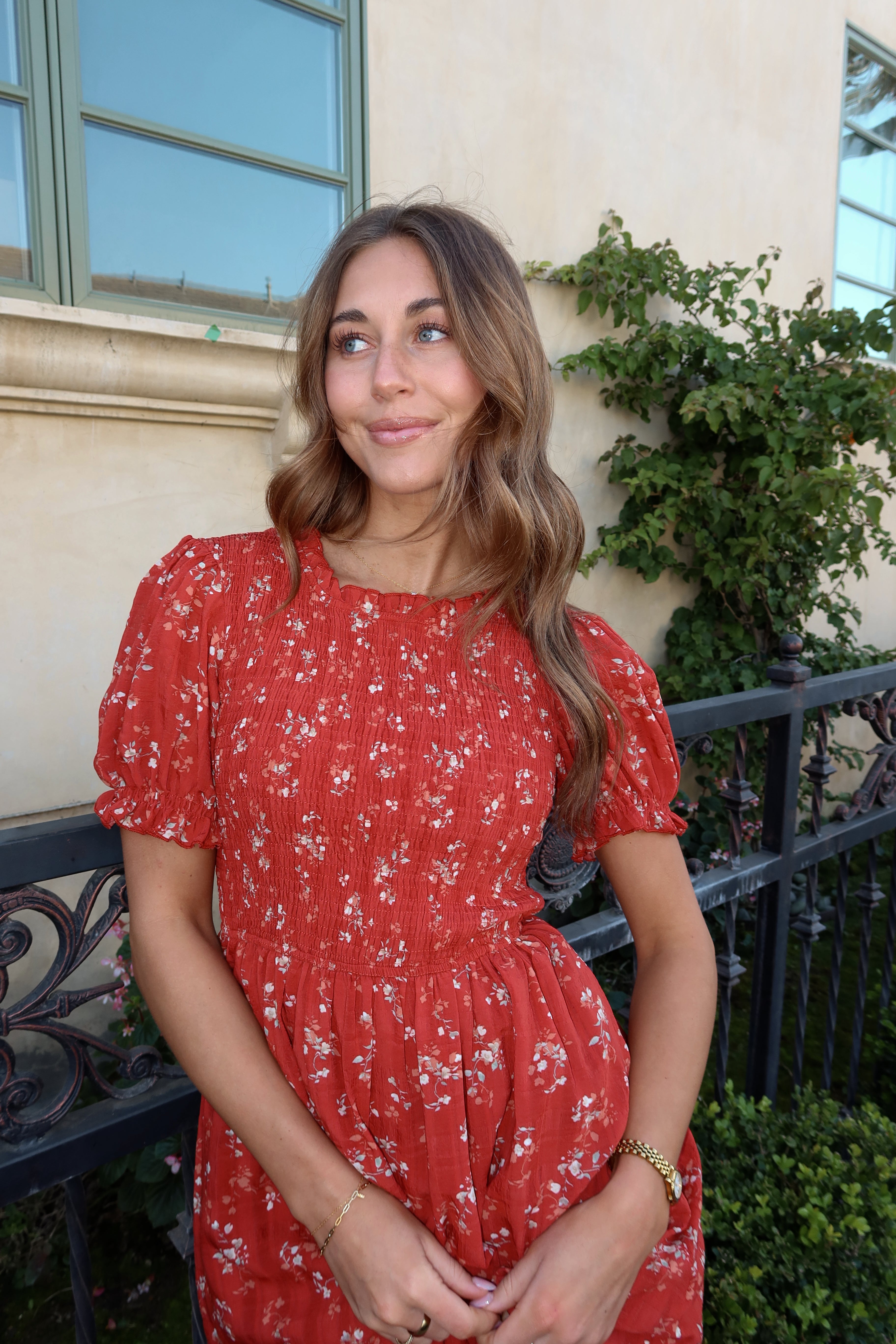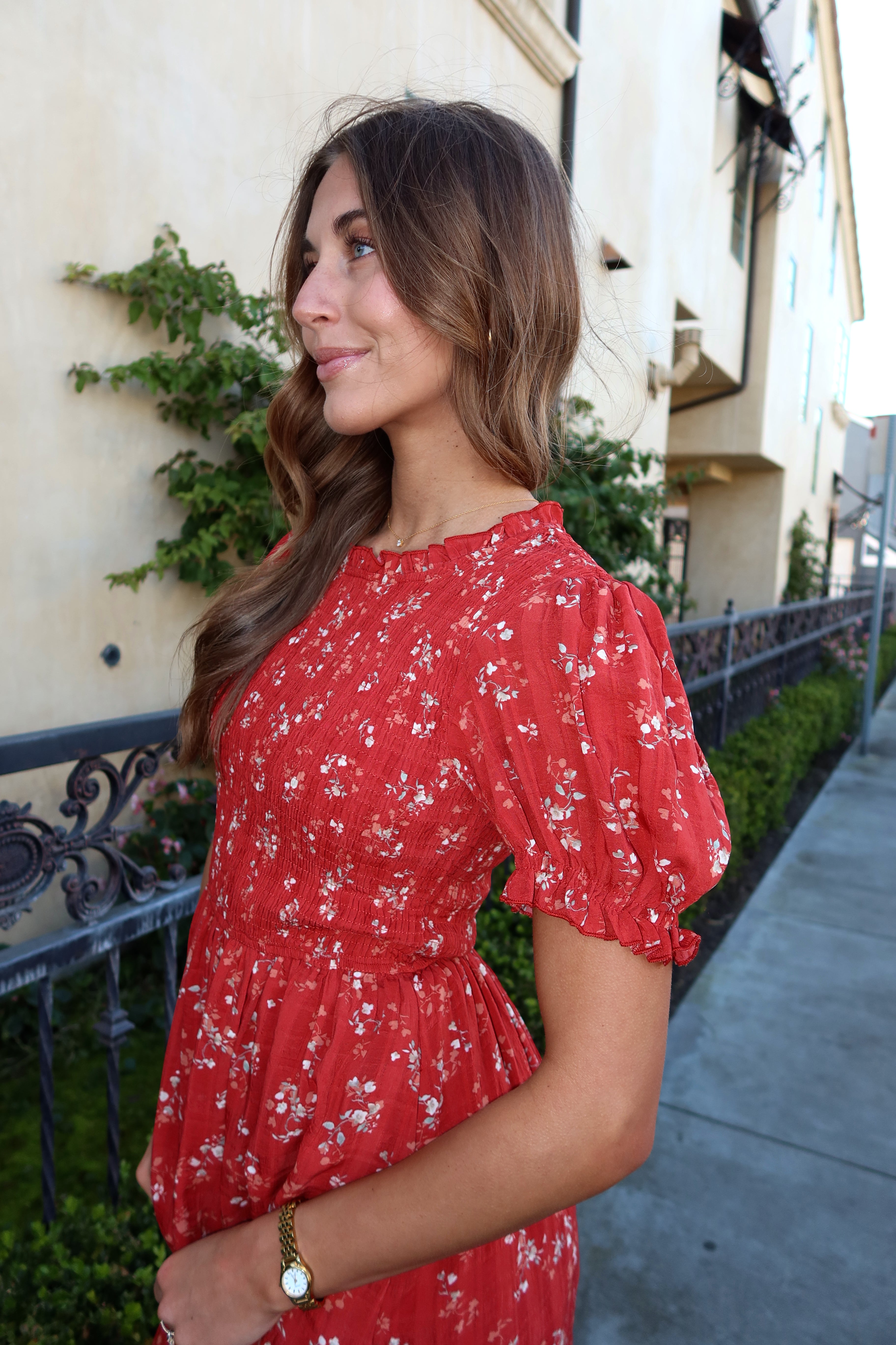 Main details: Red ditsy floral print dress with smocked bust and ruffle stitched neckline. Lined