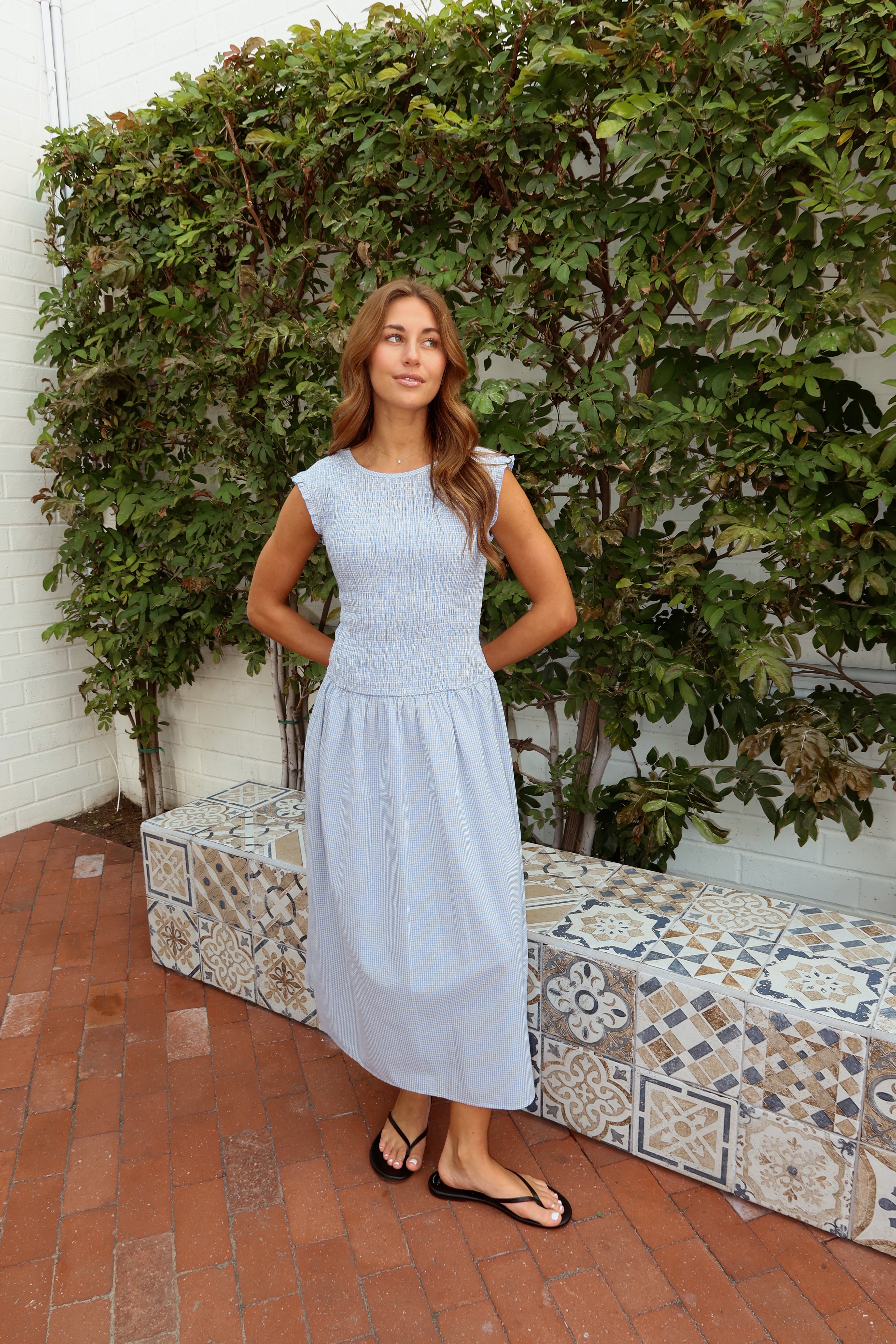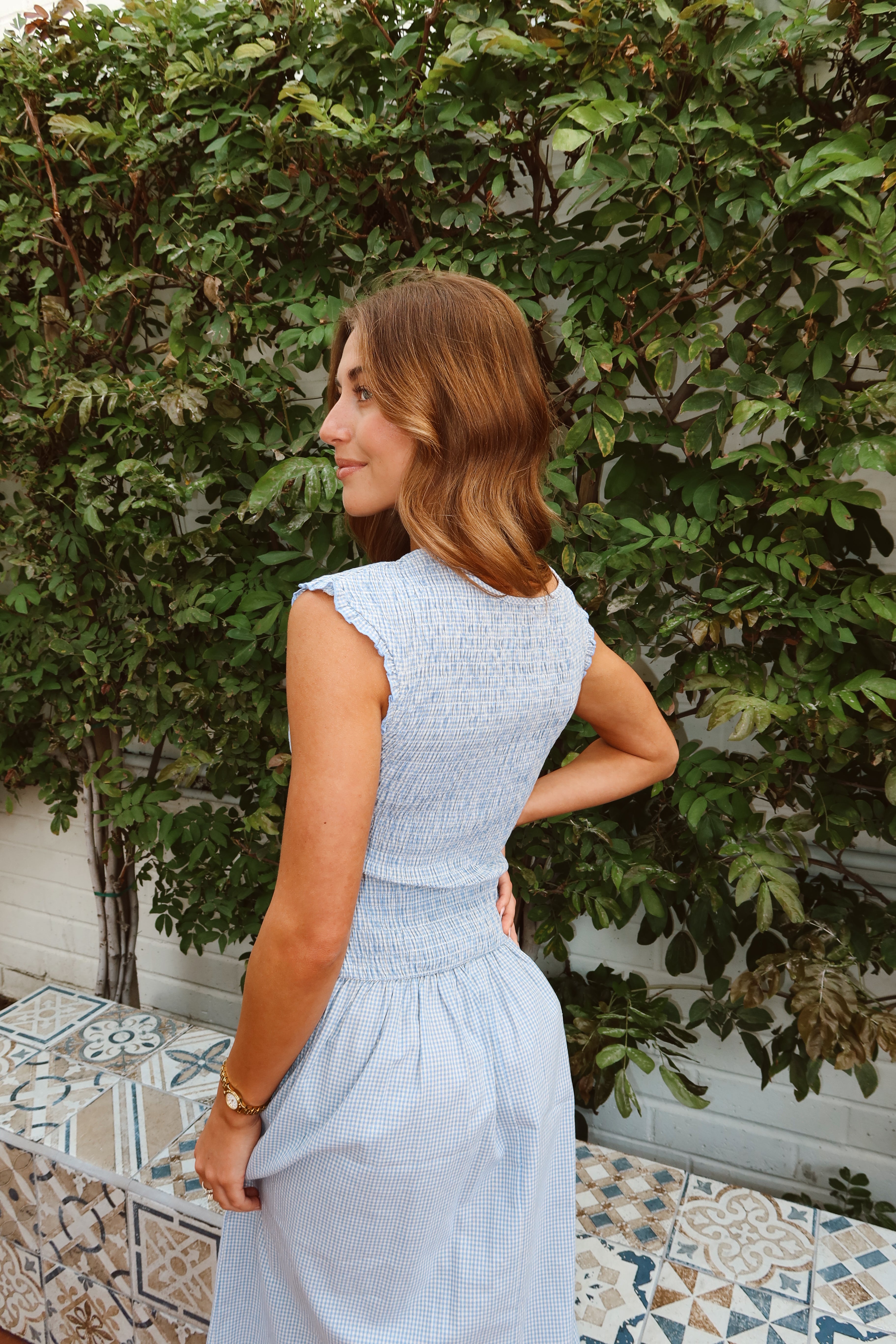 Main details: Micro gingham light blue smocked drop-waist dress with tank sleeve