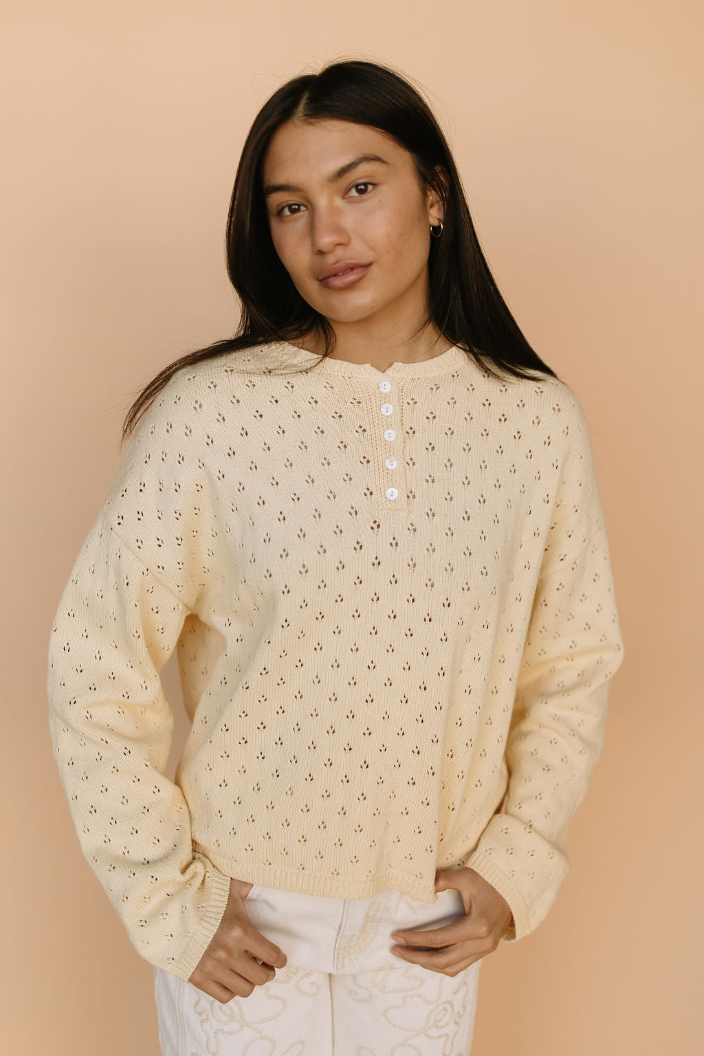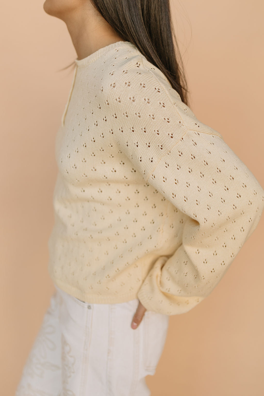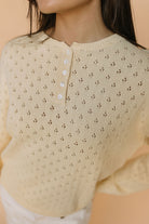 Main details: Pointelle knit sweater with button front. Possibly nursing friendly
