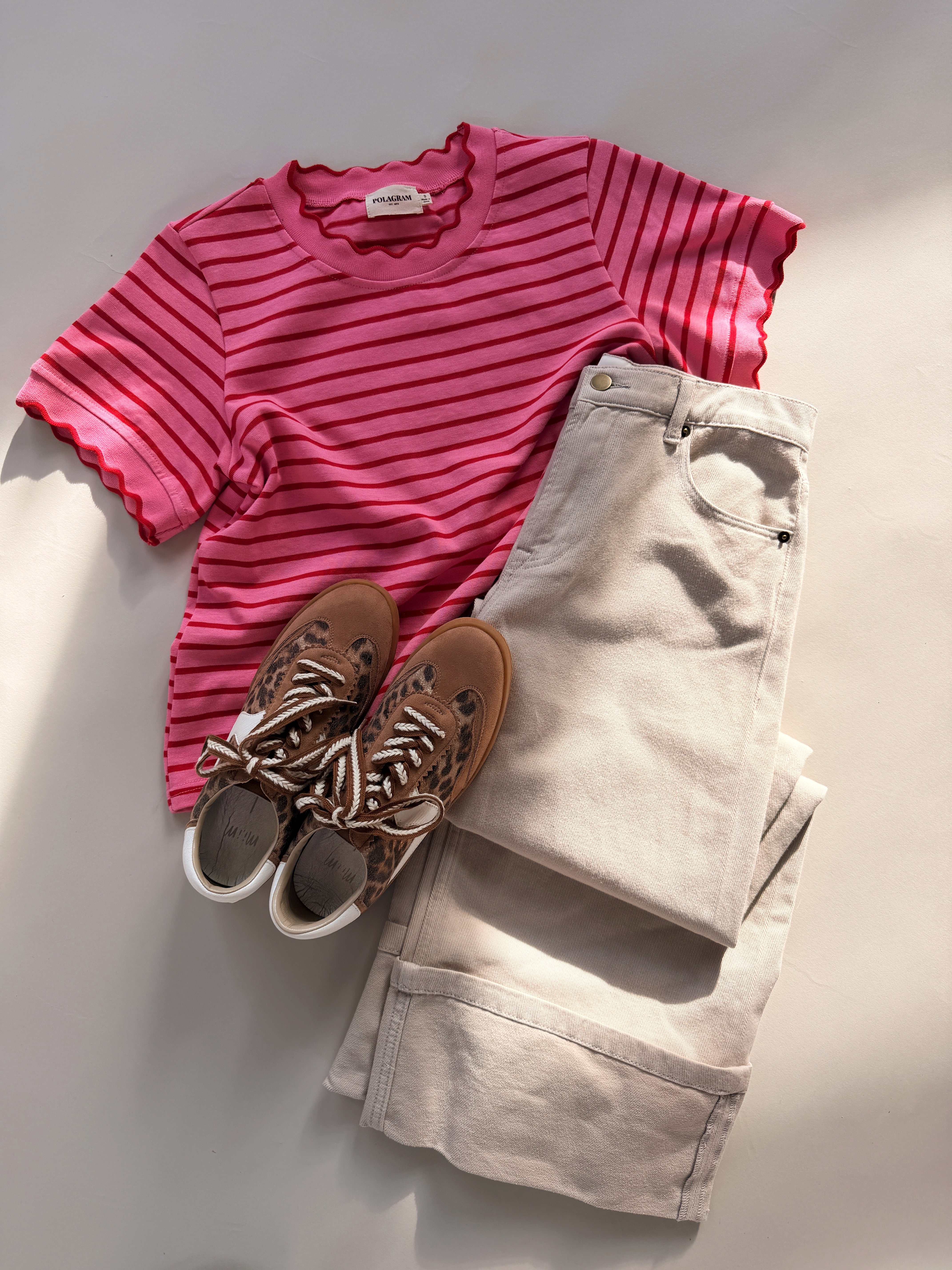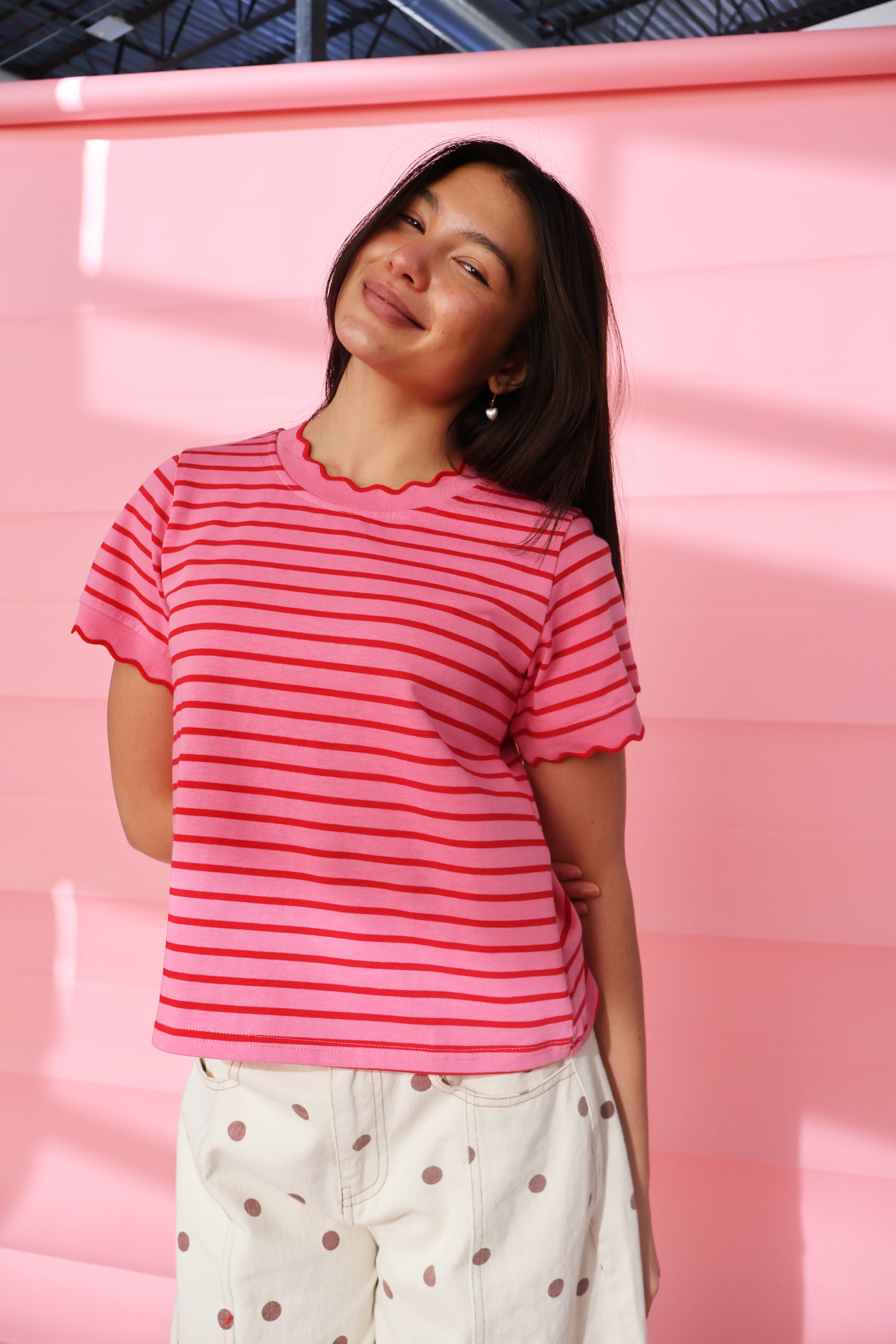 Main details: Pink and red stripe tee with scallop trim details. Sturdy fabric, not a lot of stretch
