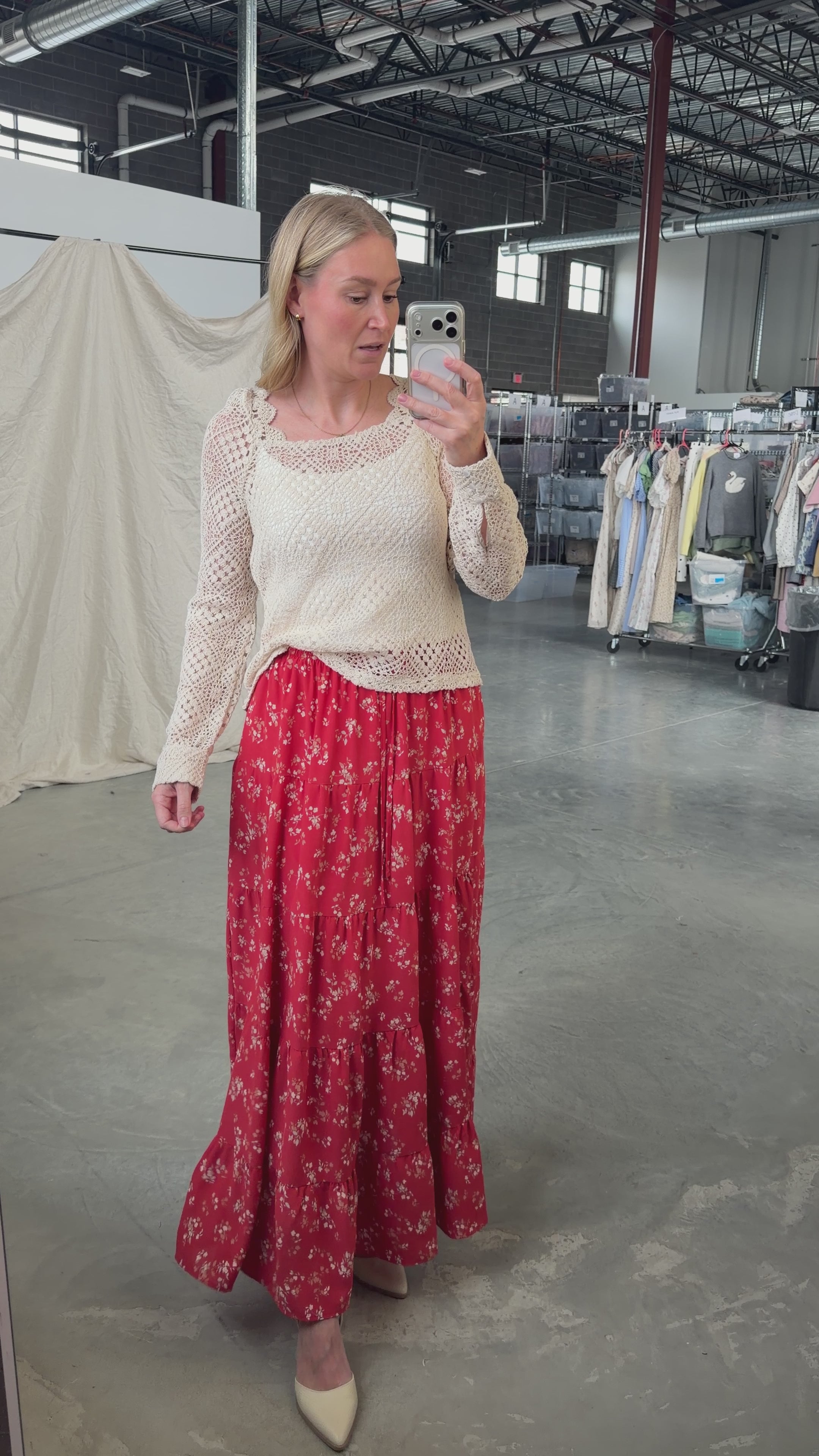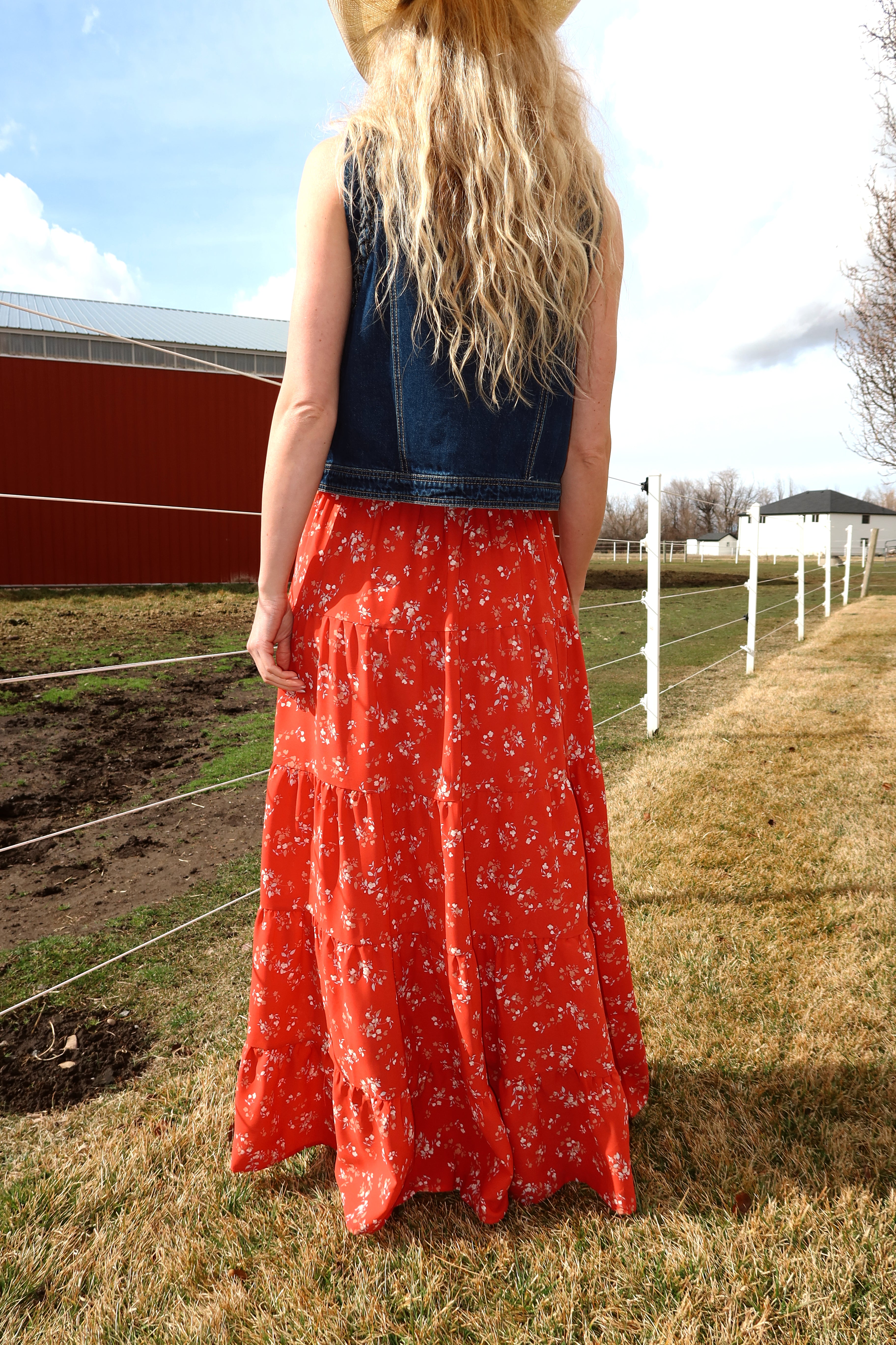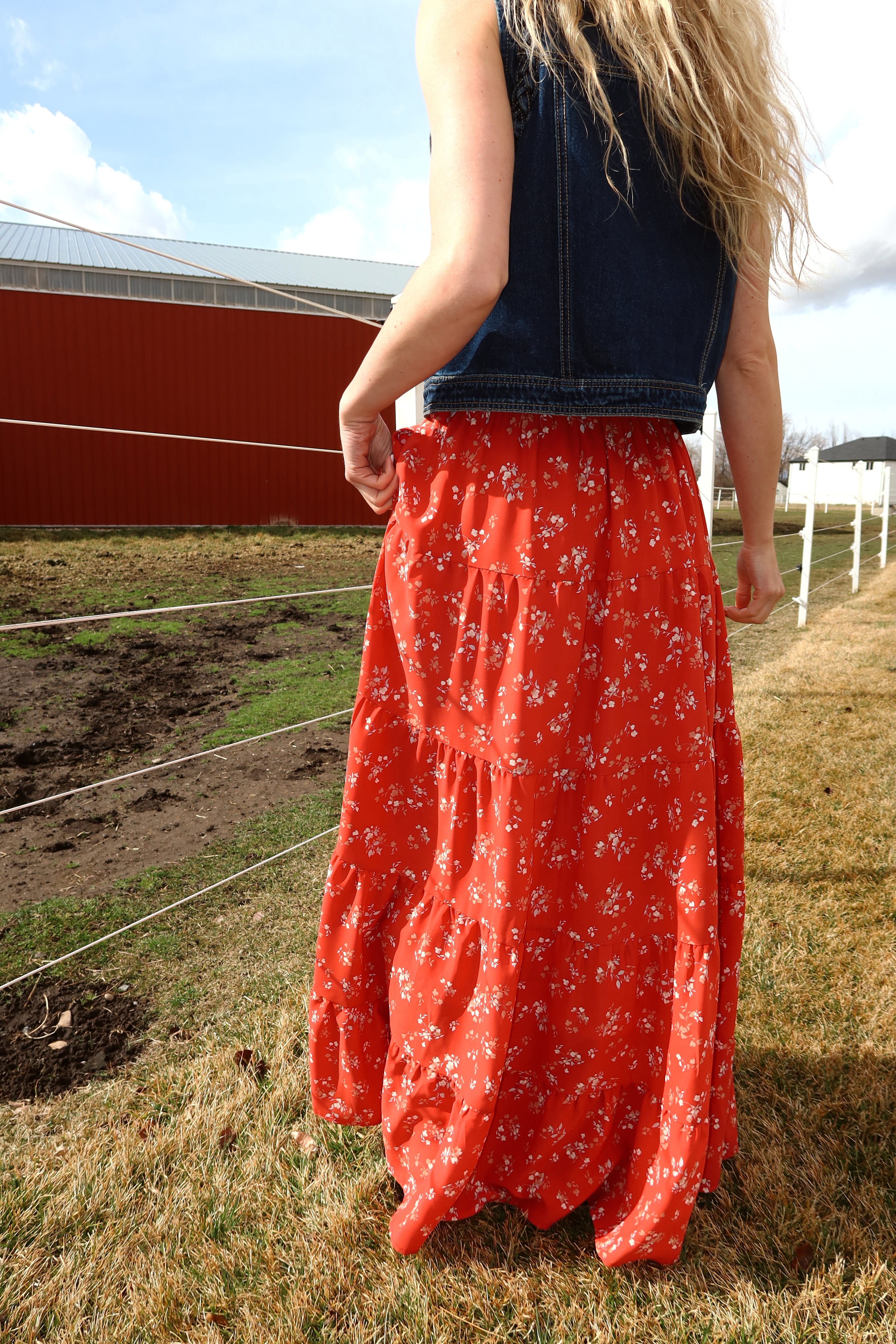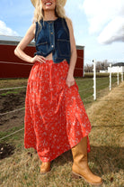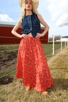 Main details: Red ditsy floral maxi skirt with soft thin elastic and functional drawstring. Plenty of room in this can EASILY size down