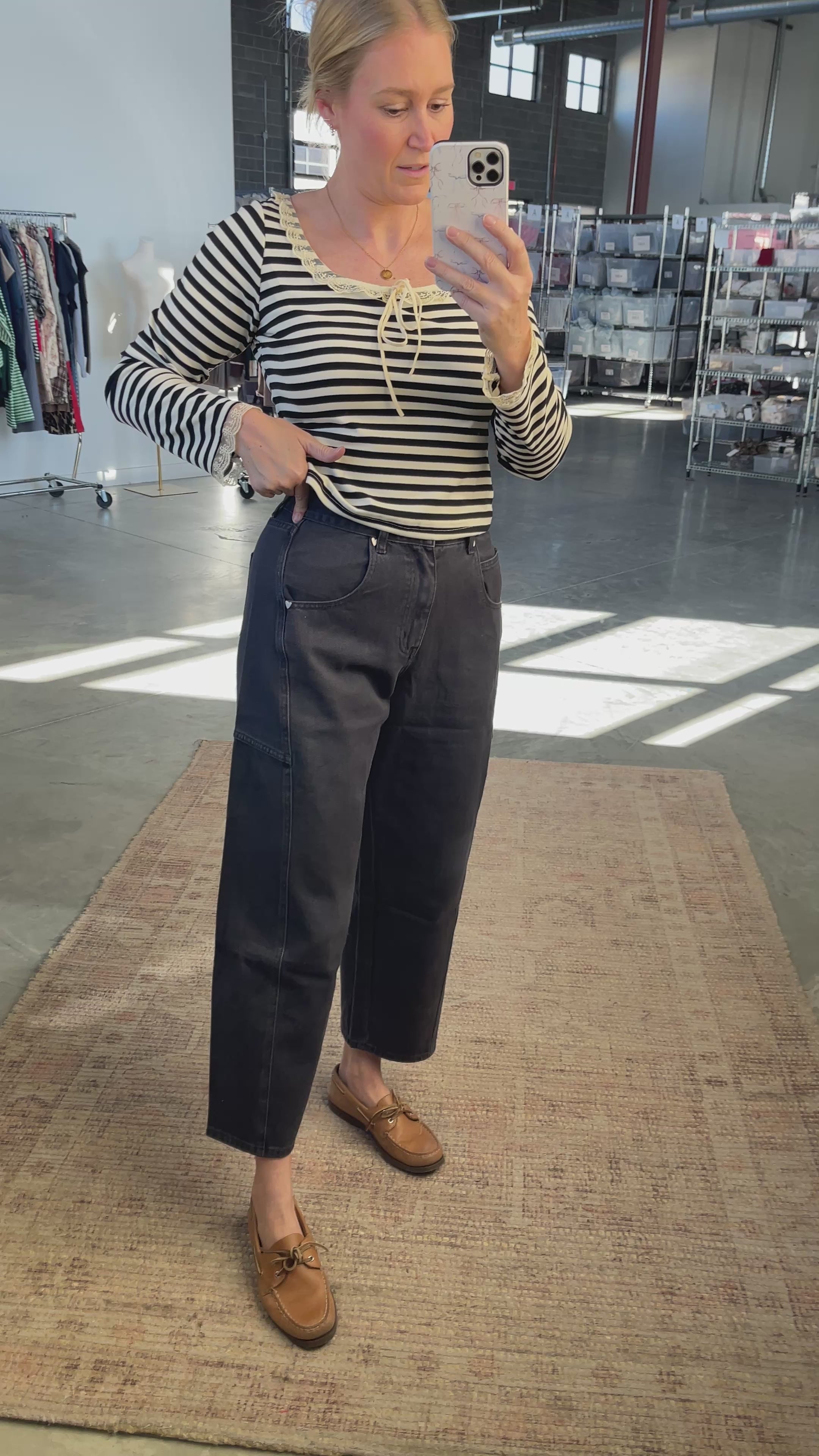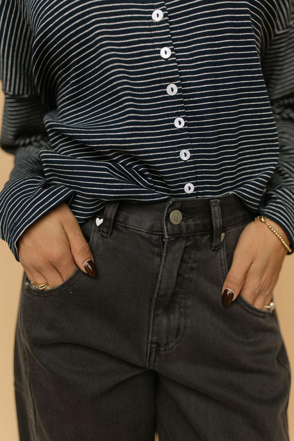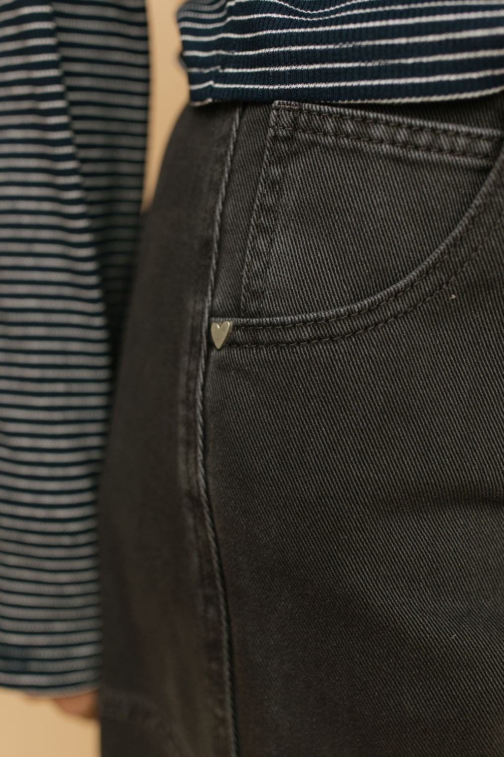 Details: Black denim subtle barrel jean style with cute split seam pocket detail and metal heart details