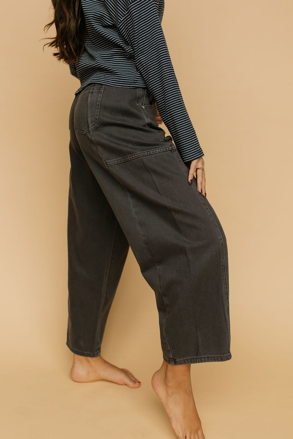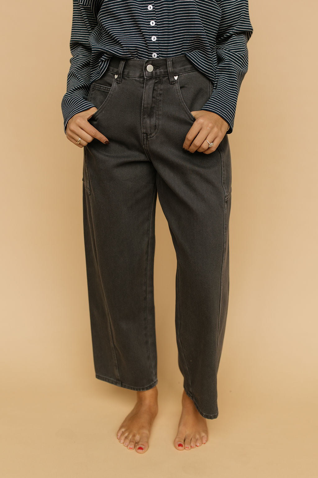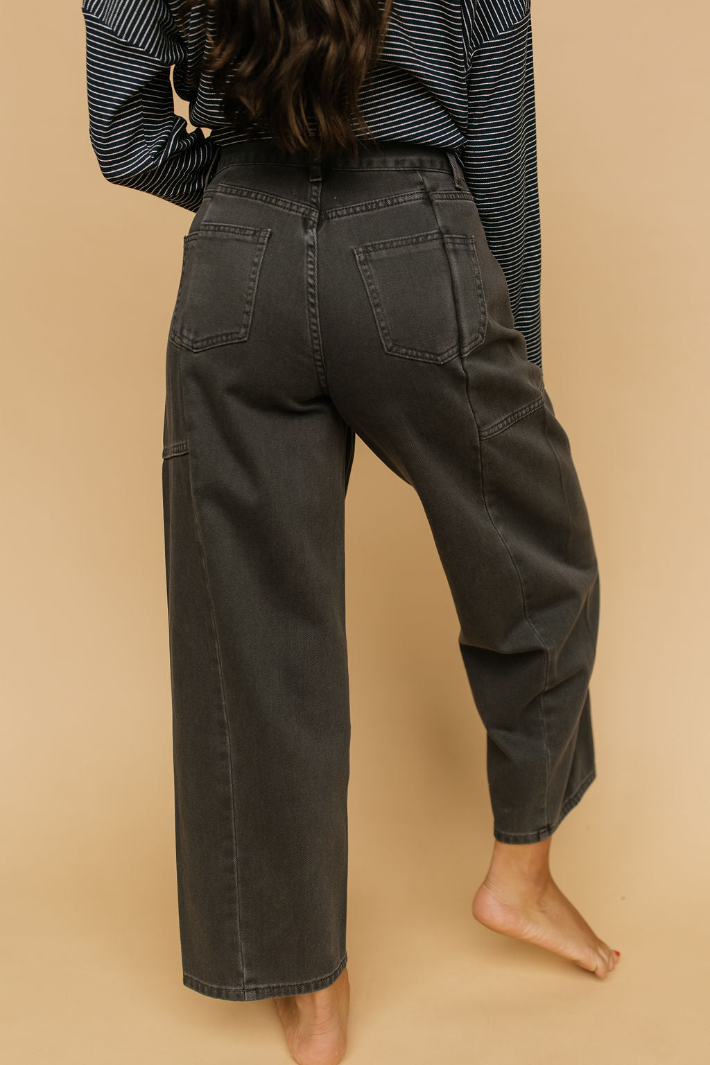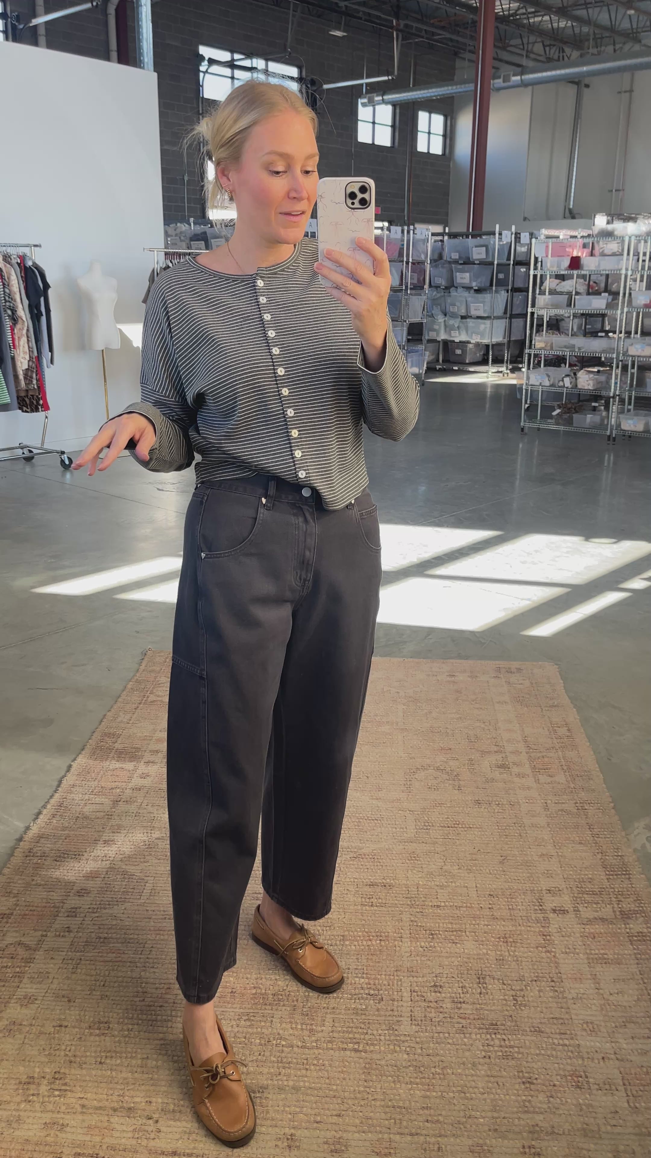 Details: Black denim subtle barrel jean style with cute split seam pocket detail and metal heart details