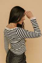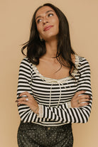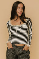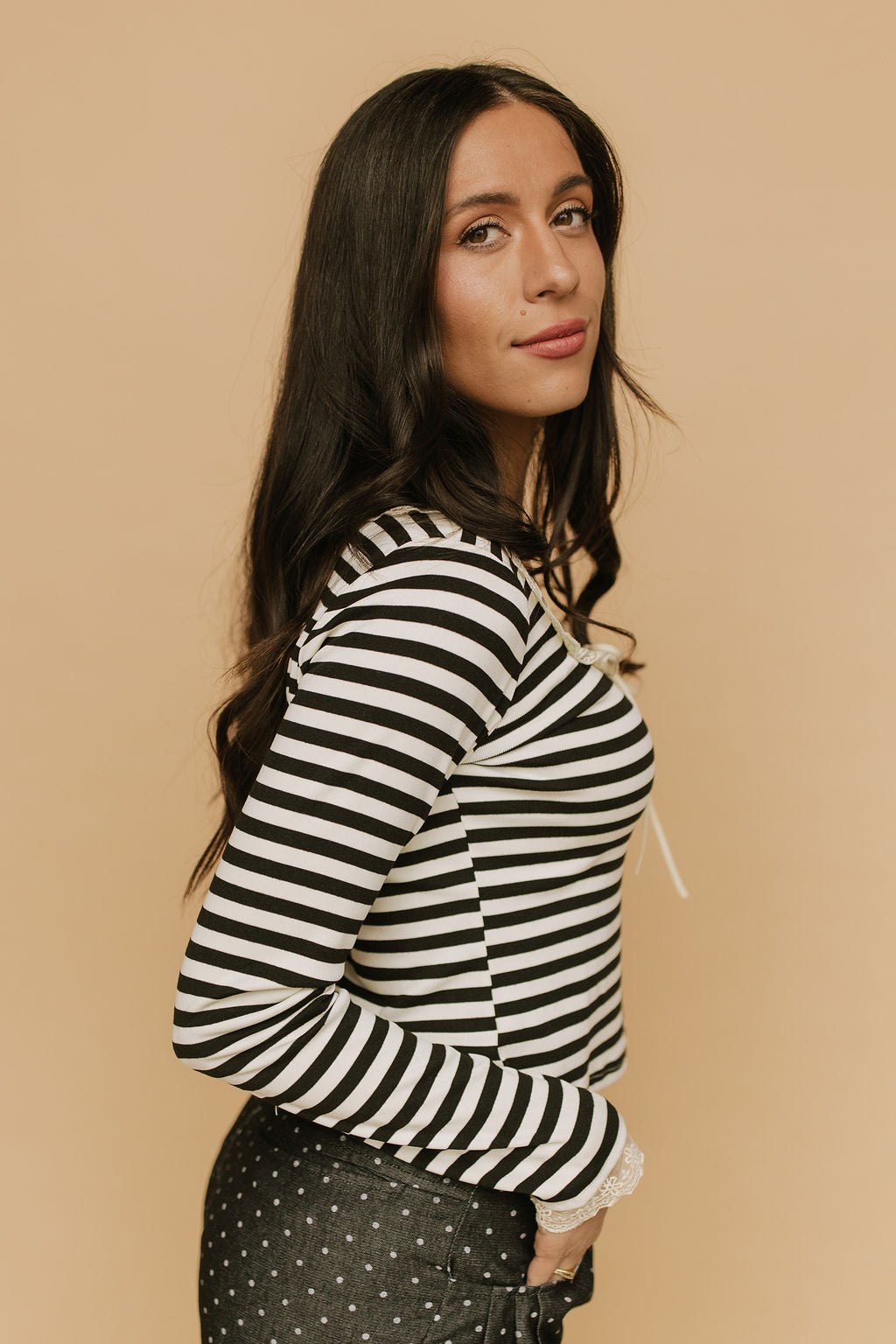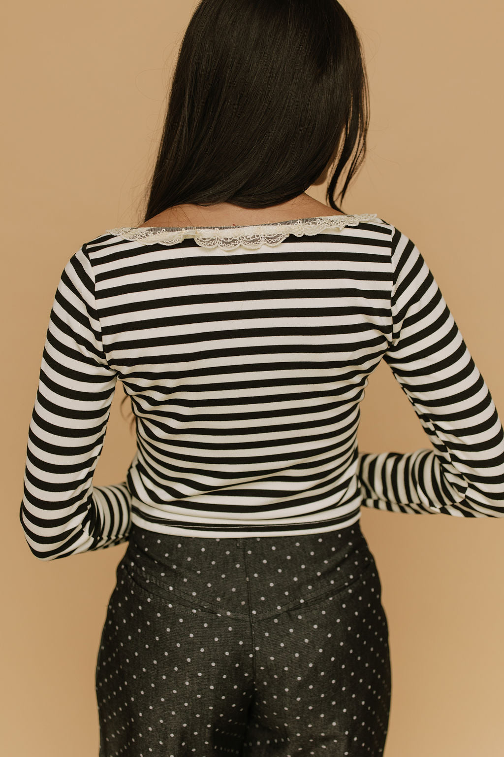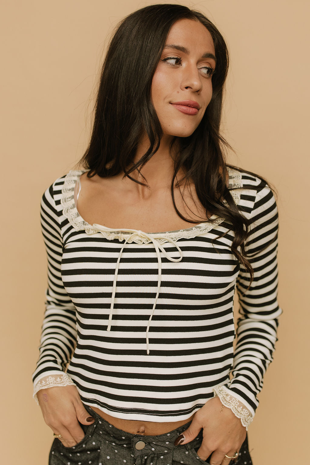 Details: Stretchy soft non-sheer stripe top with lace around neck and sleeves