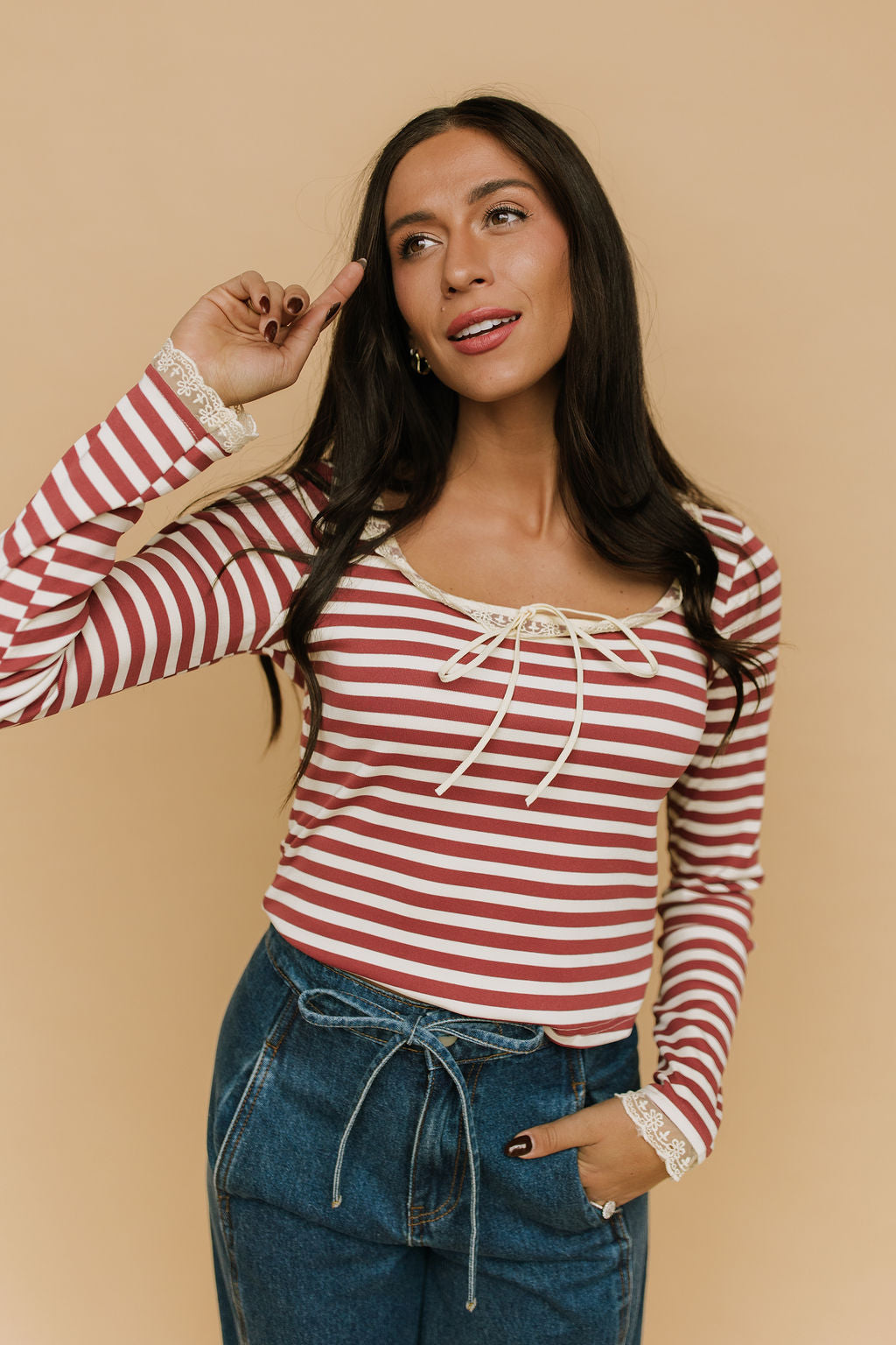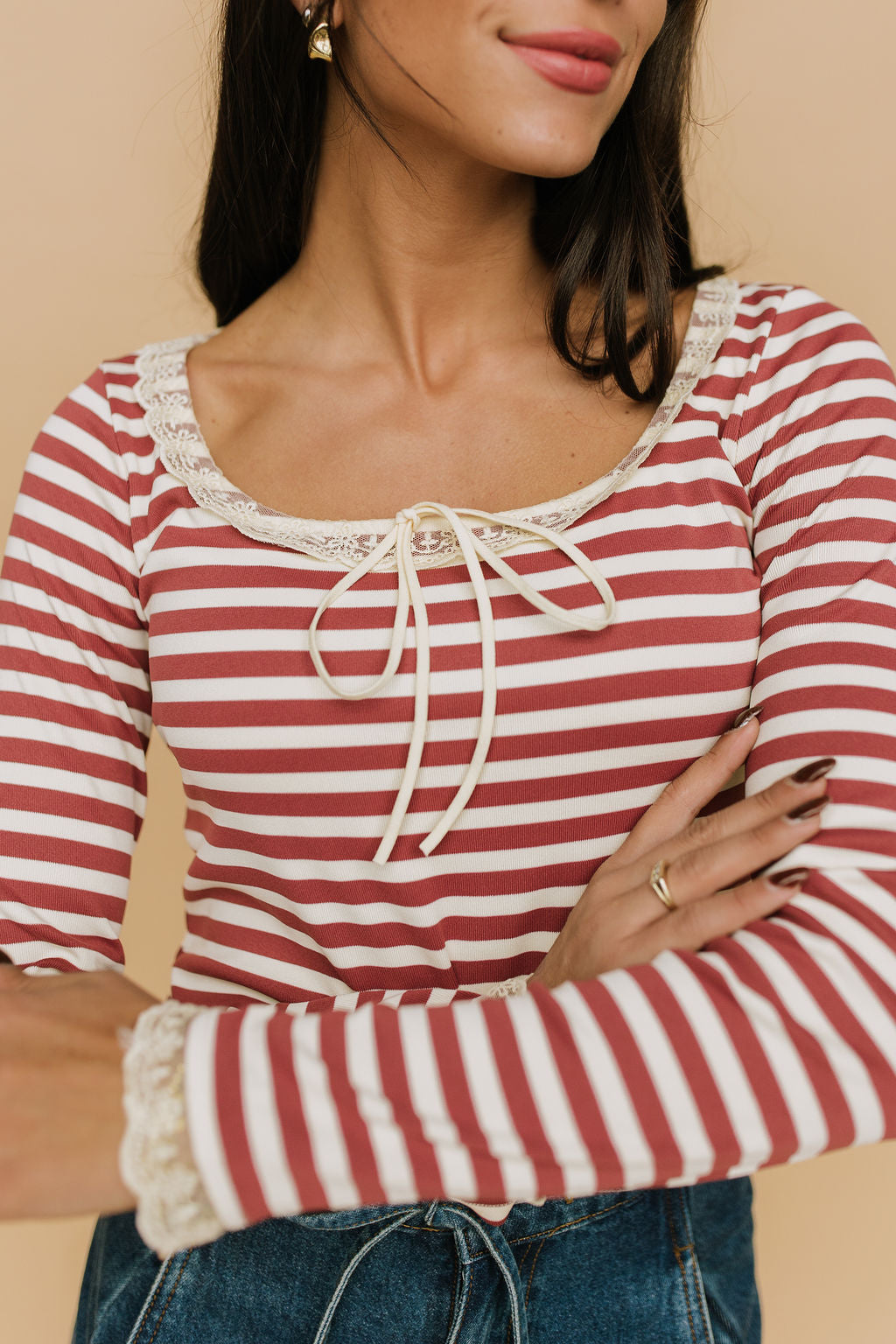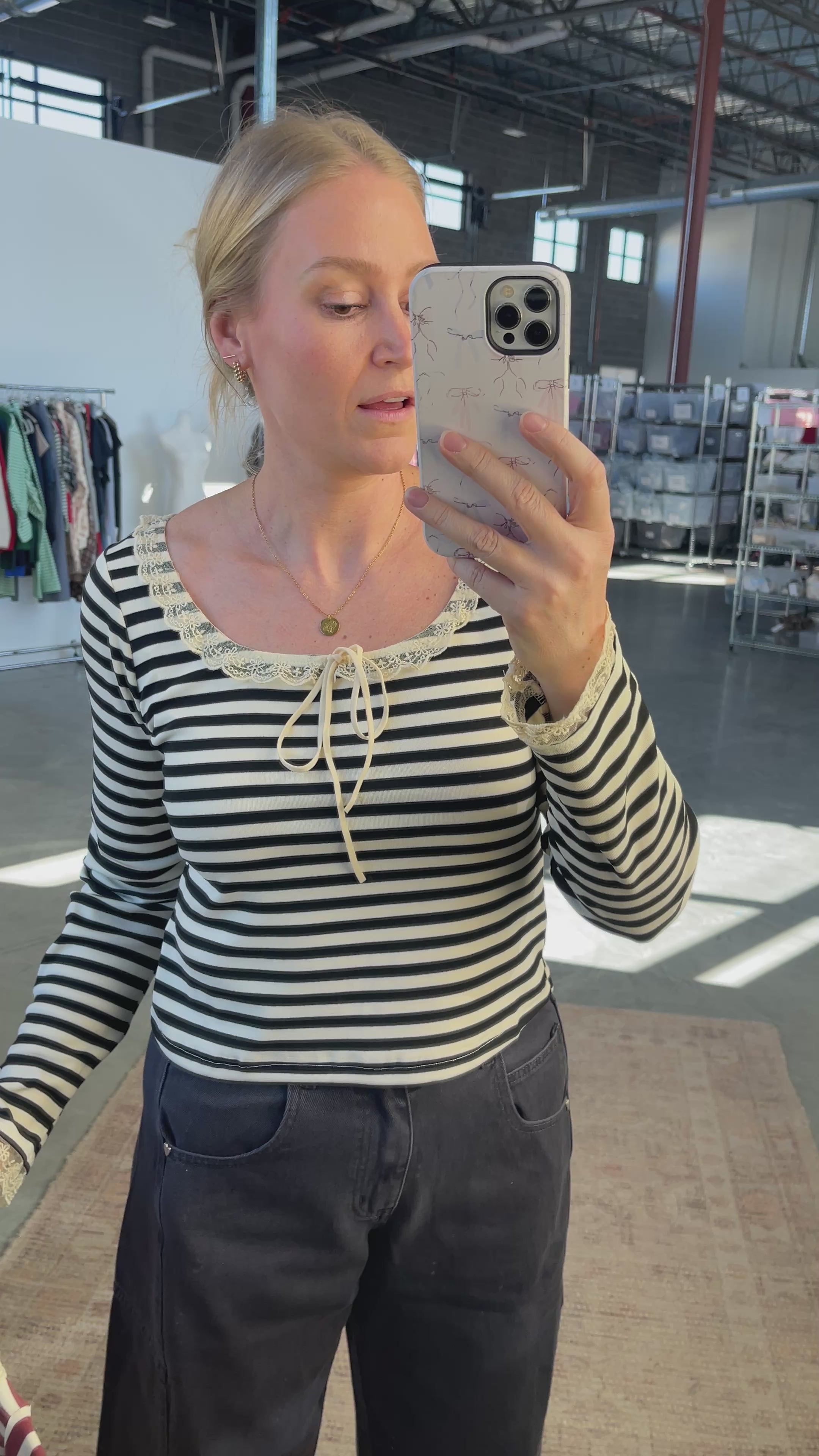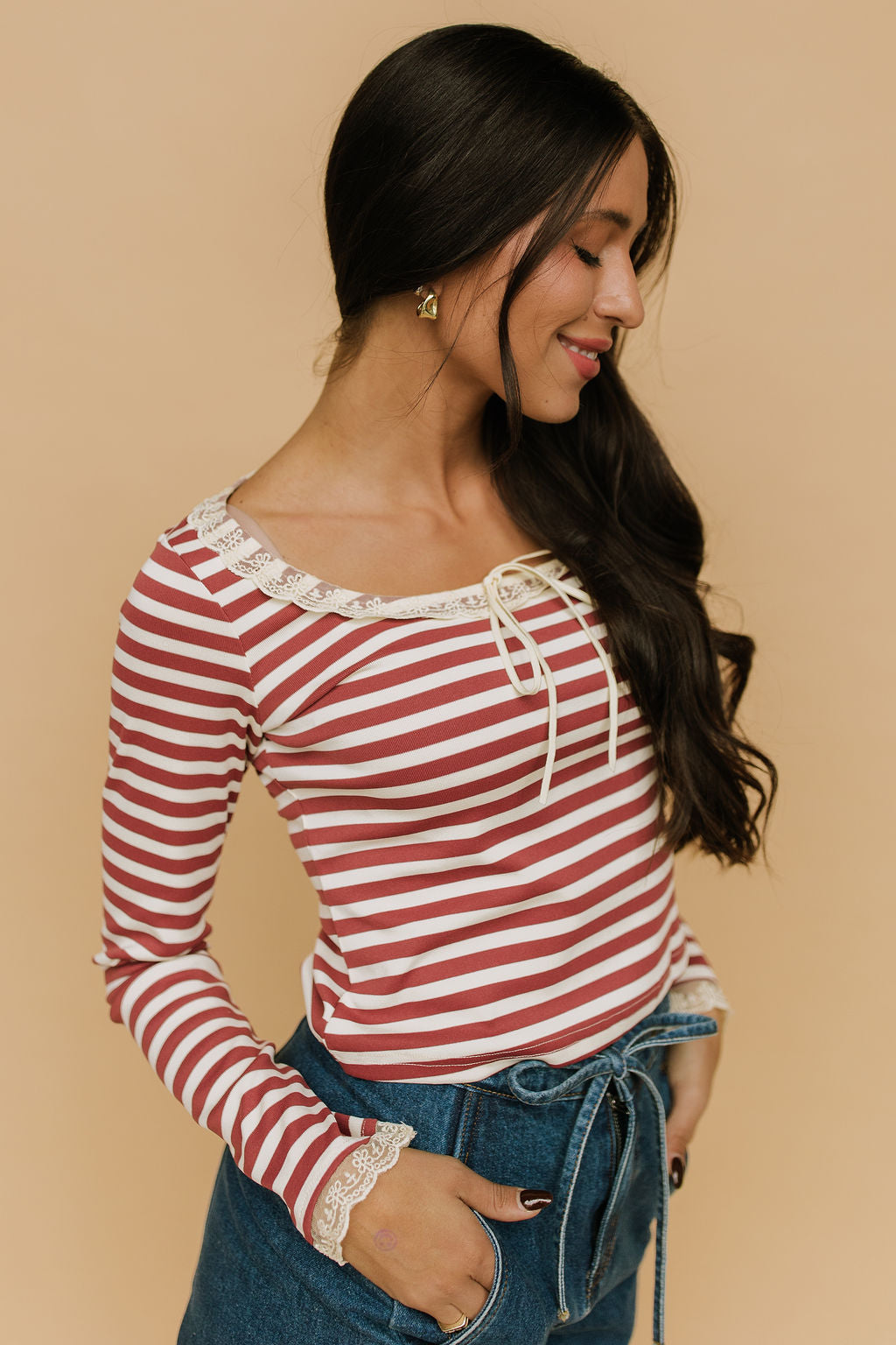 Details: Stretchy soft non-sheer stripe top with lace around neck and sleeves