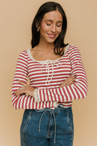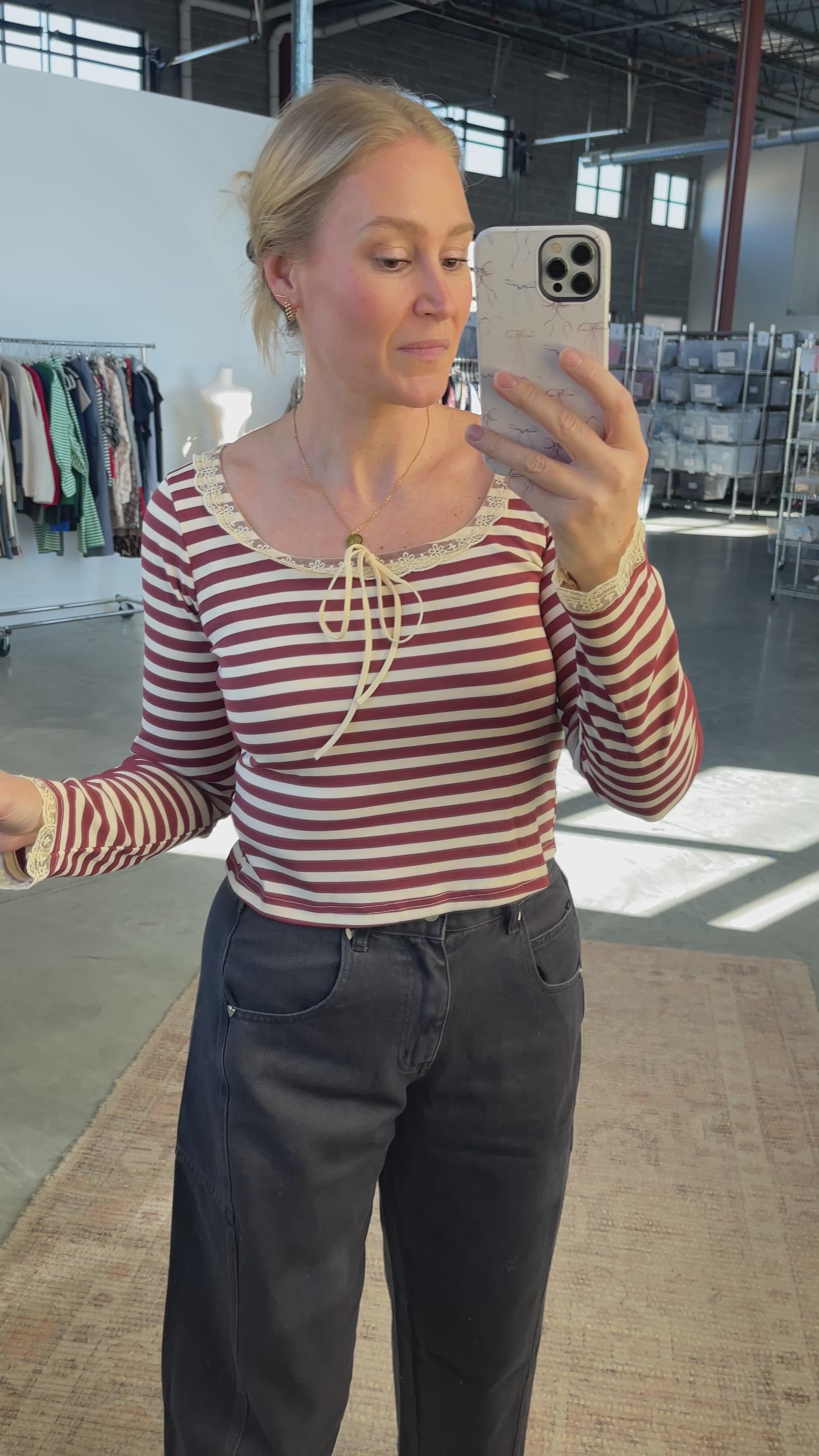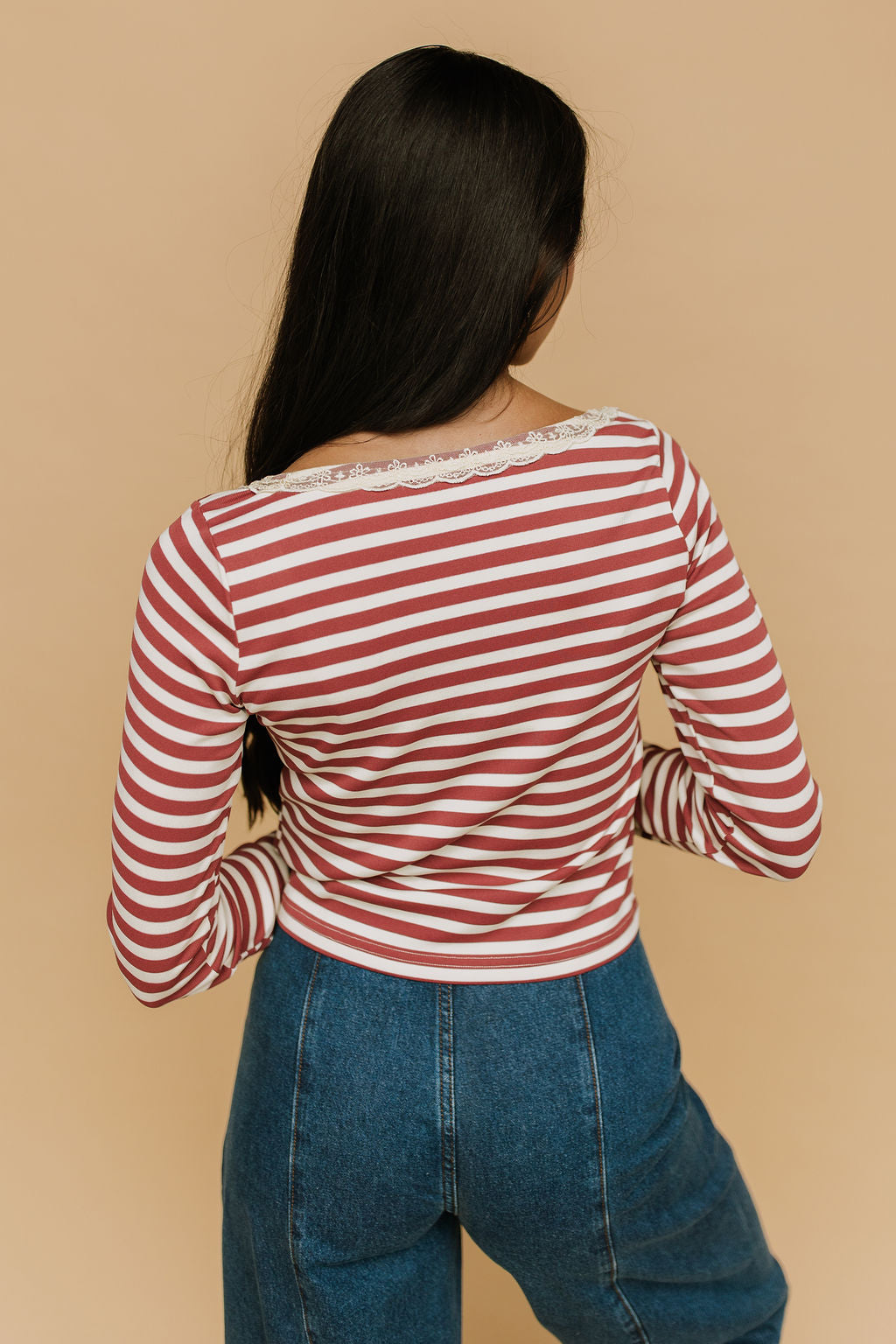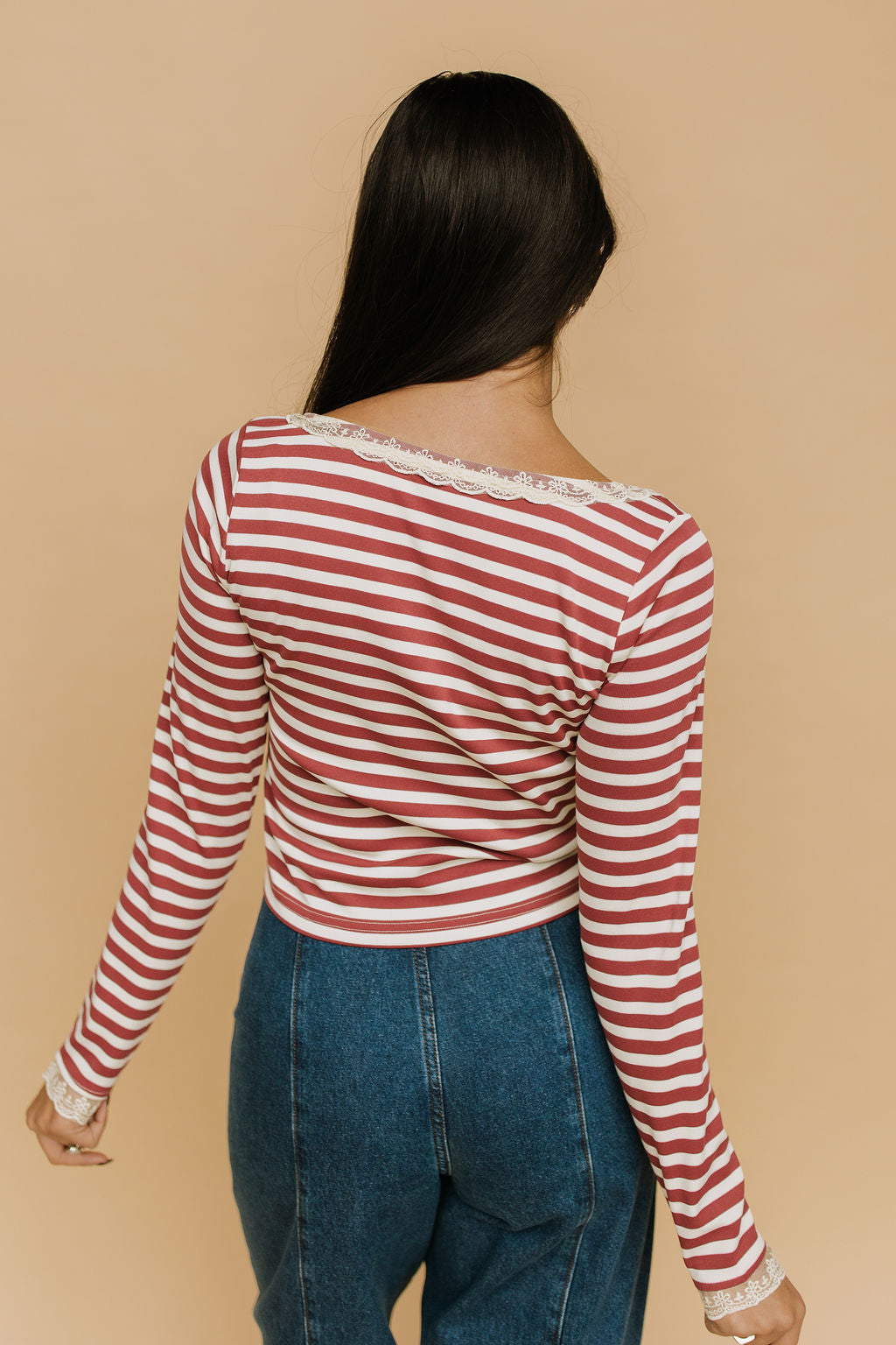 Details: Stretchy soft non-sheer stripe top with lace around neck and sleeves