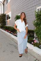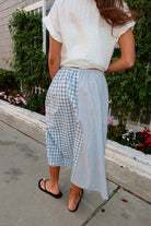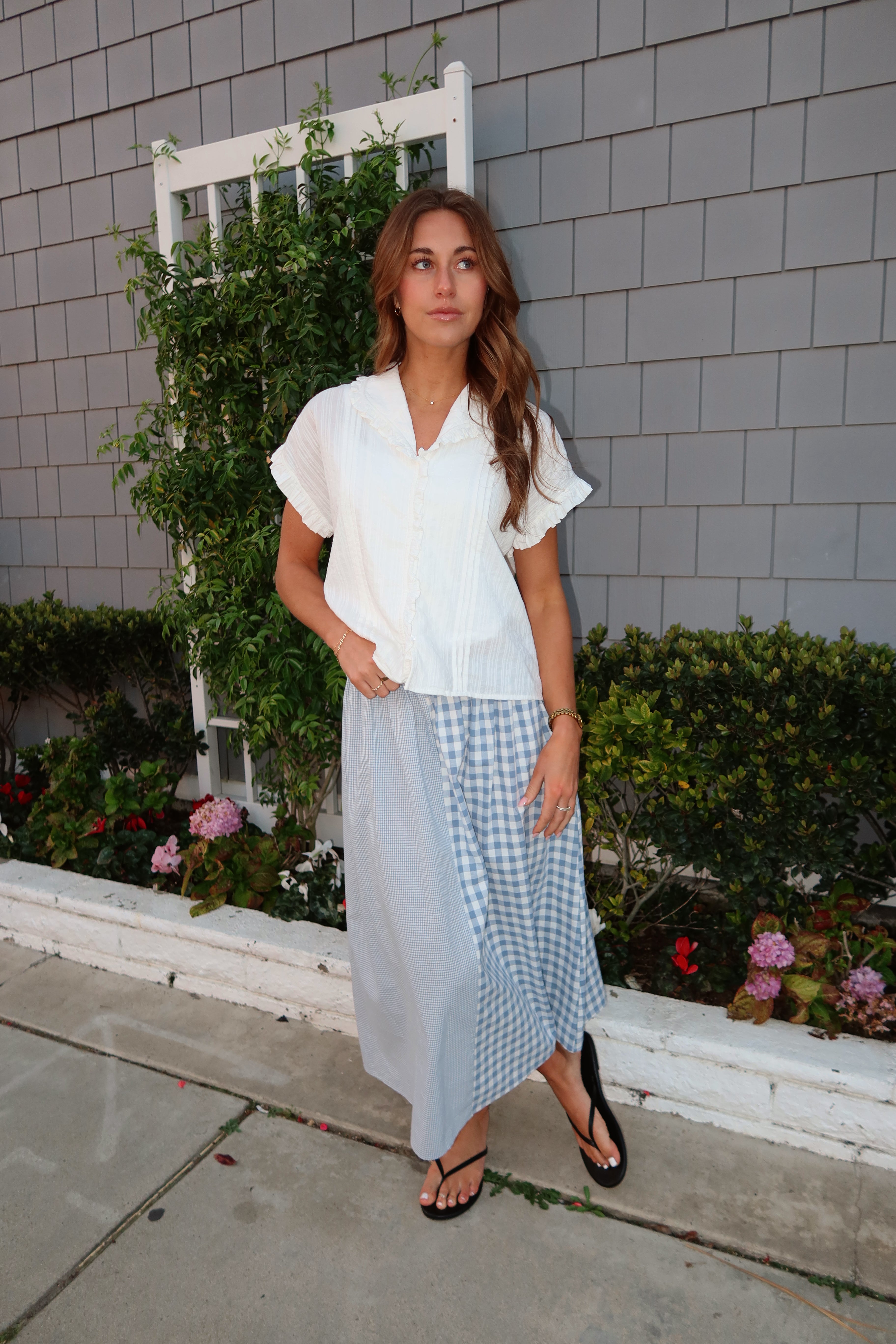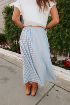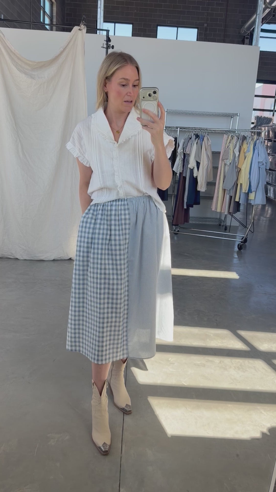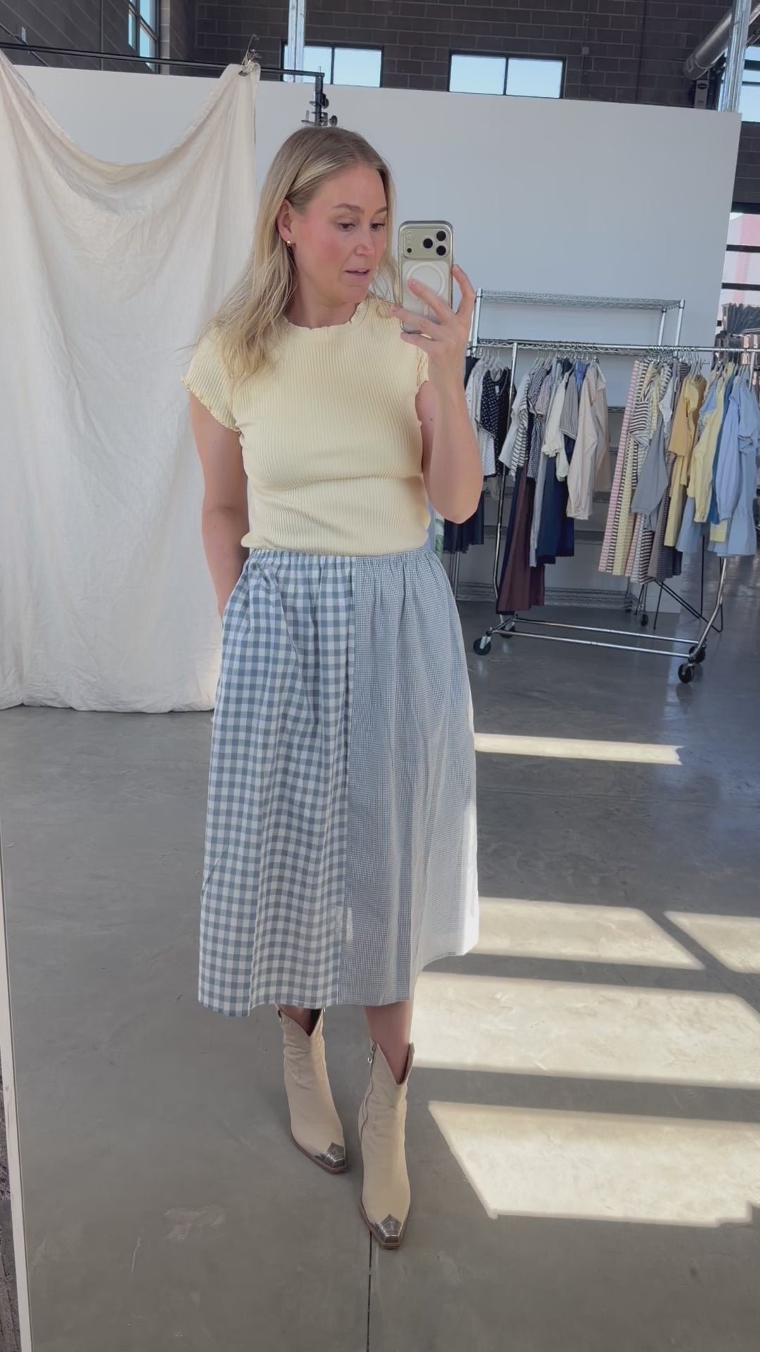 Main details: Blue gingham skirt. No lining. Lightweight! Soft thin elastic waistband. Plenty of room across hips, definitely runs big