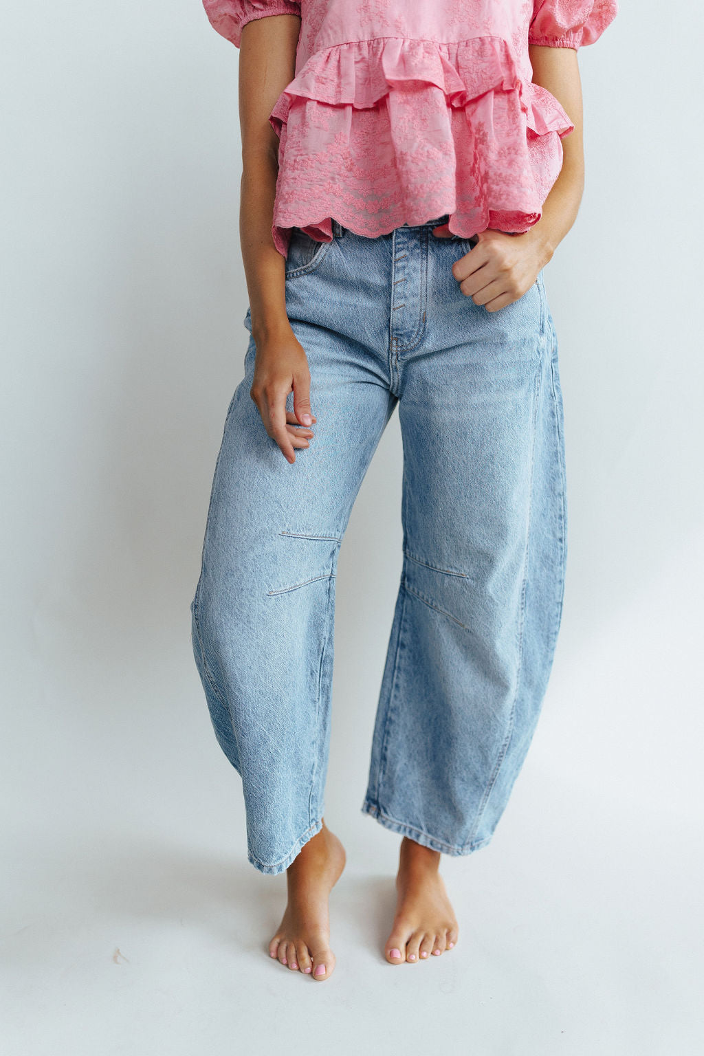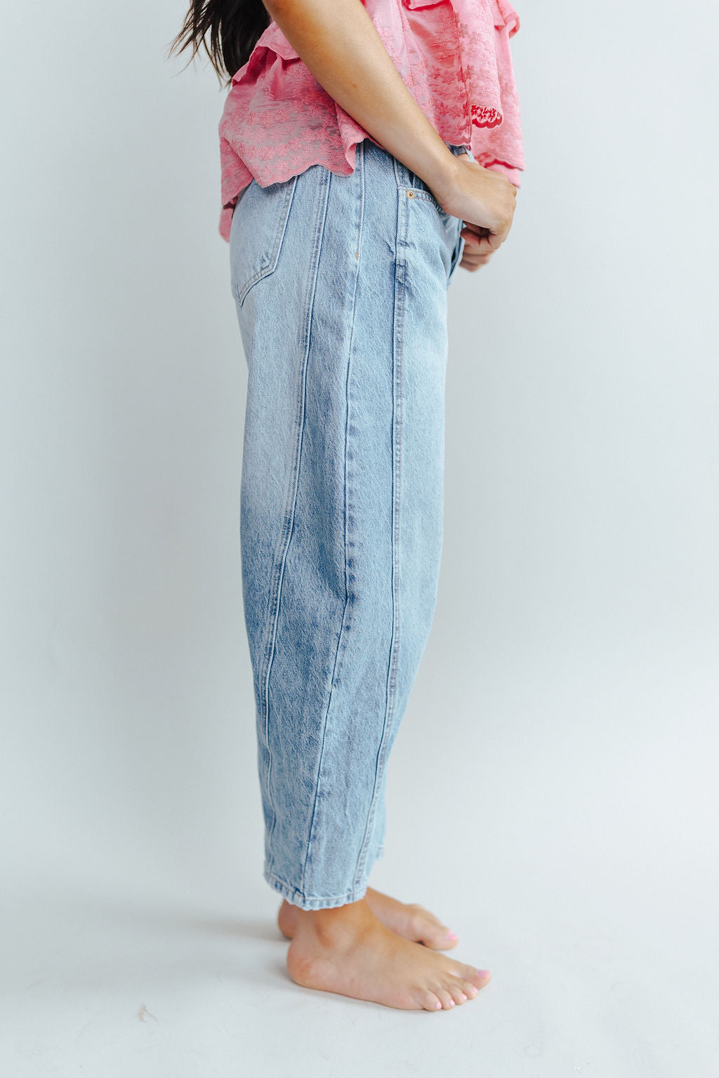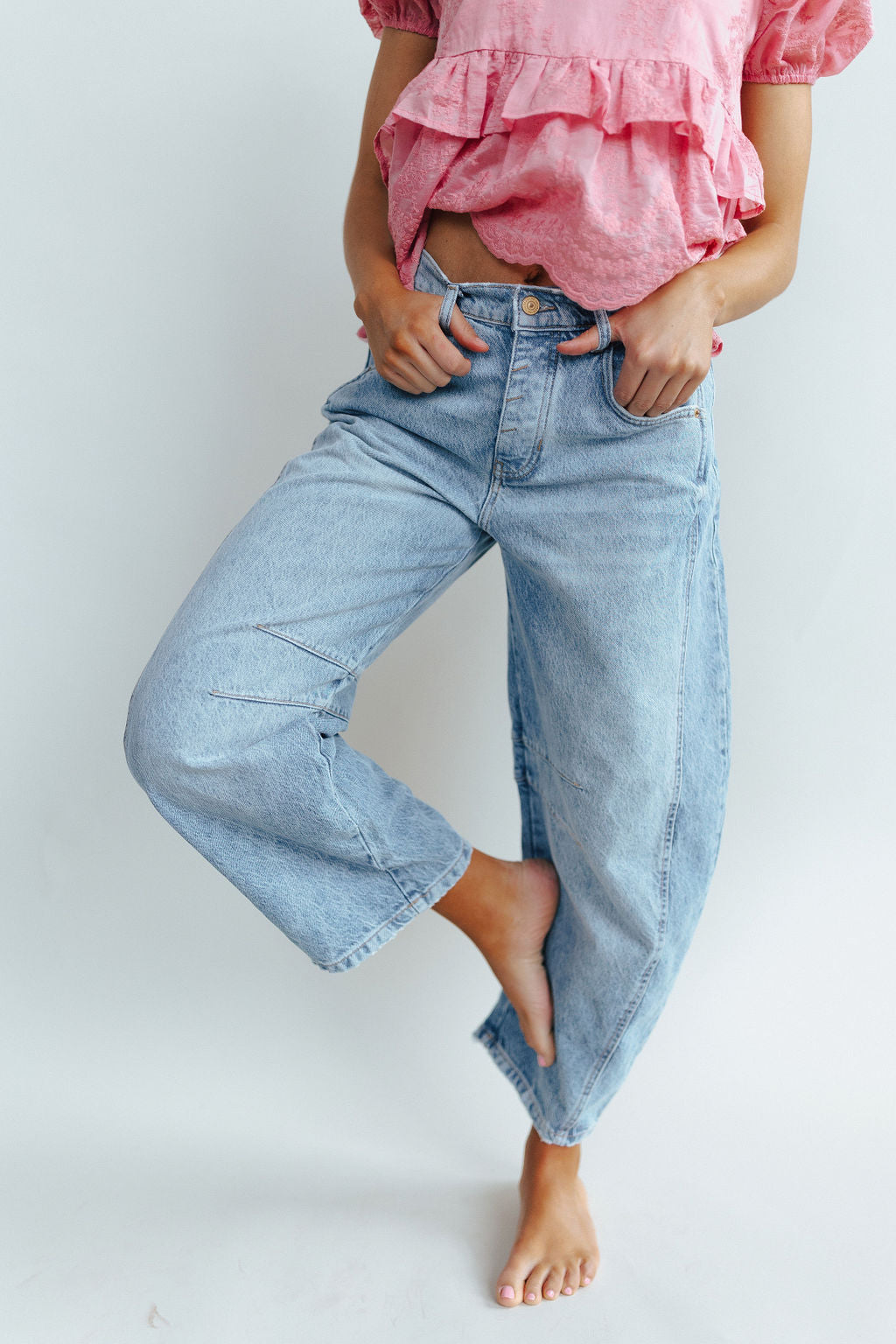 Free People Good Luck Mid-Rise Barrel Jeans in Ultra Light Beam