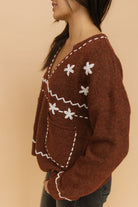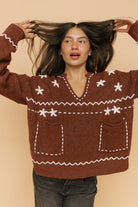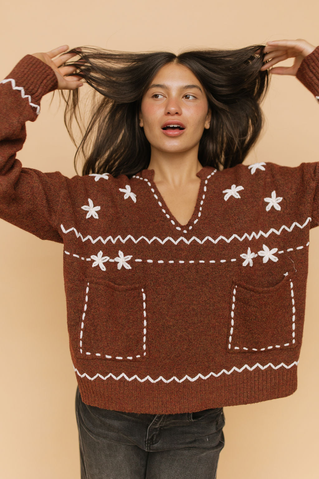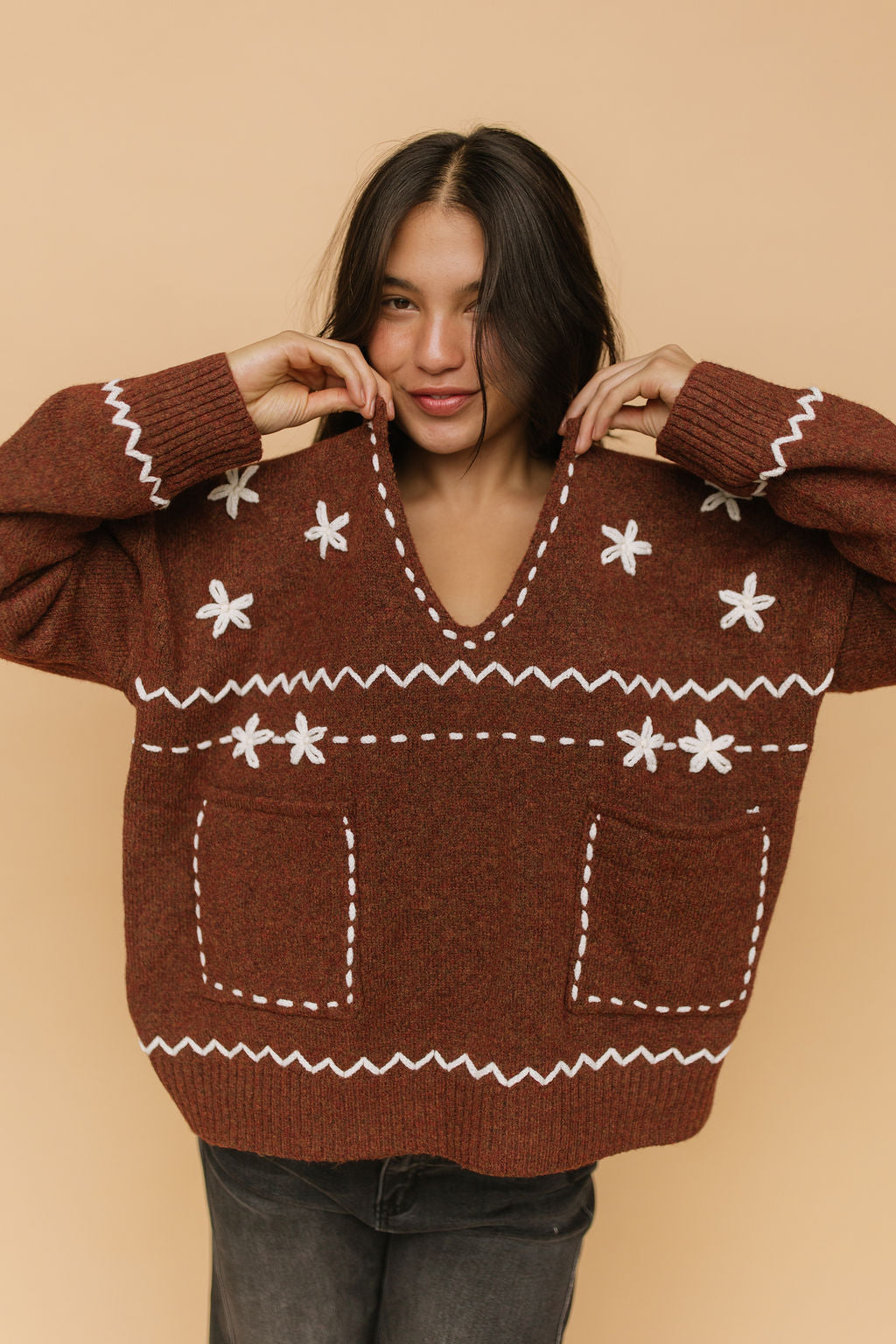 Details: Embroidered knit sweater with front pockets. V-neck
