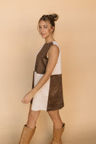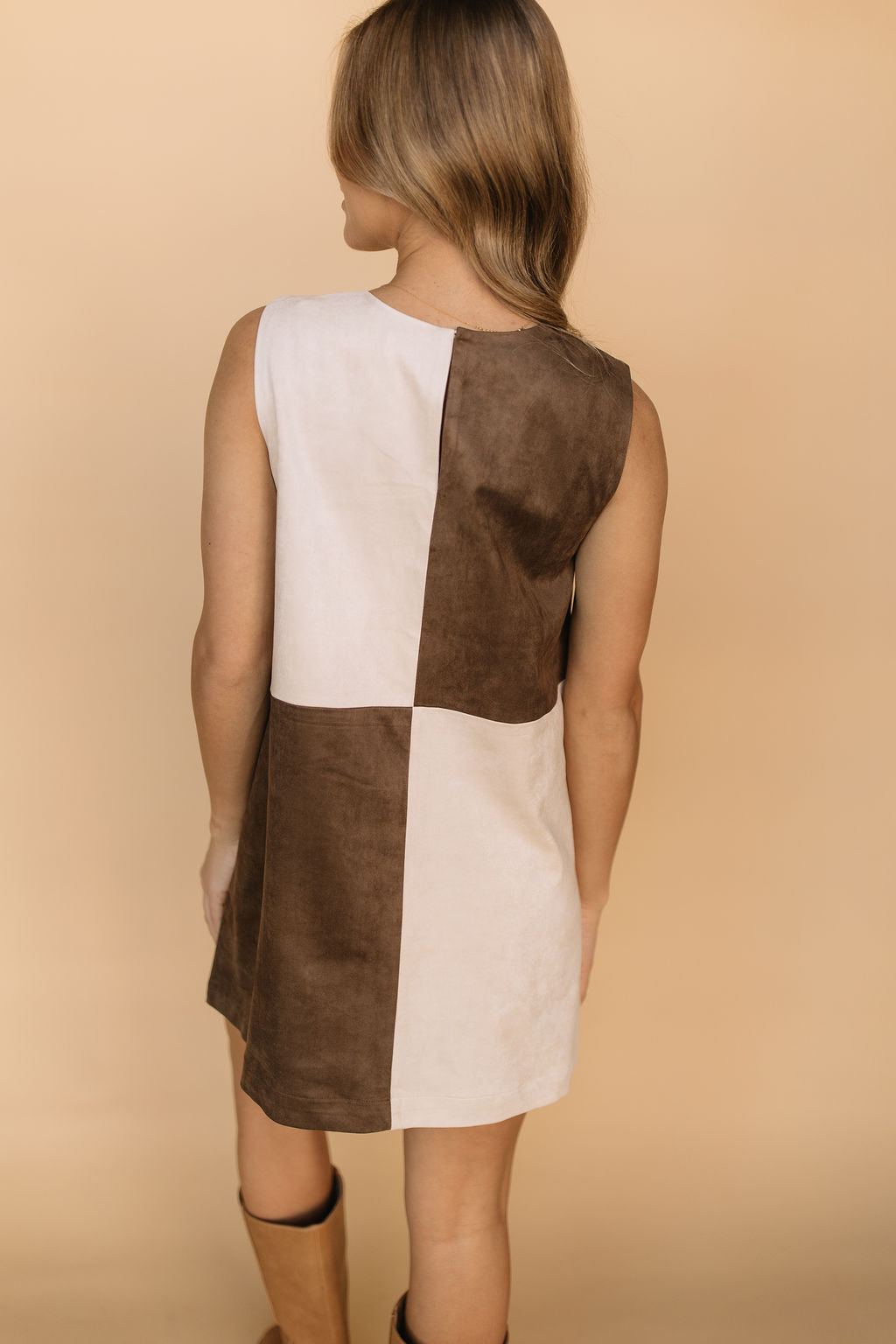 Main details: Suede colorblock brown & cream shift dress. Lined. Pockets